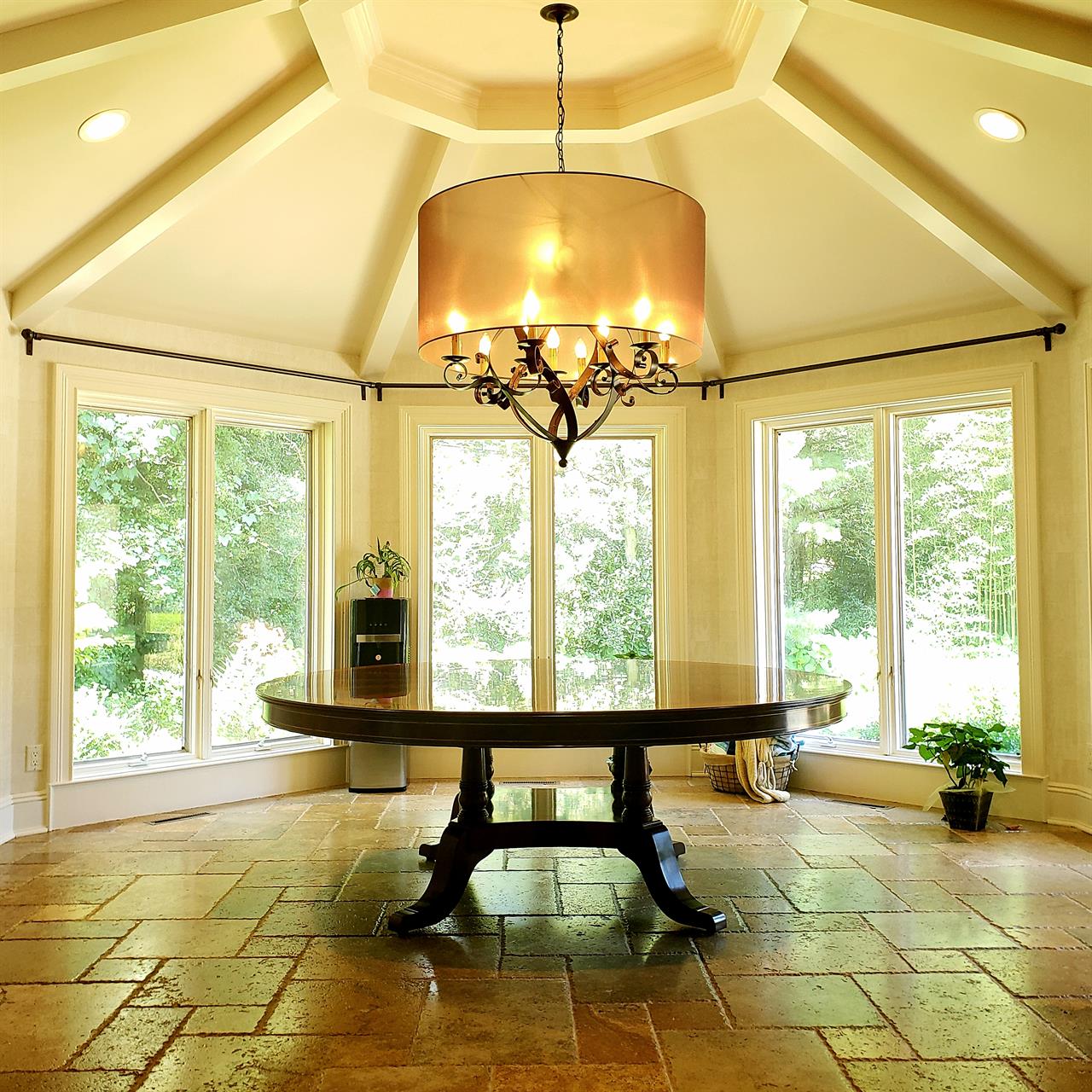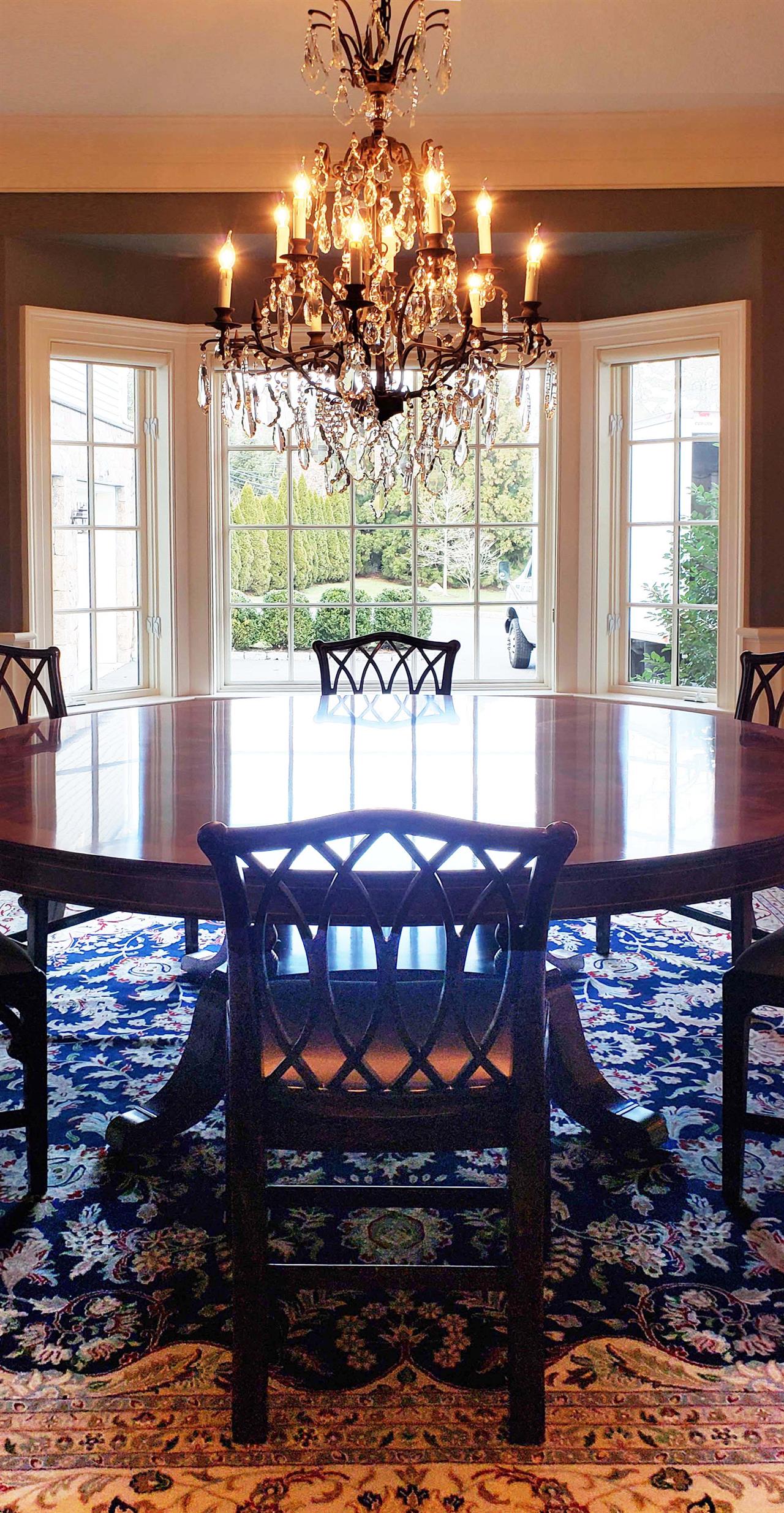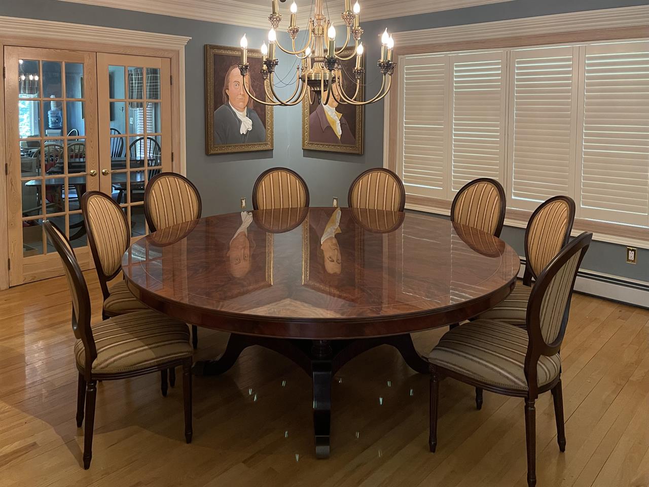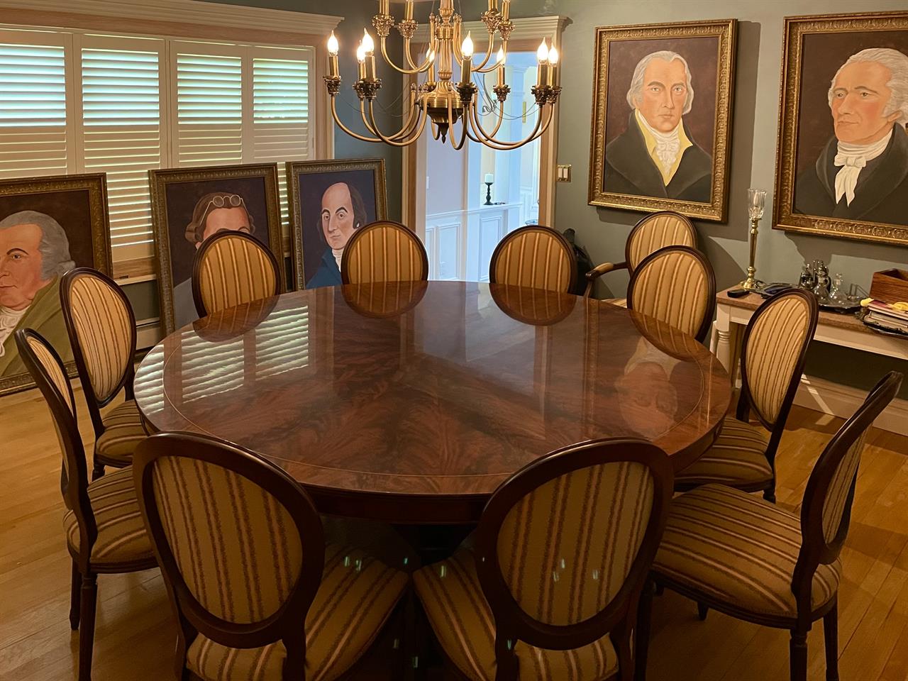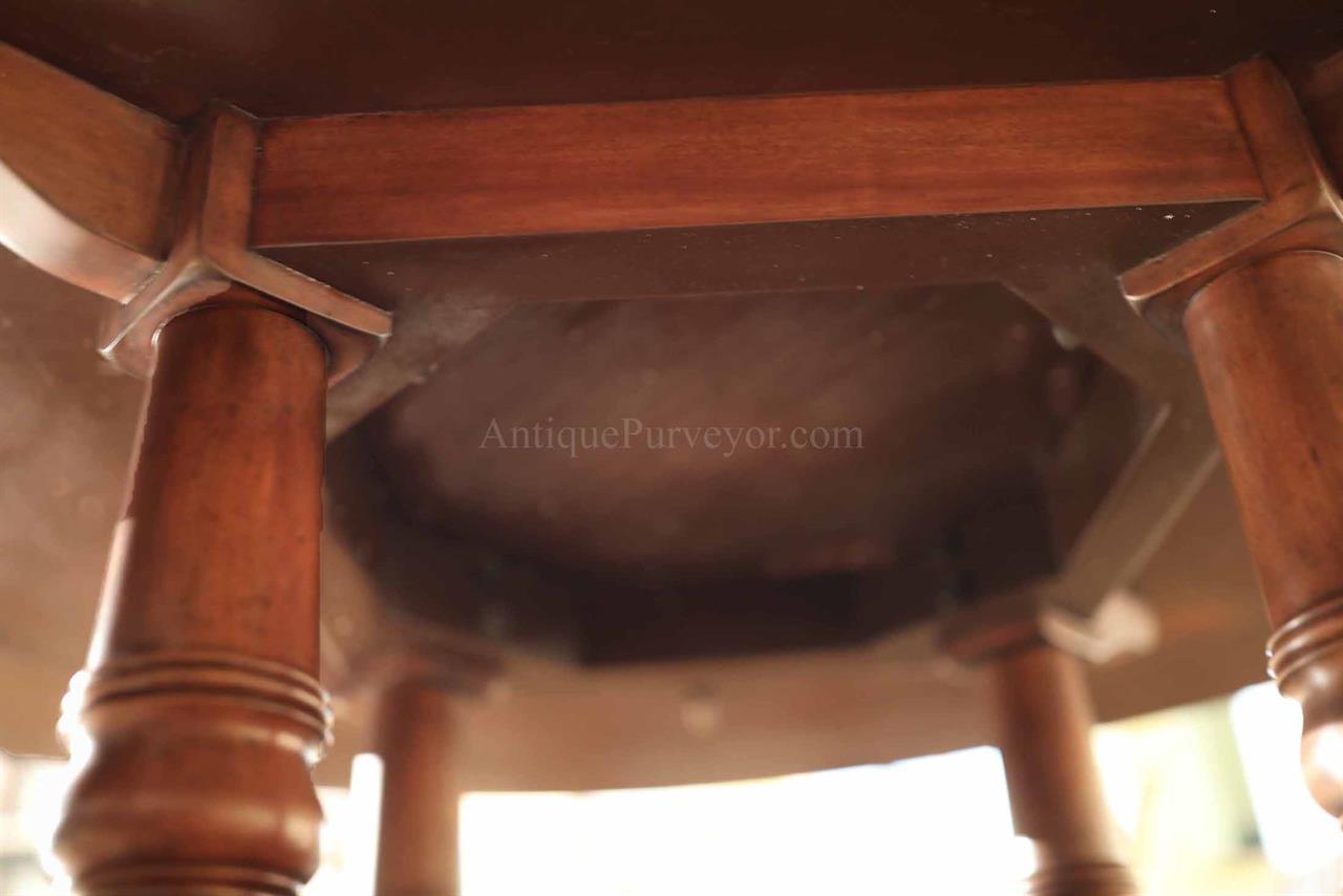 New designer grade one piece 84 inch round mahogany dining table on a wide and sturdy birdcage pedestal, an AP Exclusive by AntiquePurveyor.  This table is heavy and sturdy. The field is pie-cut flame mahogany and it is bordered with a toned down satinwood inlay.  The apron on this table is also flame mahogany and it is decorated with two white pinstripes typicaly seen on18th century furniture.  This table is part of our Custom Fit Classic collection and we offer this style table in many different sizes so if this table is to big we can provide you with something smaller.  The table will comfortably seat 10 people.  The feet are capped with a custom forged tarnished brass end caps and they are fitted with solid brass levels.  This table is fit for a magestic estate or a luzury hotel foyer, its quality is second to none.  The table is built with top and bottom faces unlike most 84 inch round tables that are just decorated with an apron this table will not warp or sag and it was engineered to last many generations.  We are proud to offer this table at an amazing price point, it is our own design, we buy quantity and we import them direcly to our cost effective warehouse.  The Veneers on this table were bathed and rinsed in a proprietary solution which relaxes the grain and clears the Veneers of oil and tannins. After the Veneers are rinsed and cleaned they are ironed flat and finally pressed into a pie-cut decorated top.  This cleaning process greatly reduces the chances of checking and crazing over time.  The finish is a razor thin 4mil lacquer finish which will show open woodgrain upon close inspection but the open grain disappears when you walk around the table and admire it from a normal distance.  This razor thin finish also helps reduce any chance of crazing and cracking as it ages in your home as it will flex as the wood moves with humidity changes.