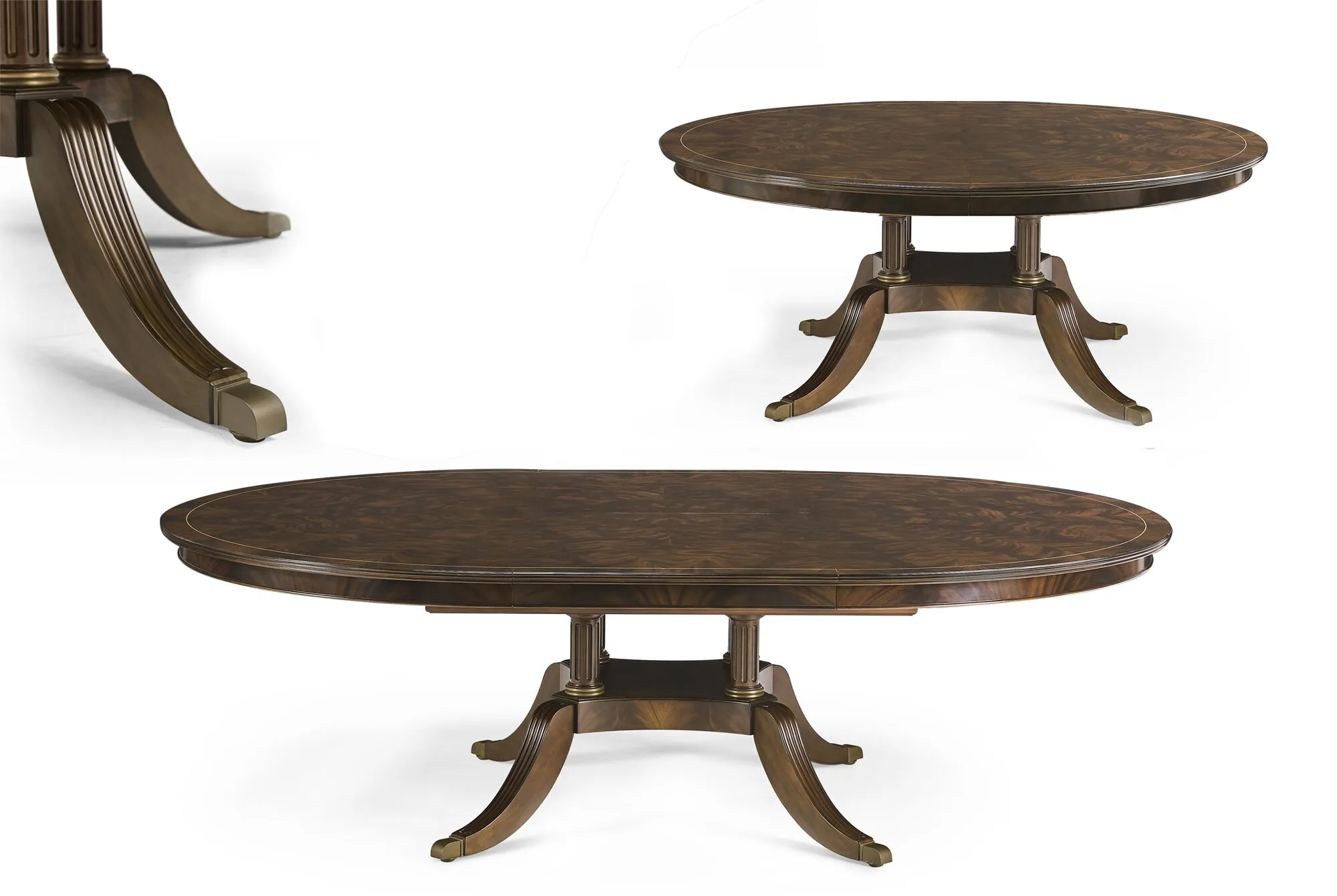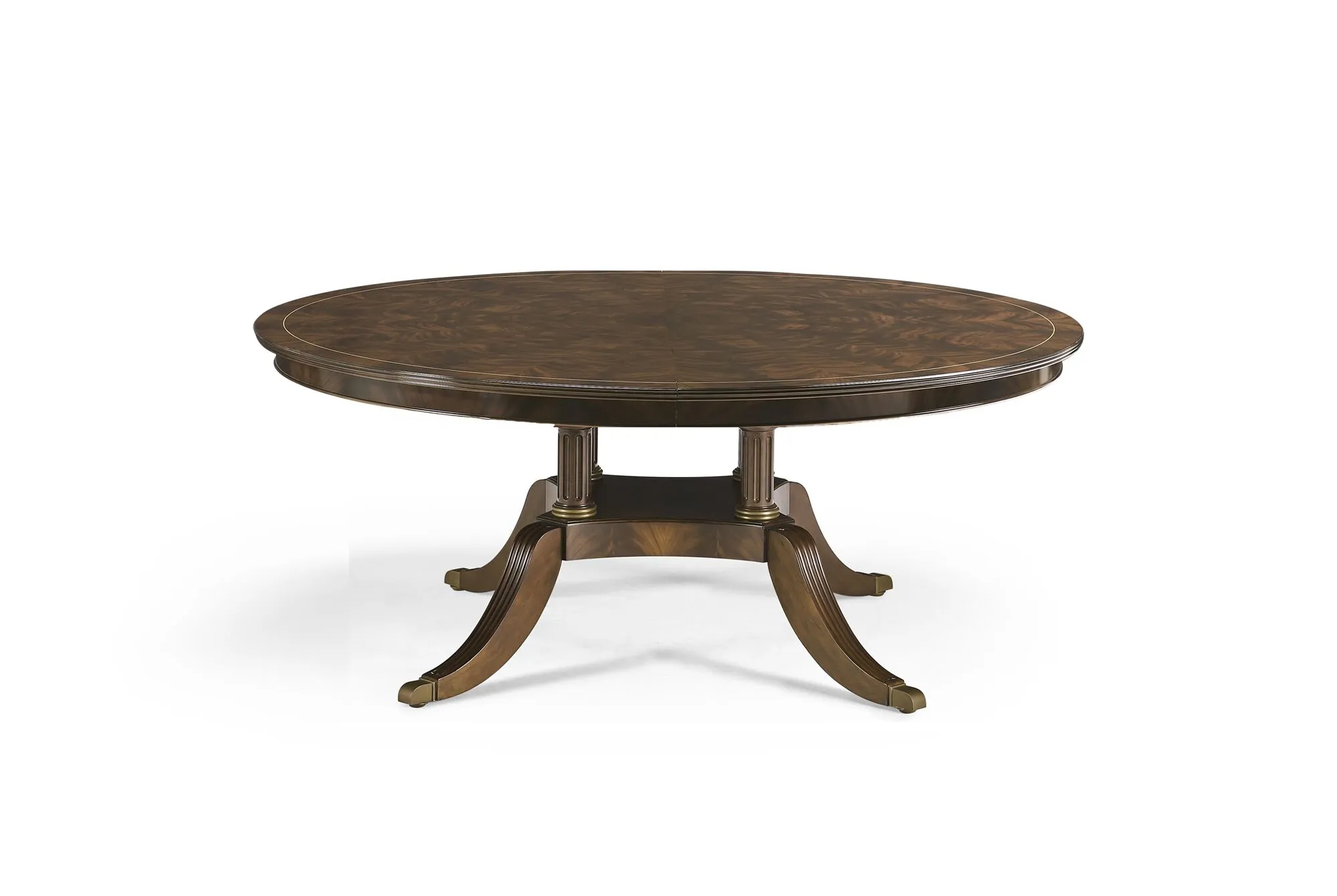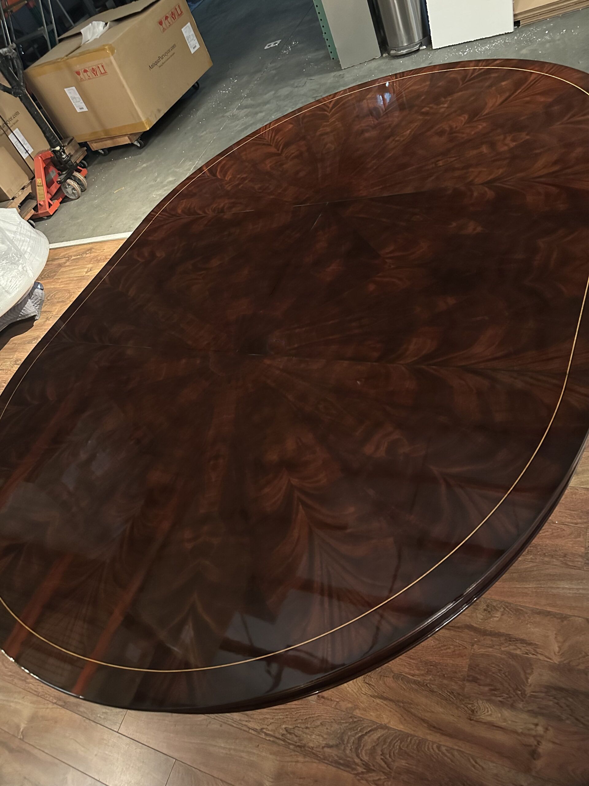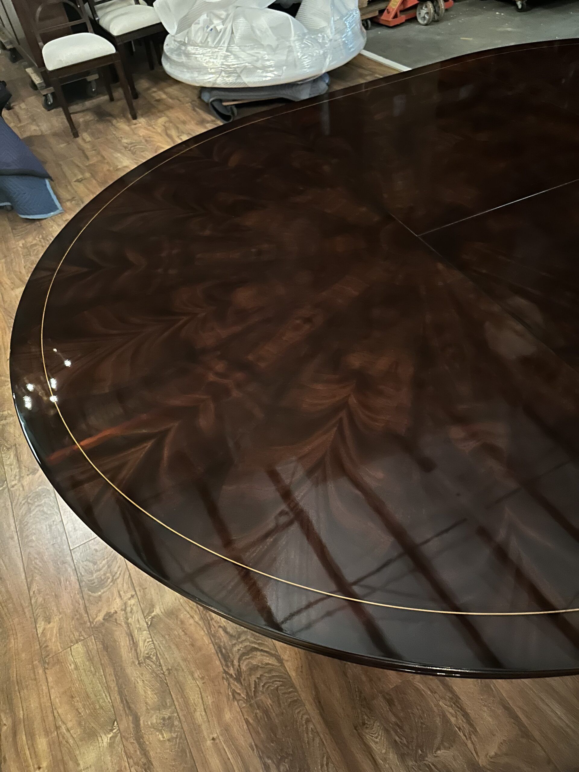72″-100″ Round to oval mahogany dining room pedestal table. This pedestal table has a 28″ self-storing butterfly leaf and it stands sturdy on an over-built steel-reinforced saber leg pedestal with solid brass-capped feet and heavy levelers. It is a heavy sturdy table. The tabletop is decorated with a pie-cut flame mahogany field and a sunburst inlaid leaf with fine black & white inlay. This table has a modern dark brown walnut finish, which is best described as rich espresso bean brown. The table features a hand-polished, razor-thin transparent nitrocellulose finish, which magnifies the flame mahogany grain. This table was manufactured exclusively for our online store, and it is part of our AP Exclusives furniture brand. This is a designer-grade dining table of exceptional quality. Measurements: 72 inches round and 100 inches opened with a 28-inch leaf, 30 inches high. Floor to apron clearance, 26 3/4