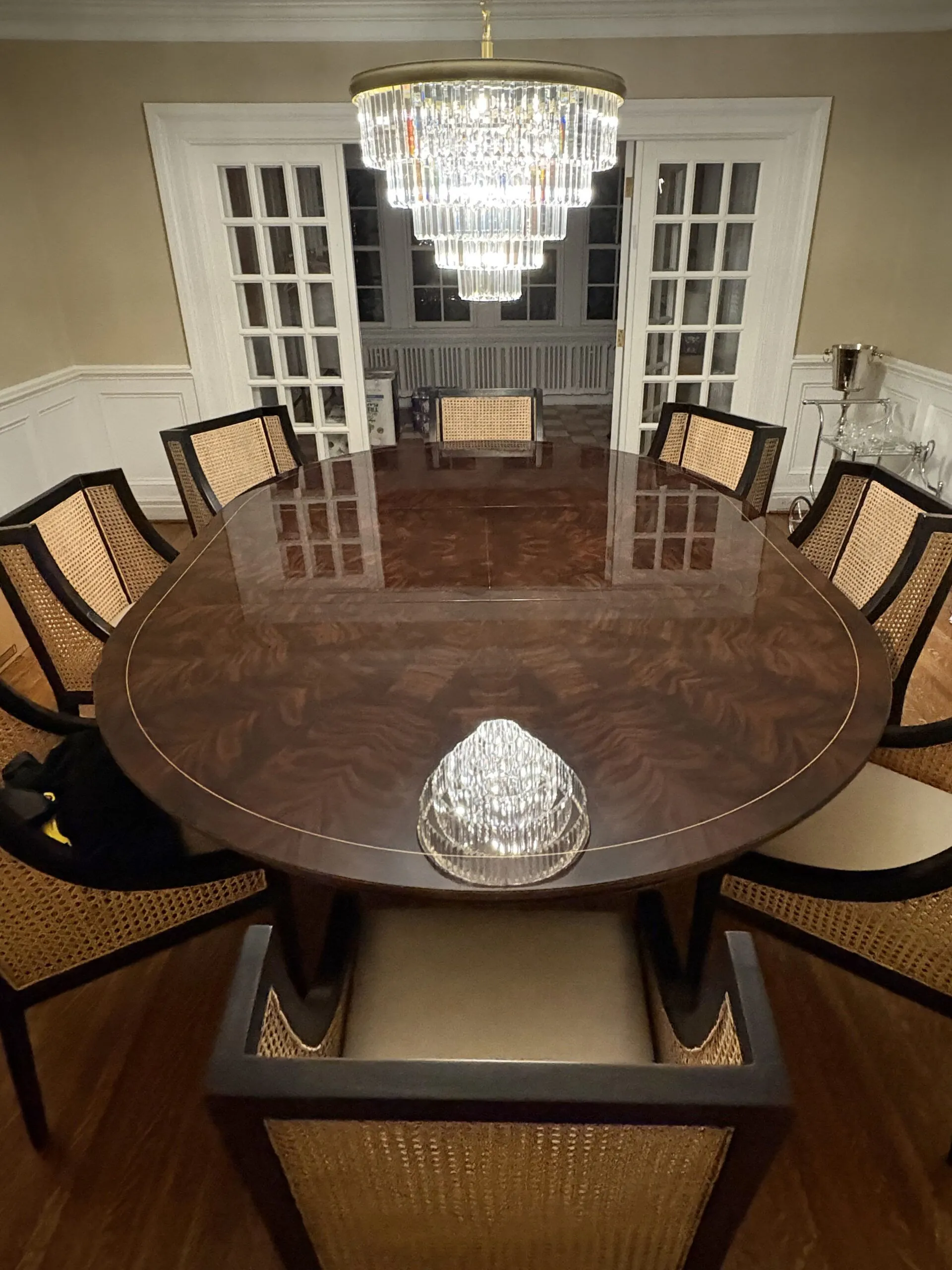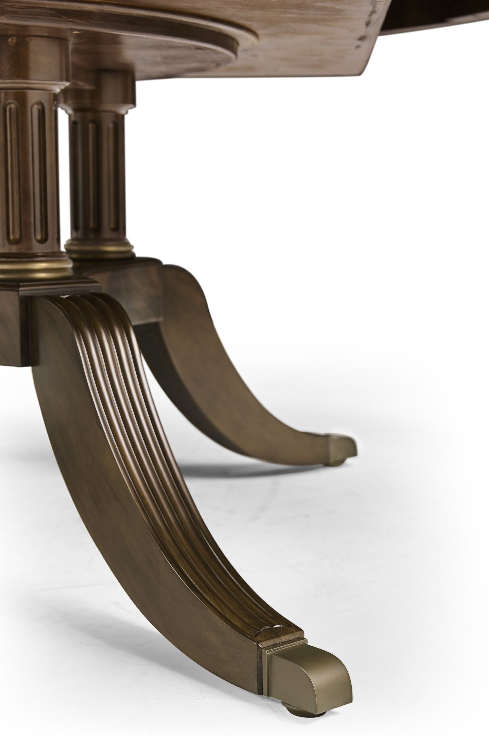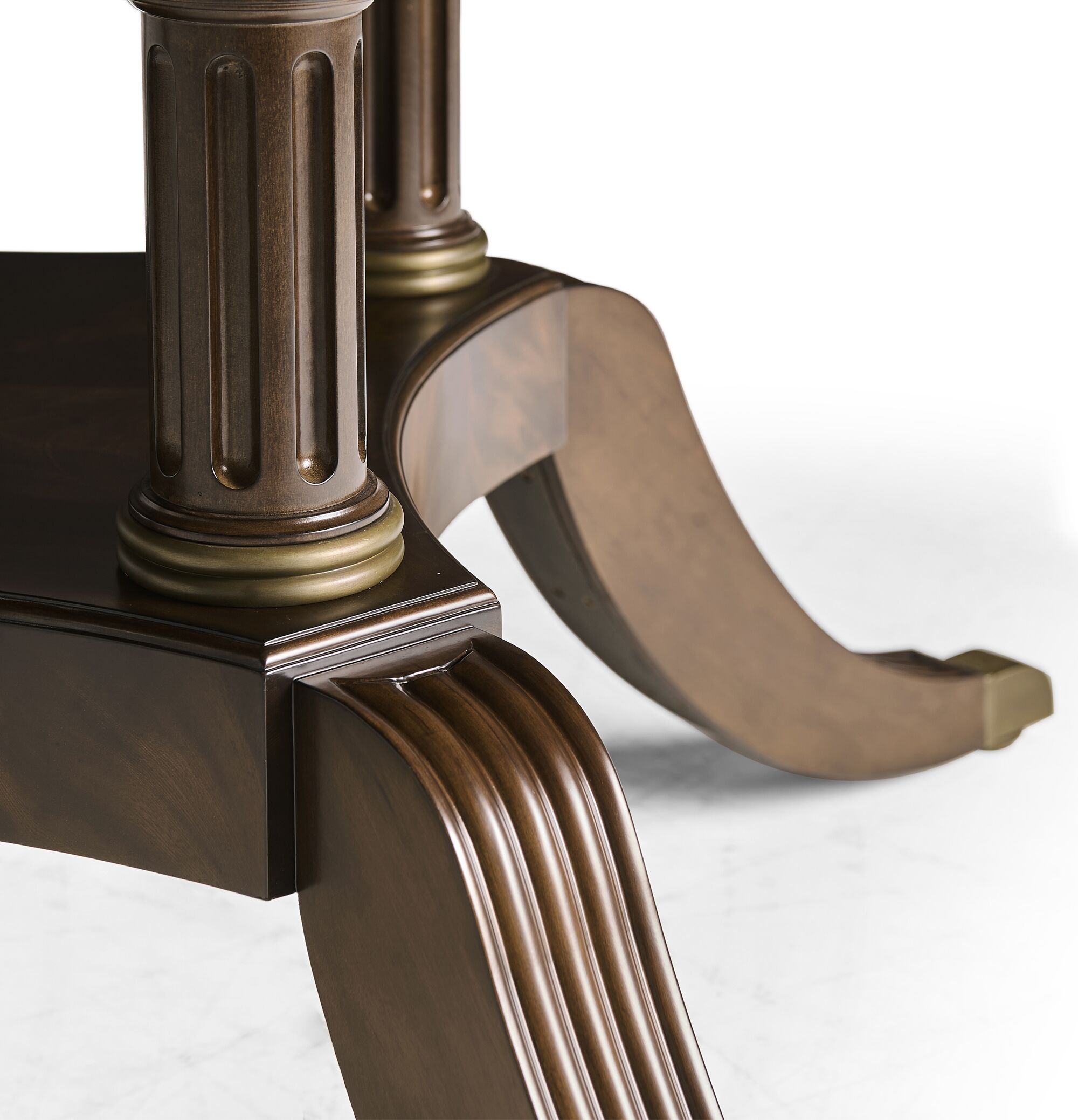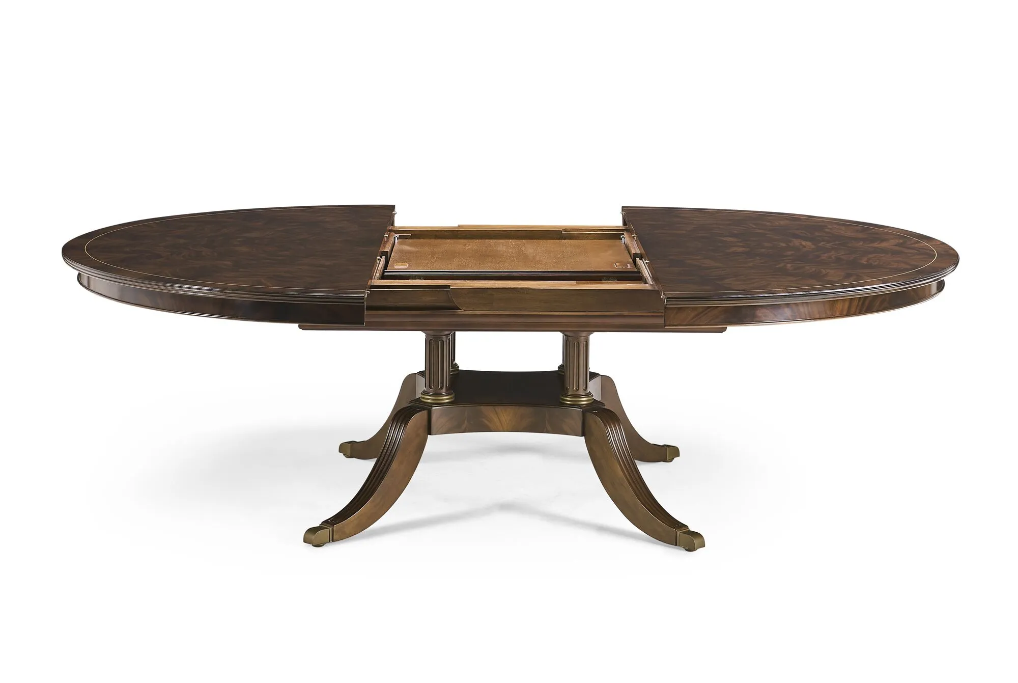 72″-100″ Round to oval mahogany dining room pedestal table. This pedestal table has a 28″ self-storing butterfly leaf and it stands sturdy on an over-built steel-reinforced saber leg pedestal with solid brass-capped feet and heavy levelers. It is a heavy sturdy table. The tabletop is decorated with a pie-cut flame mahogany field and a sunburst inlaid leaf with fine black & white inlay. This table has a modern dark brown walnut finish, which is best described as rich espresso bean brown. The table features a hand-polished, razor-thin transparent nitrocellulose finish, which magnifies the flame mahogany grain. This table was manufactured exclusively for our online store, and it is part of our AP Exclusives furniture brand. This is a designer-grade dining table of exceptional quality. Measurements: 72 inches round and 100 inches opened with a 28-inch leaf, 30 inches high. Floor to apron clearance, 26 3/4