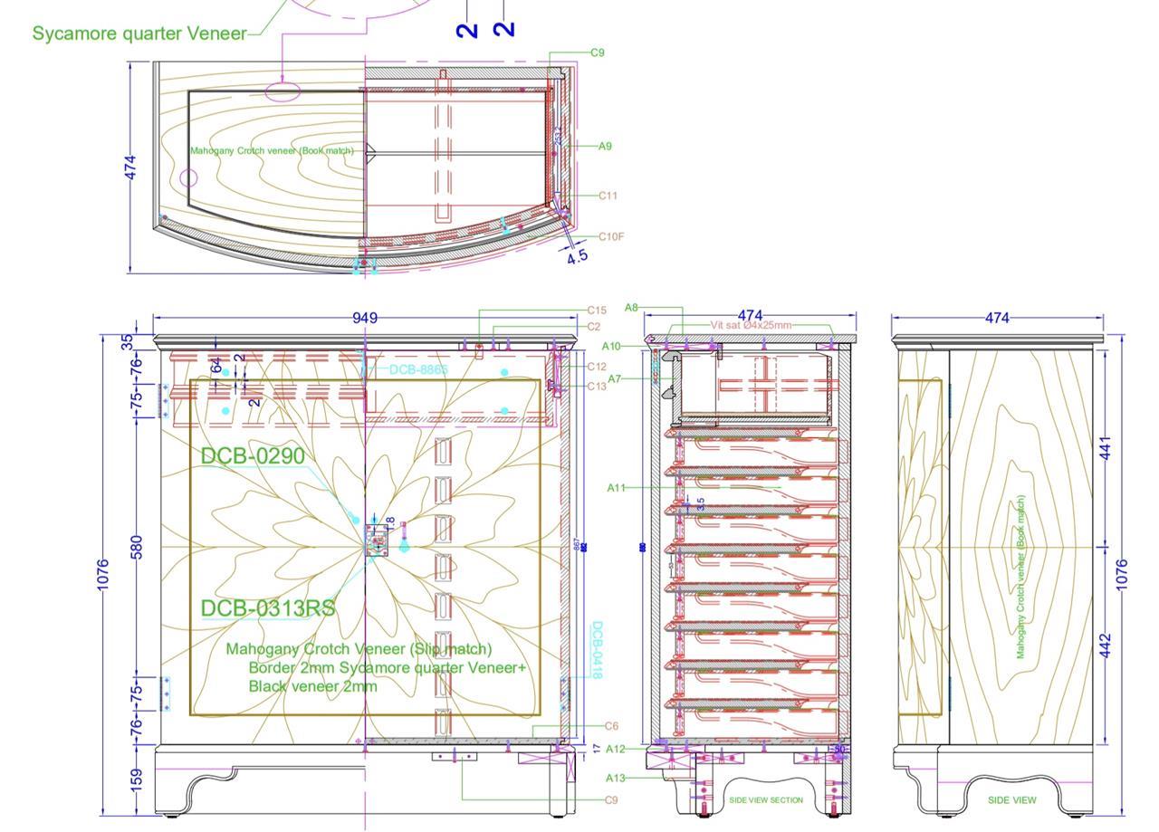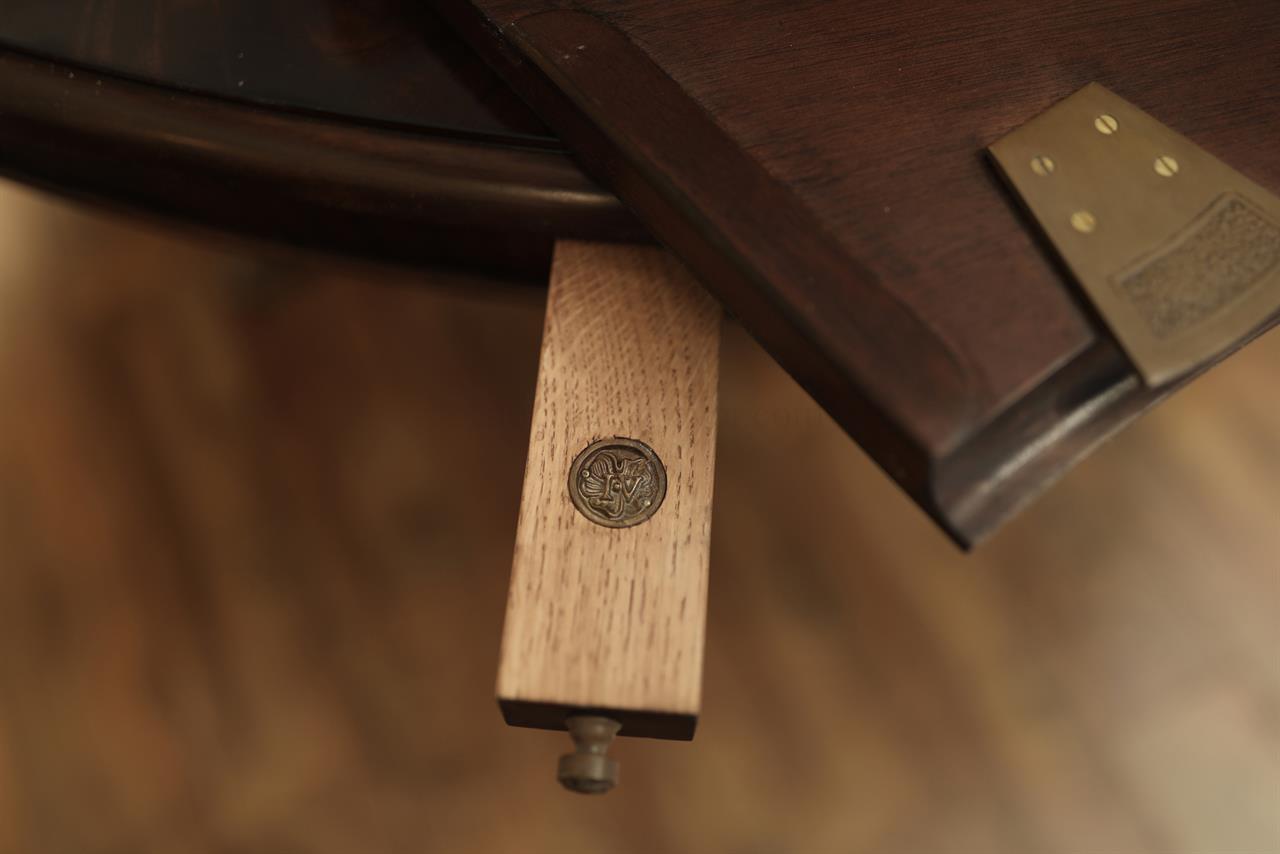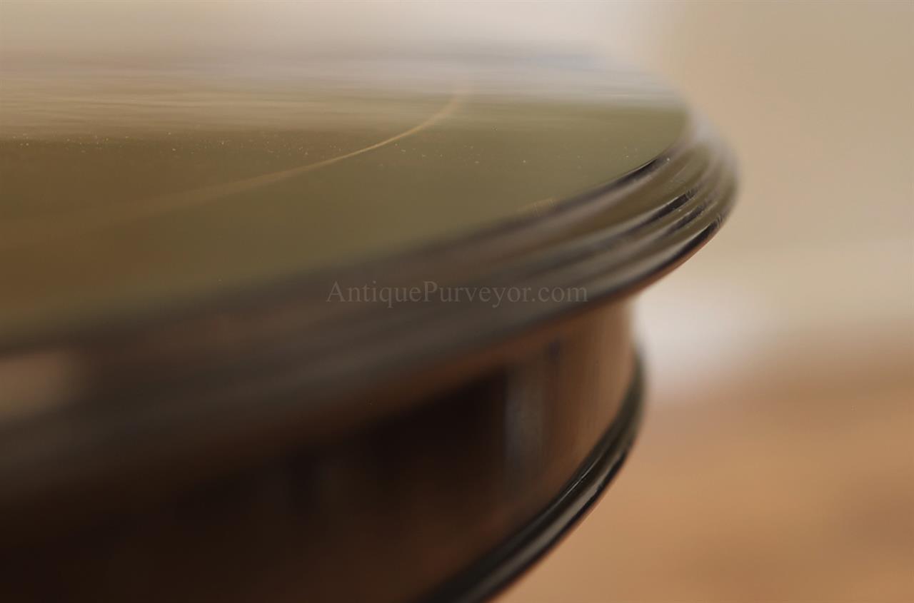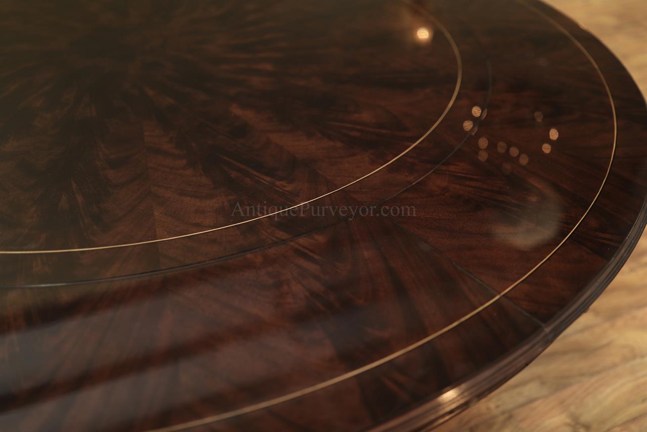 Our Custom Fit Classic 66″ to 90″ expandable round-to-round mahogany dining table with matching leaf storage cabinet in our traditional extra dark walnut finish, an AP Exclusive by AntiquePurveyor. This table has an out-swept saber-leg pedestal, solid brass leveling casters, heavy, custom-forged brass-capped feet, steel-reinforced legs, a pie-cut, slip-matched crotch mahogany top with a finely inlaid black-and-white separator. The table is finished in our rich extra dark walnut color, often compared to an espresso bean brown. This high-end antique reproduction table is exceptionally sturdy and manufactured exclusively for our online store. We also decided to fit the cabinet doors with a working lock and key so you can keep the leaves safe inside the locked doors. Hidden inset magnets hold the doors snugly closed. This table seats 6 to 12 people.