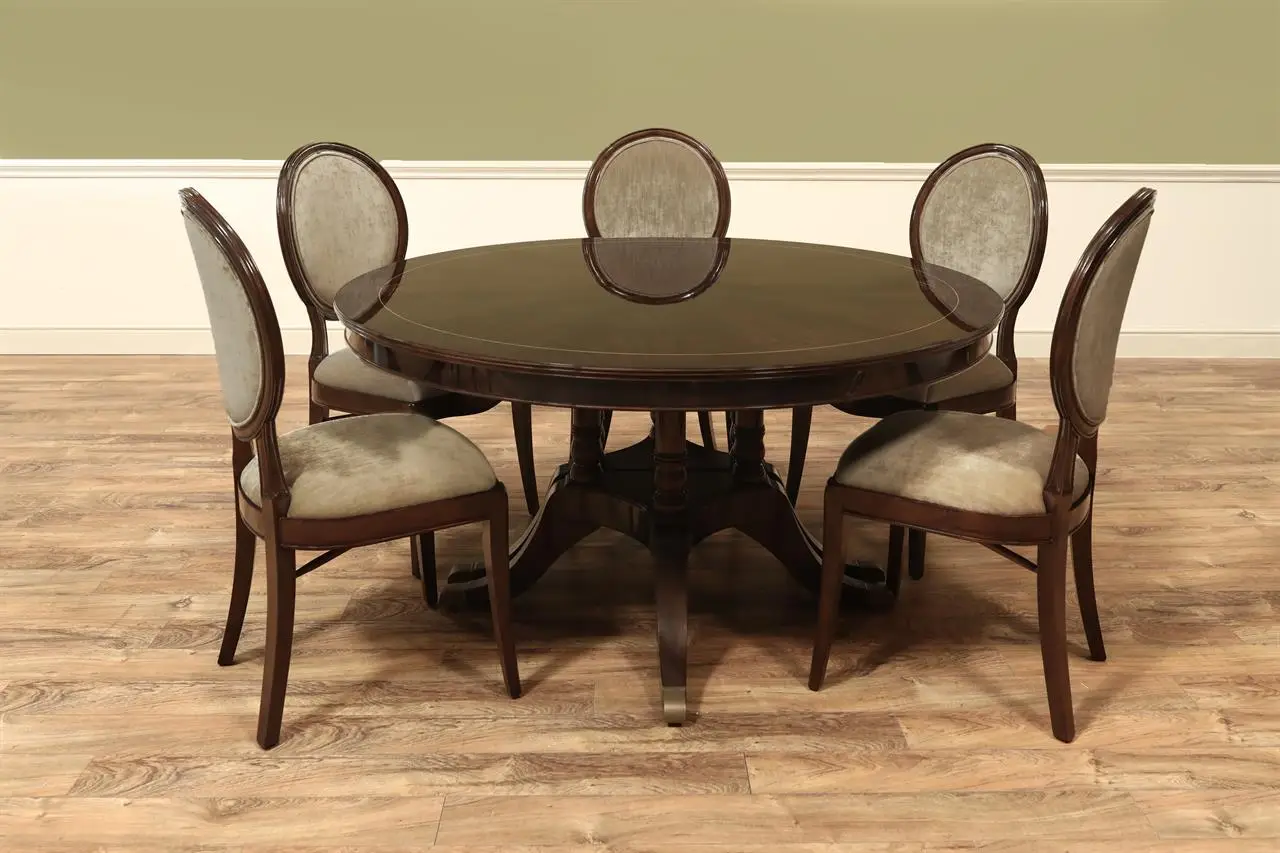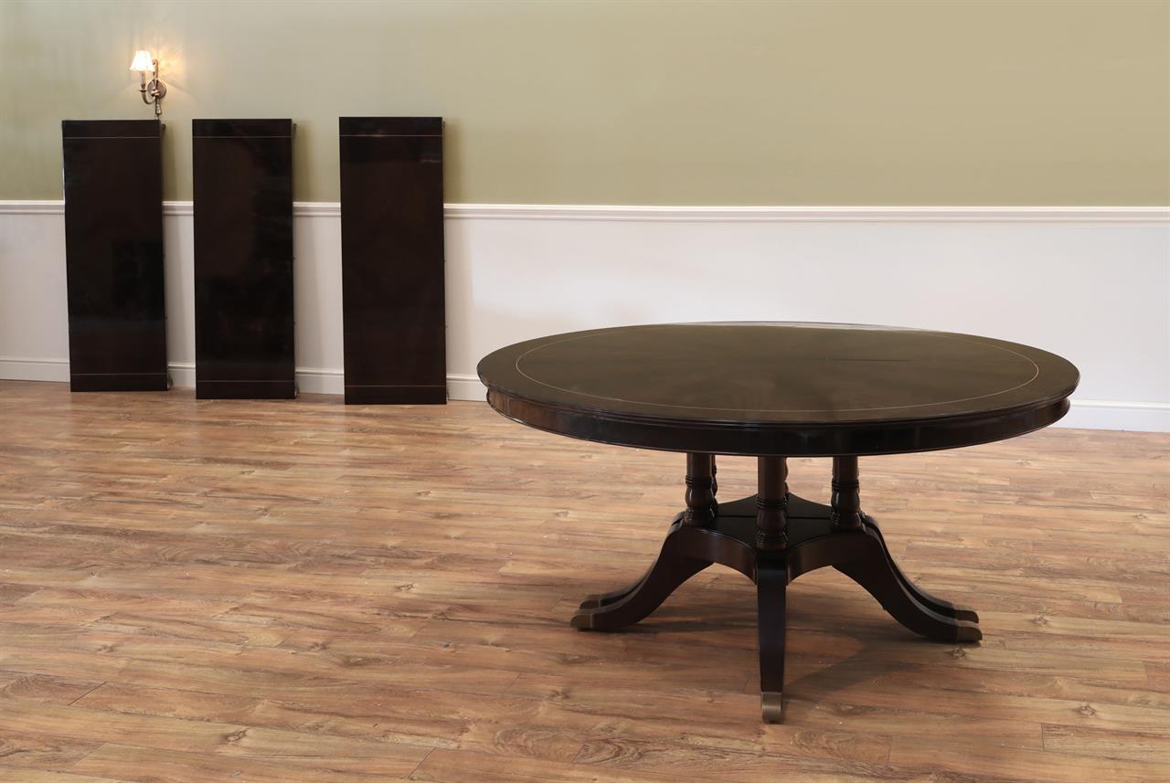 A 60” round-to-oval expandable dining table with three leaves opens to 10 feet and seats 6 to 12 people. This table has a polished dark walnut finish with fine stringing inlay. This dark contrasting finish was formulated to work with today’s modern color schemes and pastels, but it can also work well with traditional decor.