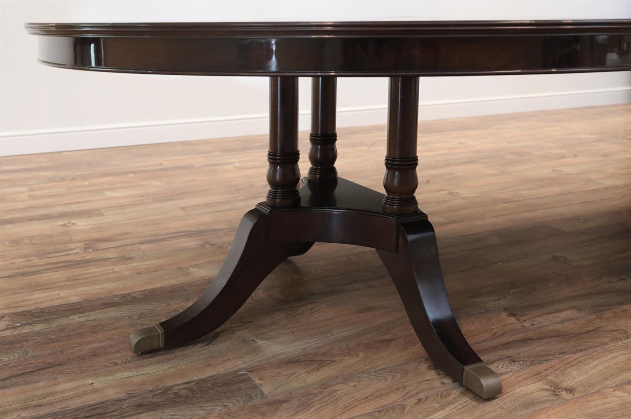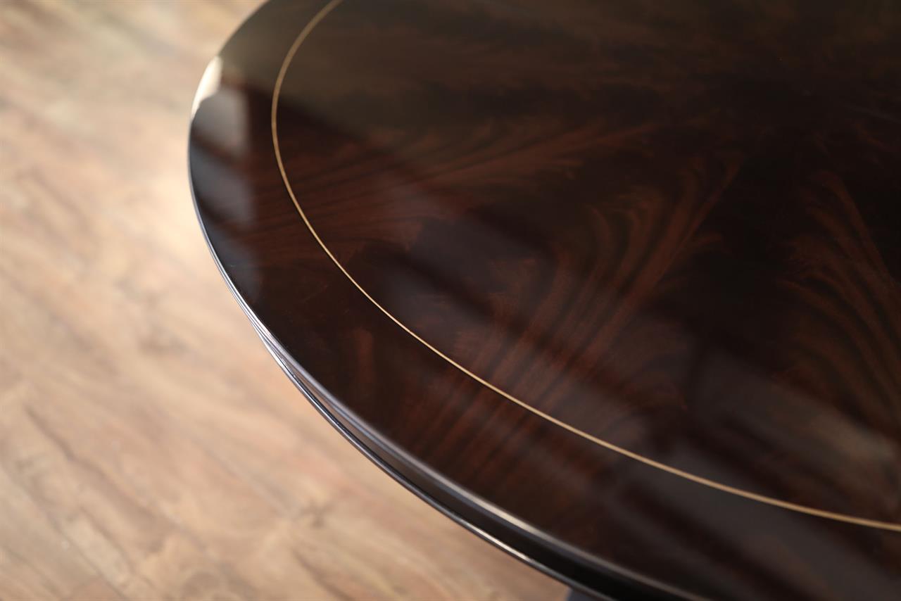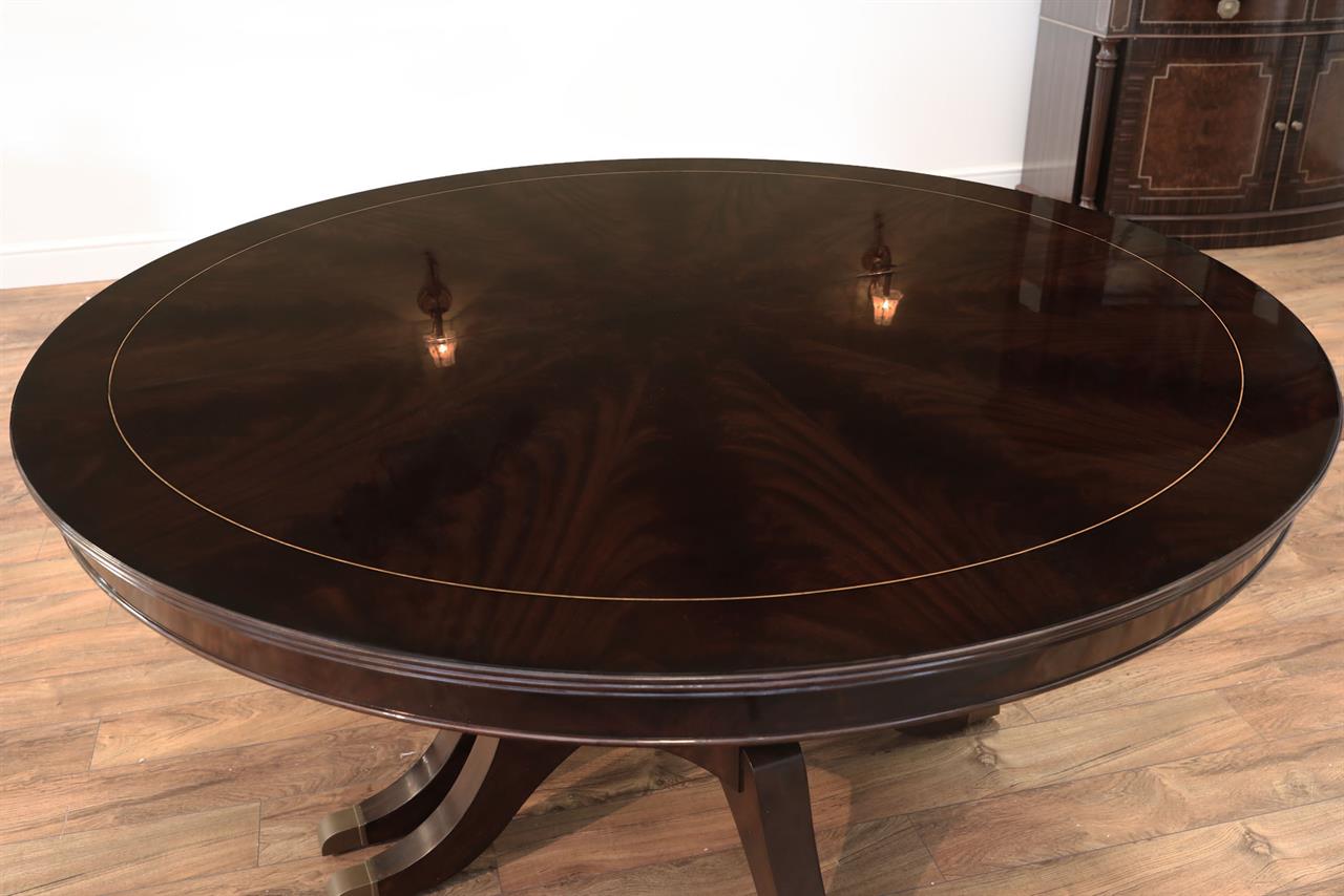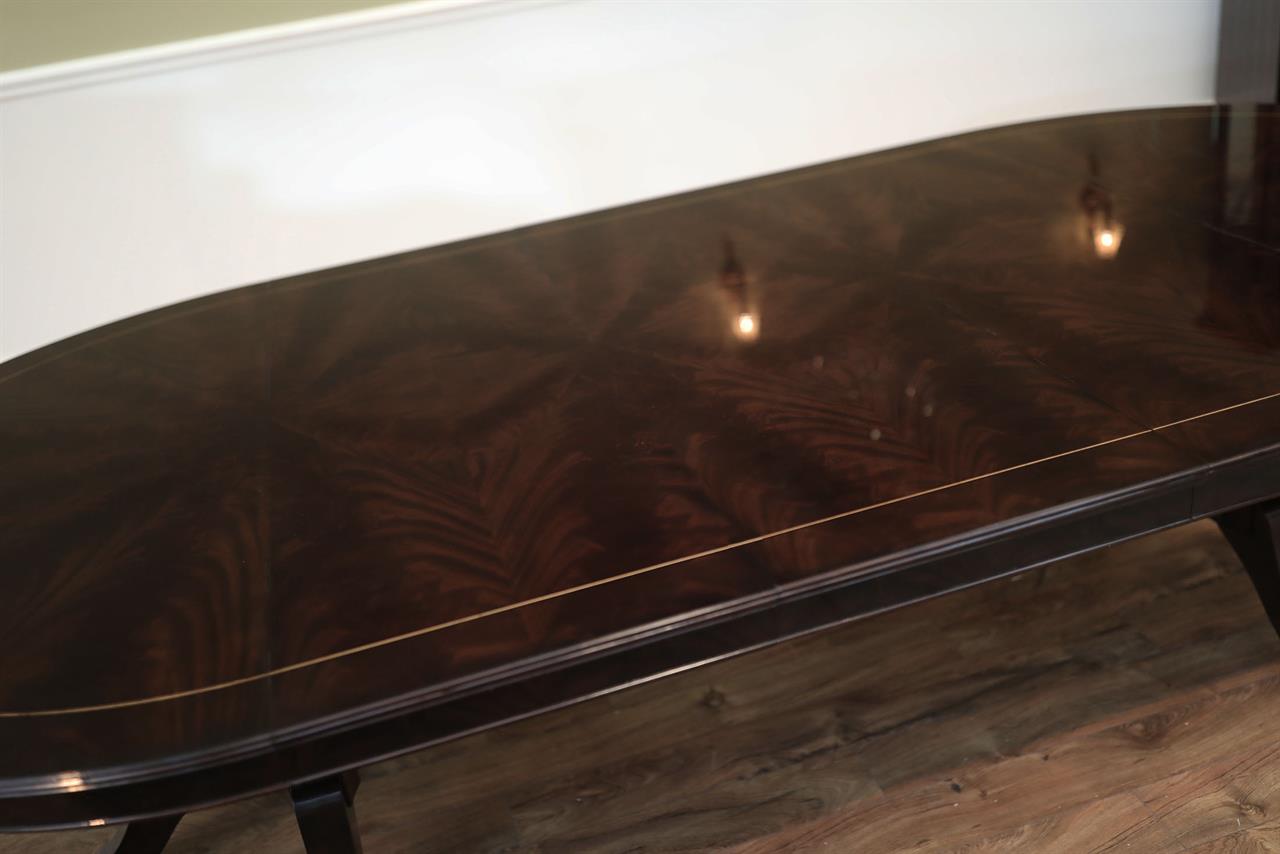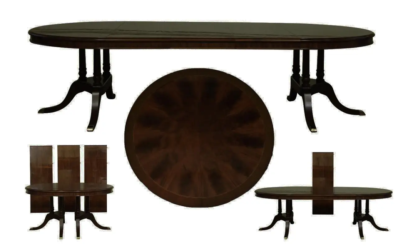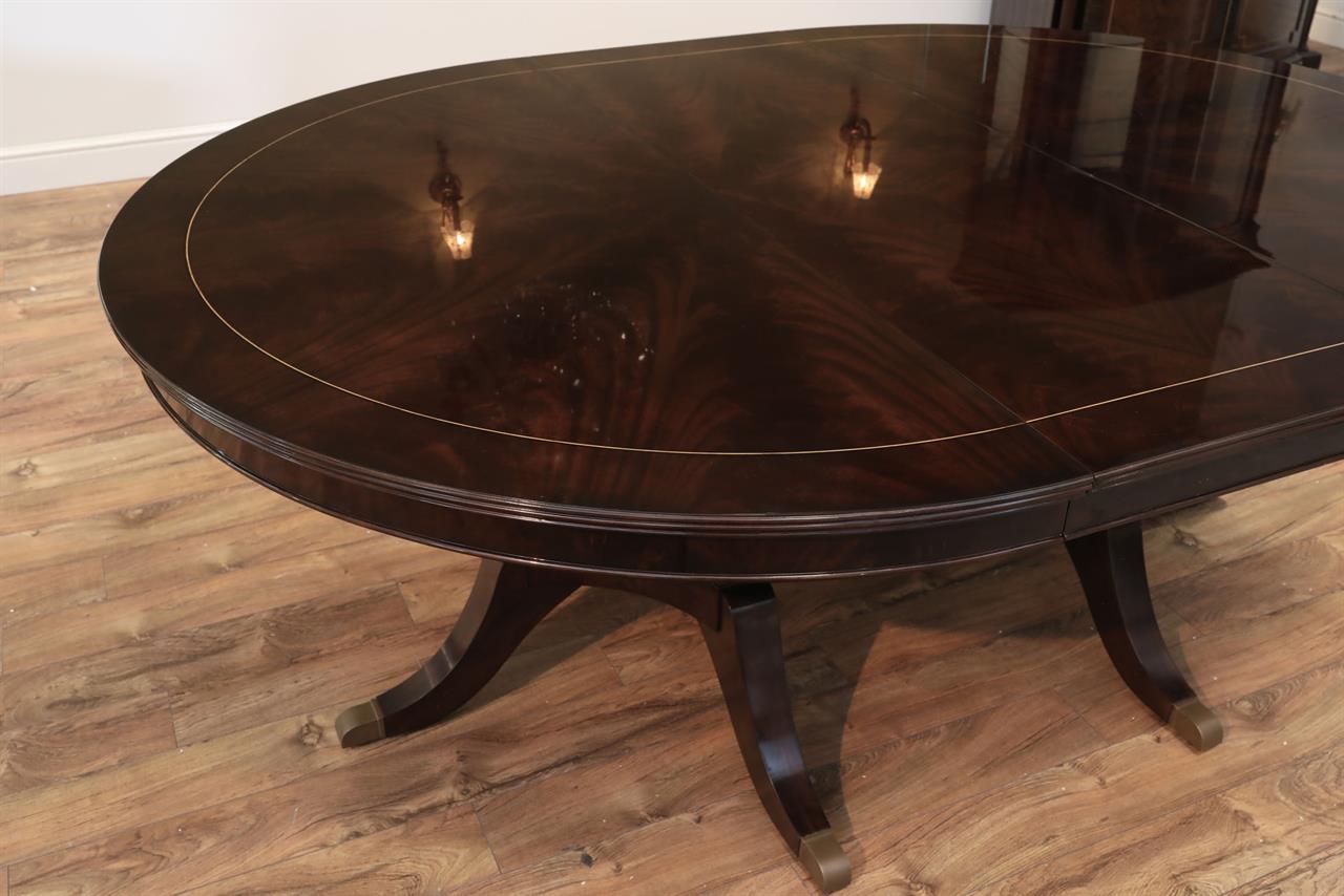 The extension slides are made of solid steel, and they are made in the USA. The tabletop is decorated with pie-cut flame mahogany, and it sits on a unique split-pedestal that opens to configure the table into an oval shape.. The table sits on a sturdy, overbuilt saber leg pedestal with steel-reinforced, outsweeping legs terminating in solid forged brass-capped feet and levelers. This is a flagship exclusive model table built just for our store.