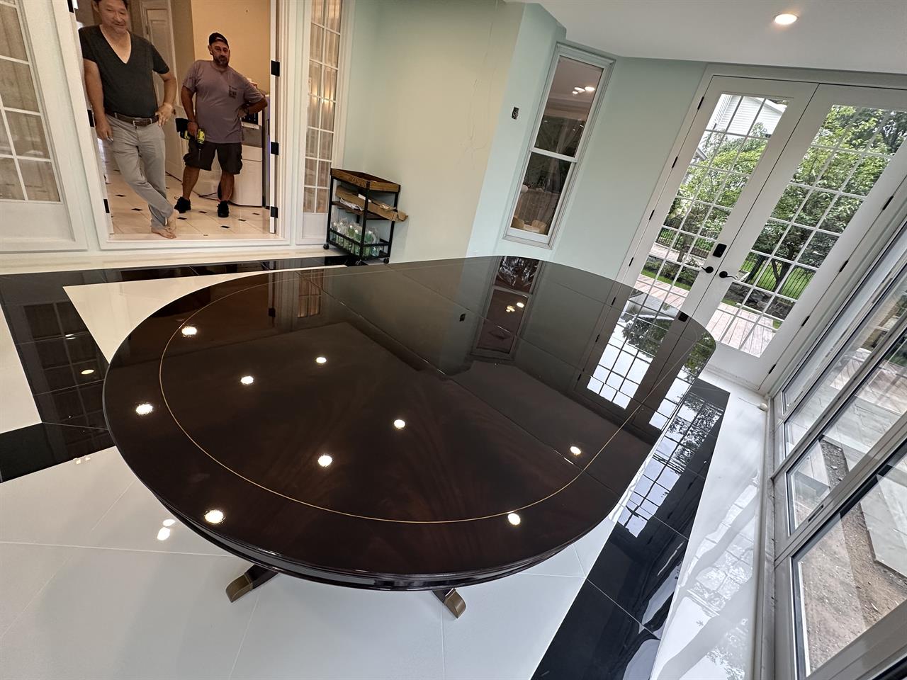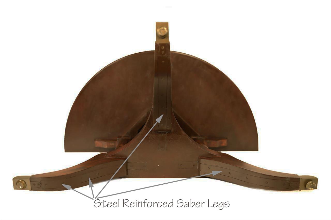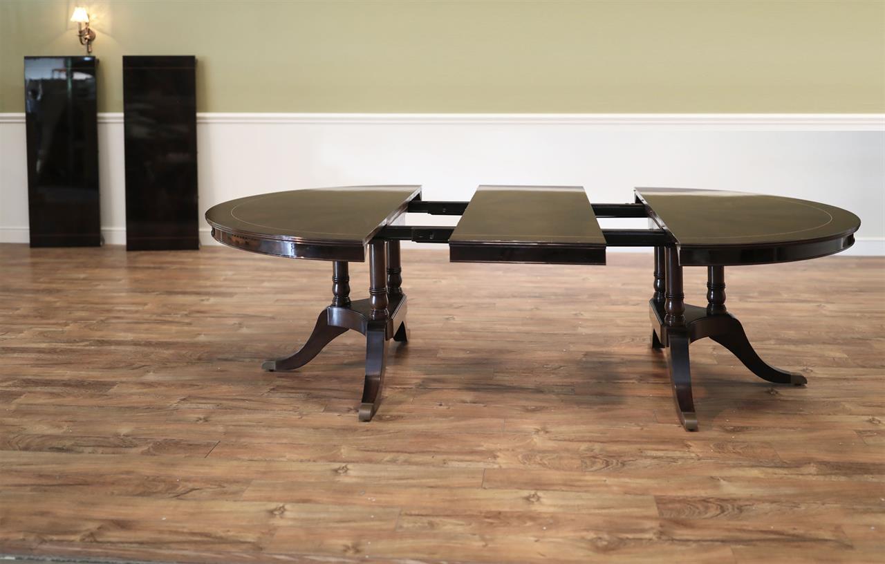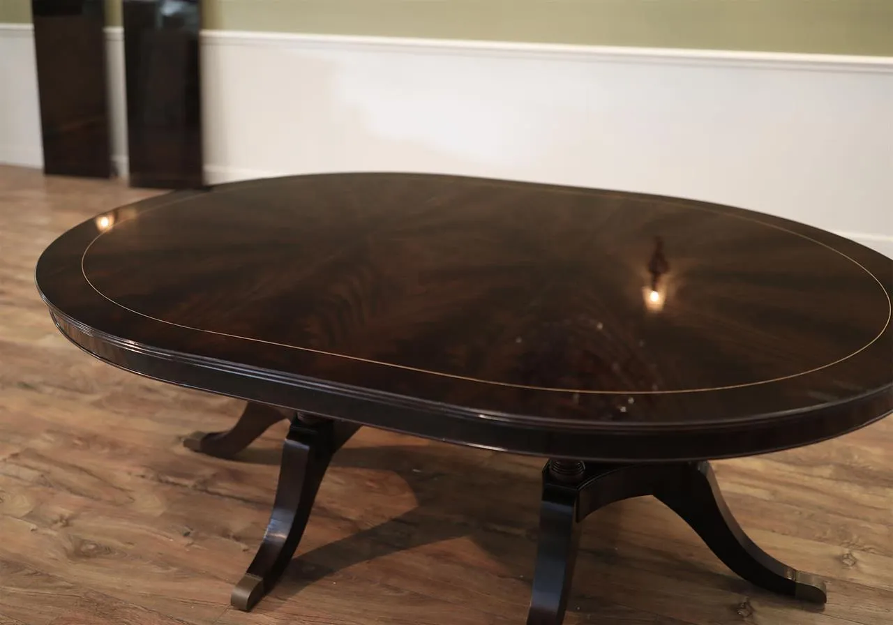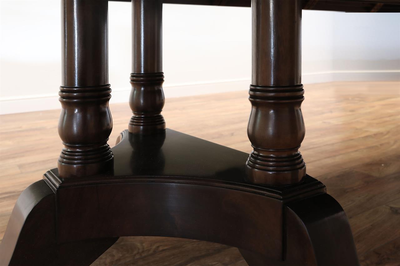 The extension slides are made of solid steel, and they are made in the USA. The tabletop is decorated with pie-cut flame mahogany, and it sits on a unique split-pedestal that opens to configure the table into an oval shape.. The table sits on a sturdy, overbuilt saber leg pedestal with steel-reinforced, outsweeping legs terminating in solid forged brass-capped feet and levelers. This is a flagship exclusive model table built just for our store.