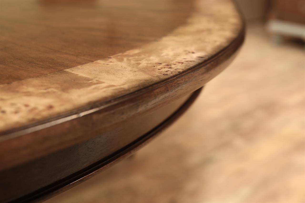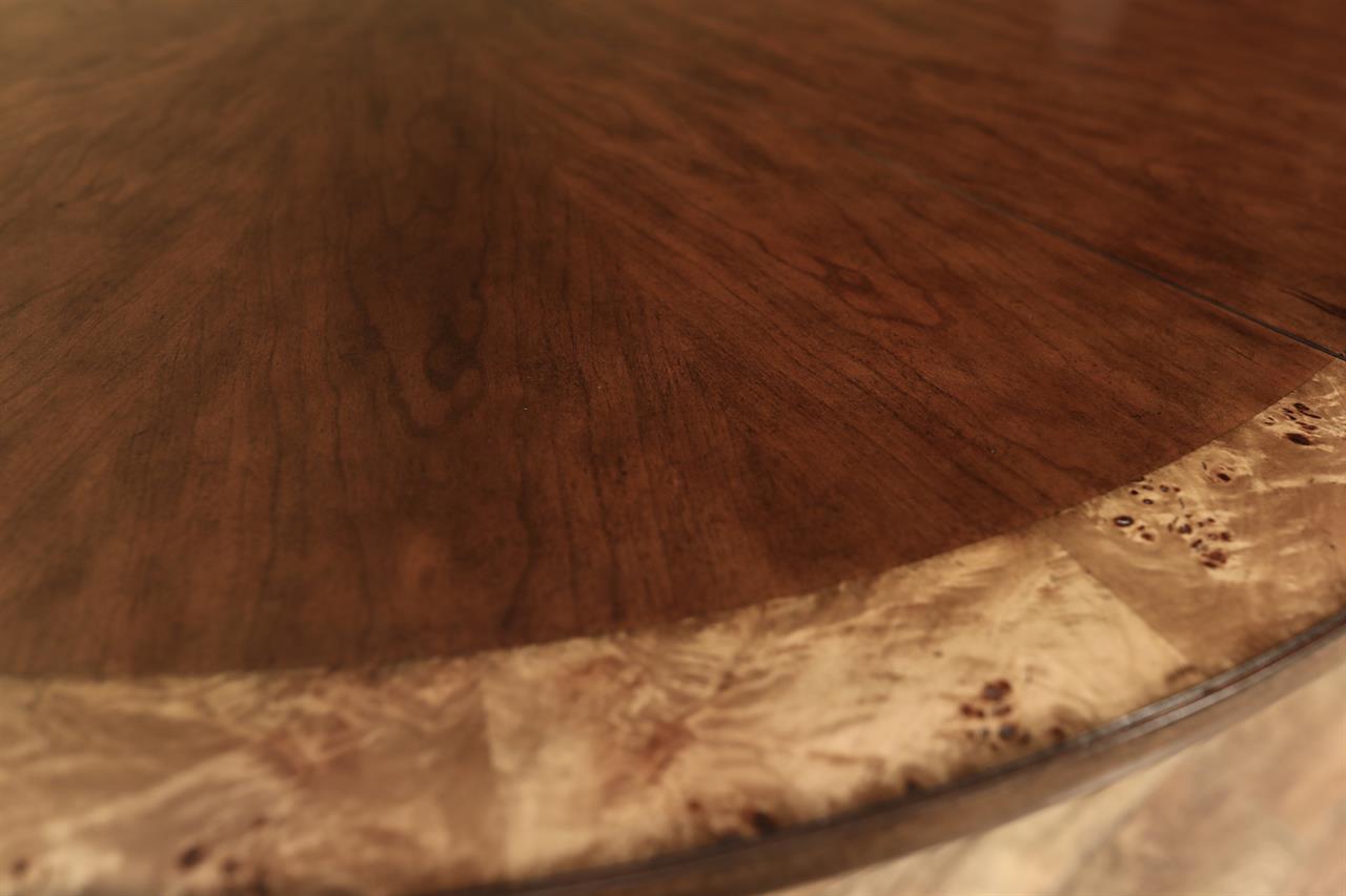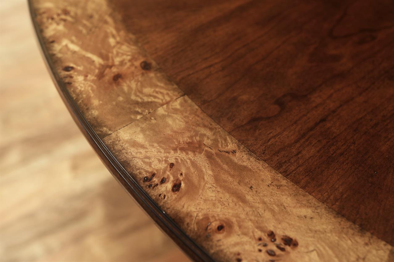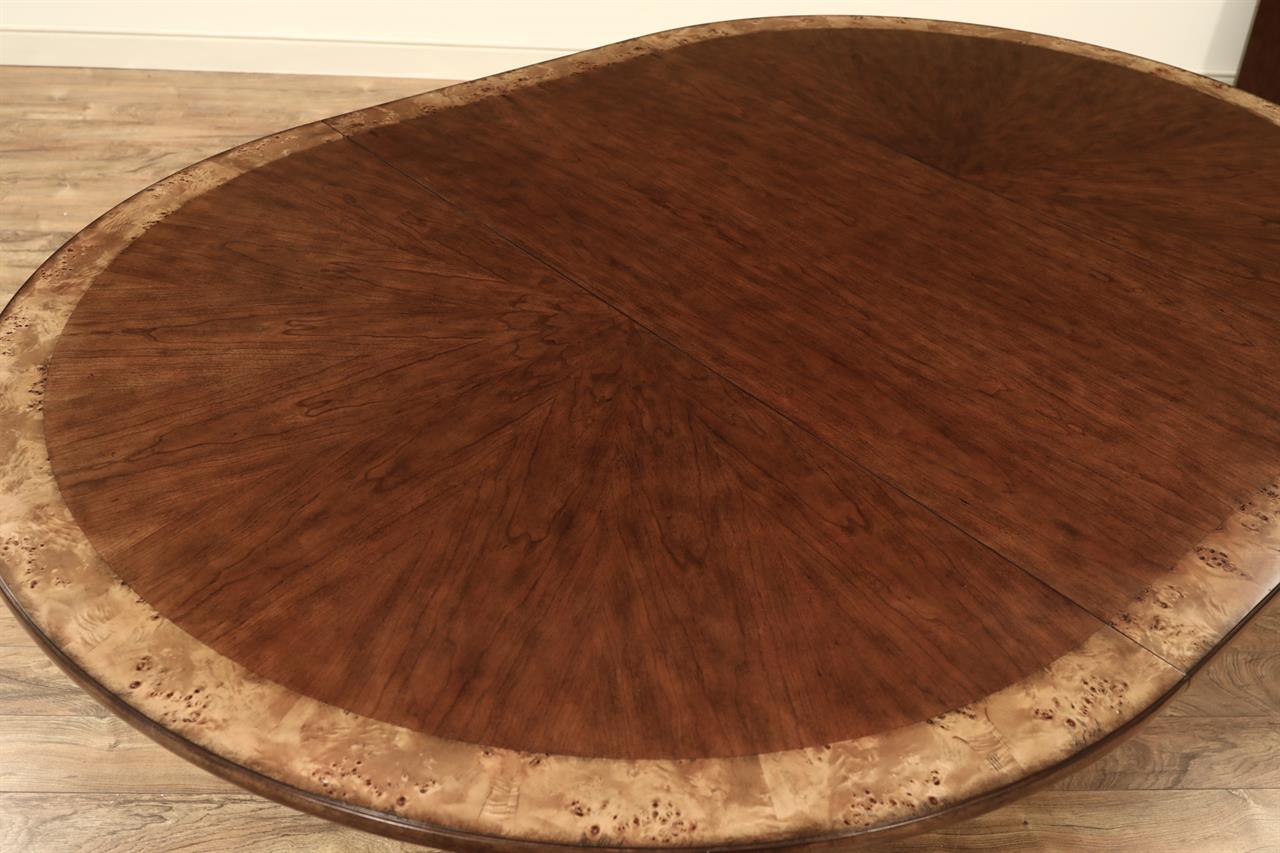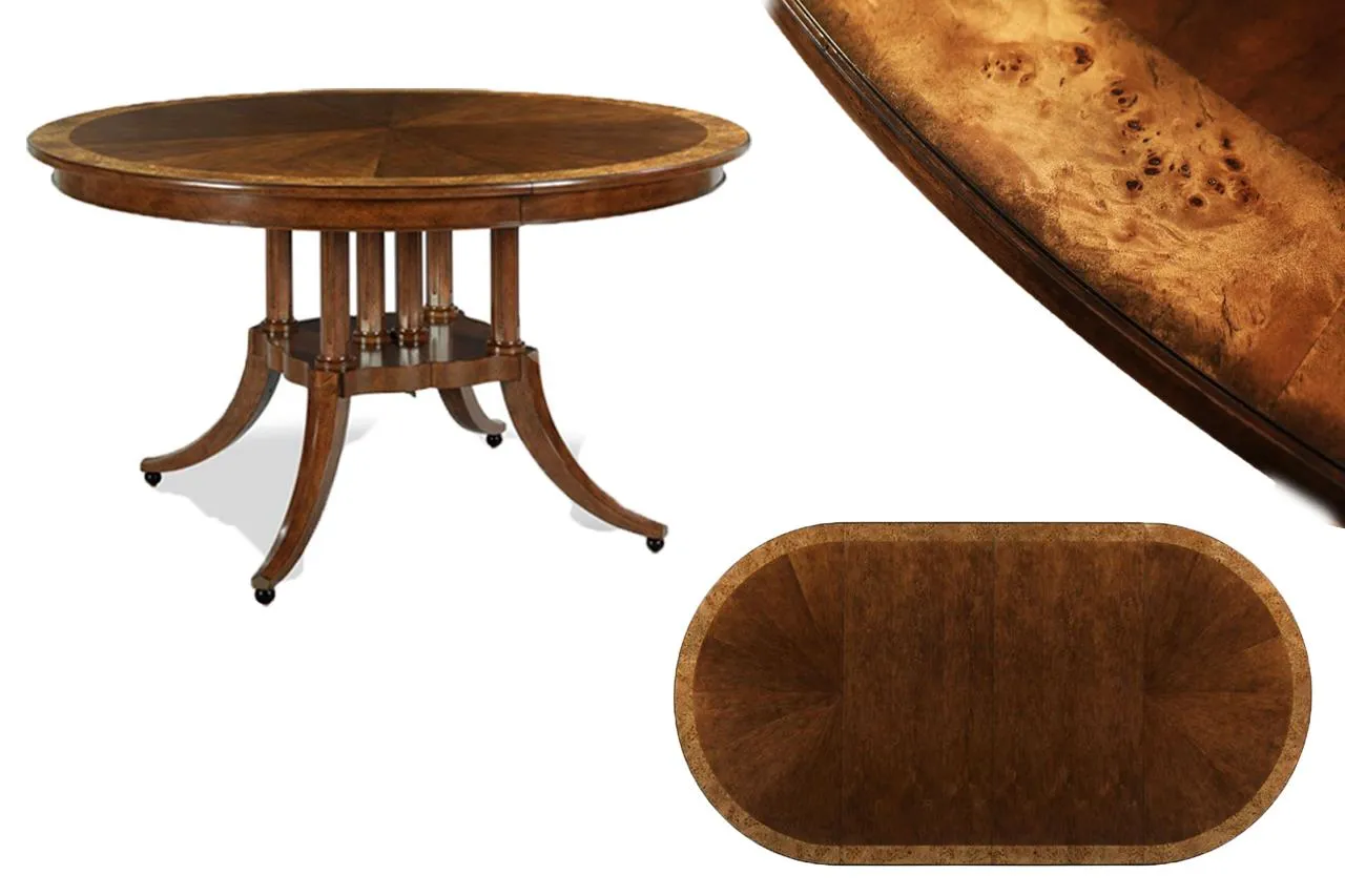 54-inch round to oval dining room table with walnut radial-cut field and burly border. This table has two leaves and opens to 102 inches with both 24-inch leaves. The apron is modernized, and the manufacturer set this apron back about 2 inches from the table’s edge to give the table a lighter feel in the room. The table has traditional wooden slides, brass-capped feet, and antique-style wheels. The saber legs are modernized, and they have fewer carvings than a typical traditional birdcage pedestal. Table height is 30″.