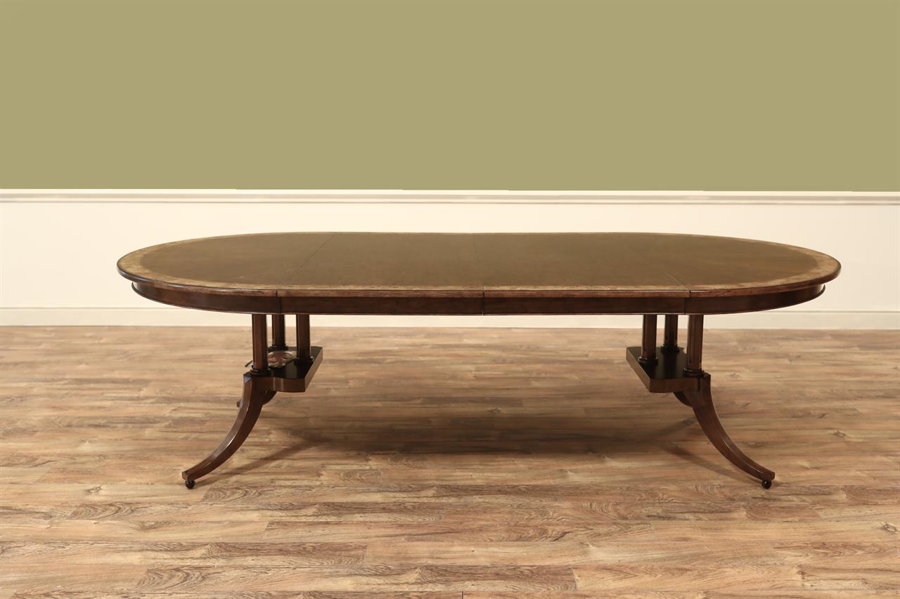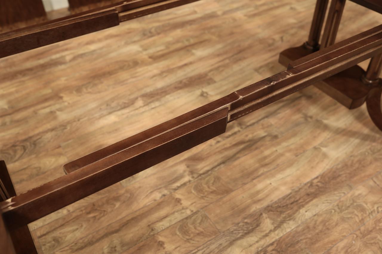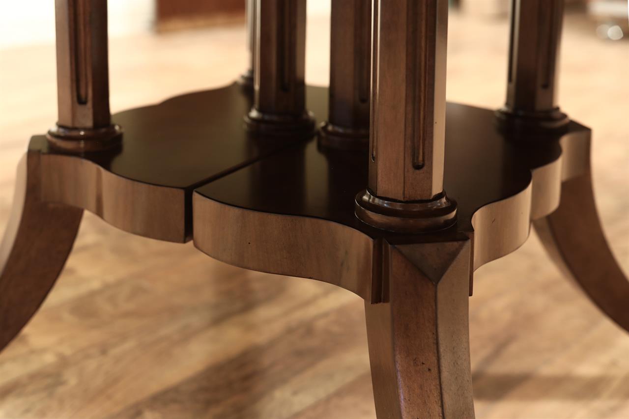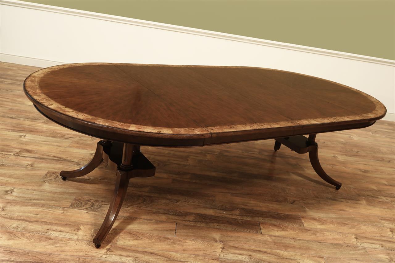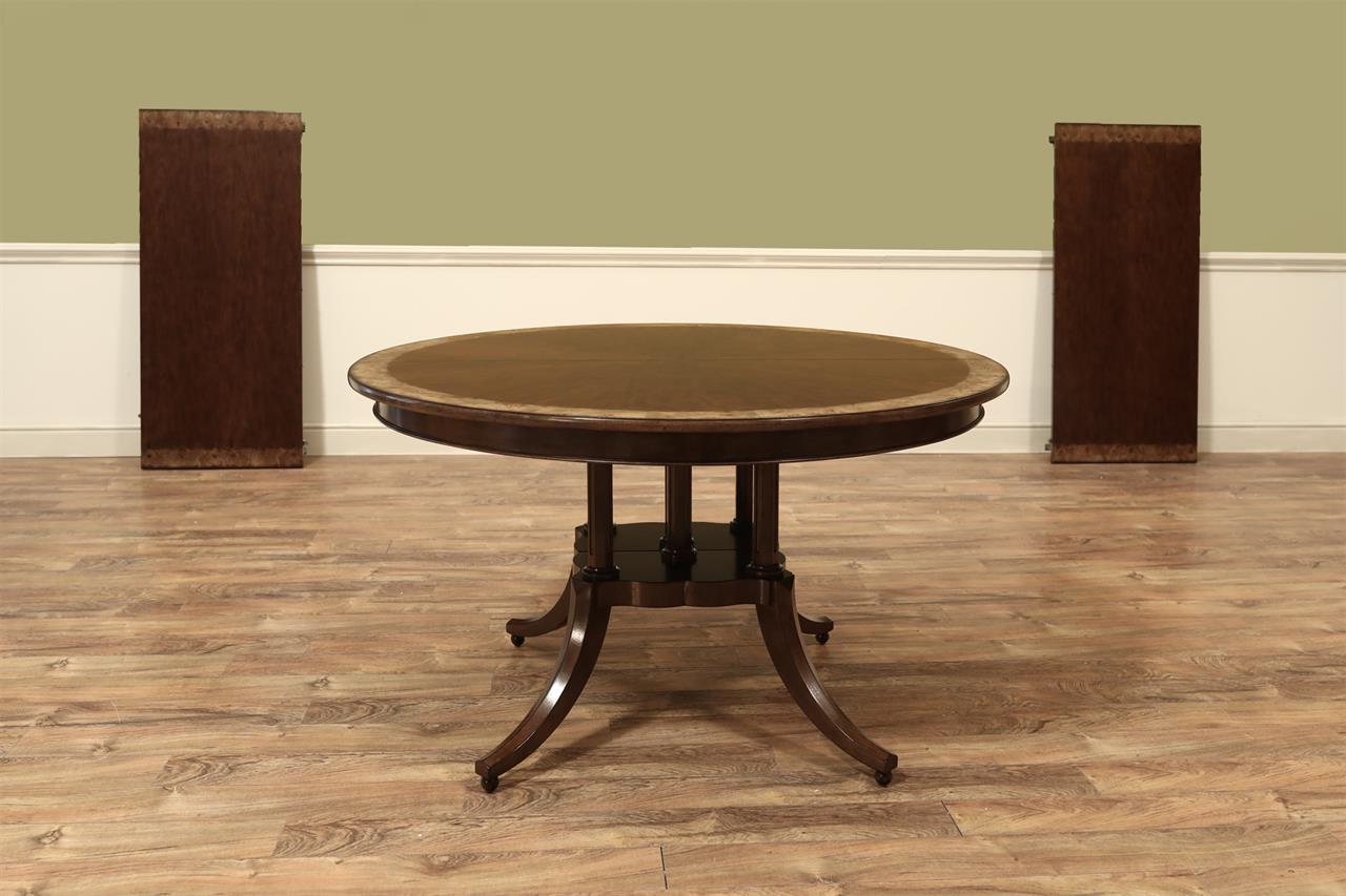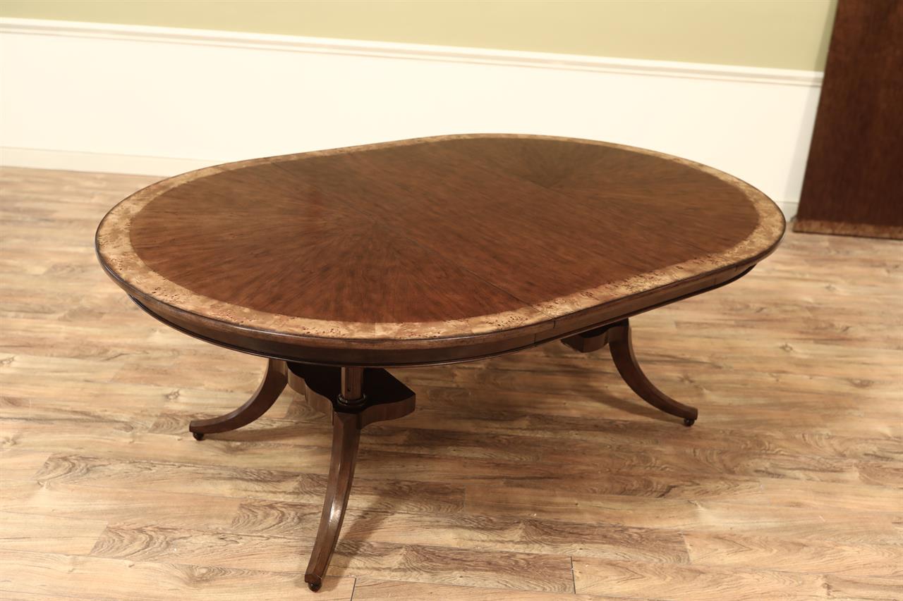 54-inch round to oval dining room table with walnut radial-cut field and burly border. This table has two leaves and opens to 102 inches with both 24-inch leaves. The apron is modernized, and the manufacturer set this apron back about 2 inches from the table’s edge to give the table a lighter feel in the room. The table has traditional wooden slides, brass-capped feet, and antique-style wheels. The saber legs are modernized, and they have fewer carvings than a typical traditional birdcage pedestal. Table height is 30″.