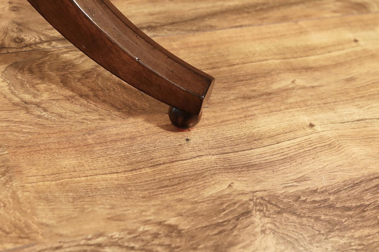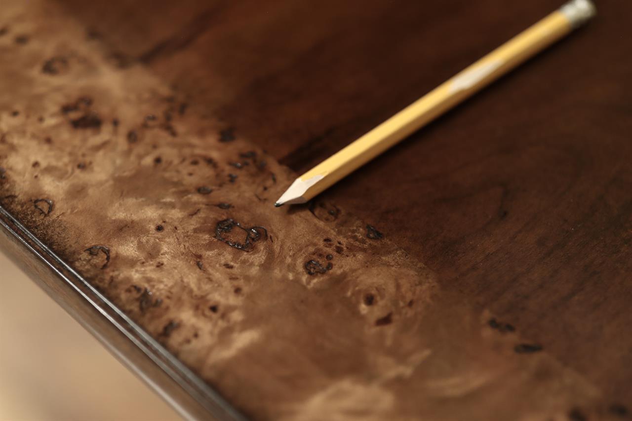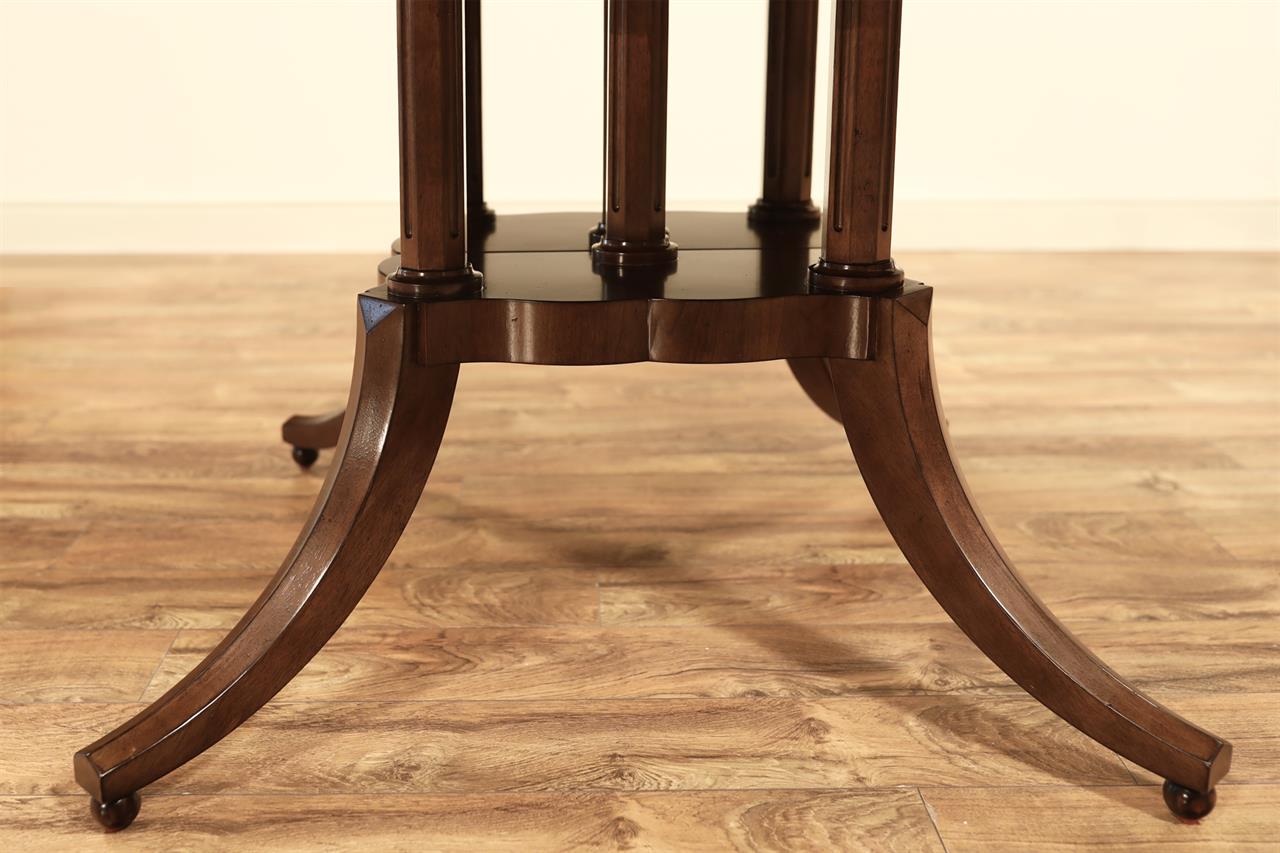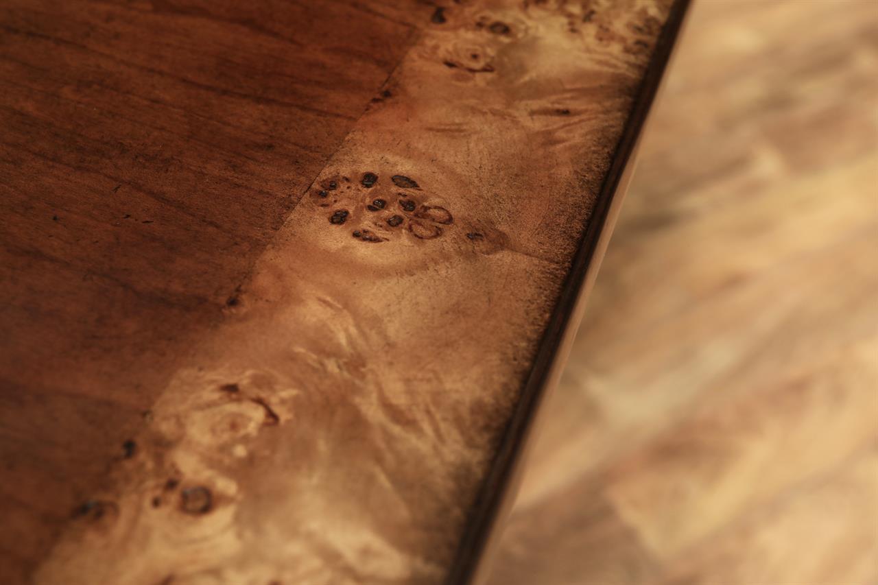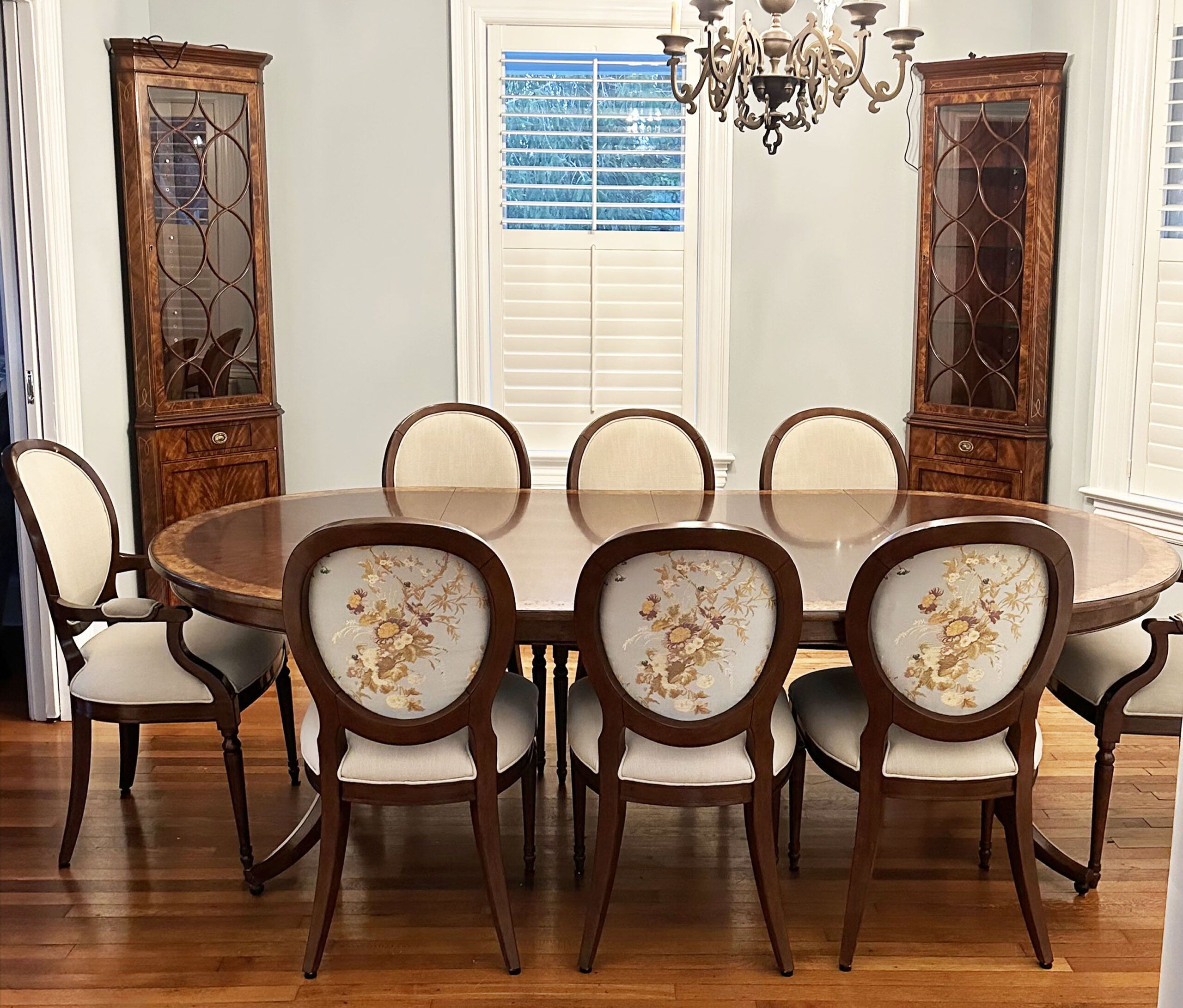 54-inch round to oval dining room table with walnut radial-cut field and burly border. This table has two leaves and opens to 102 inches with both 24-inch leaves. The apron is modernized, and the manufacturer set this apron back about 2 inches from the table’s edge to give the table a lighter feel in the room. The table has traditional wooden slides, brass-capped feet, and antique-style wheels. The saber legs are modernized, and they have fewer carvings than a typical traditional birdcage pedestal. Table height is 30″.