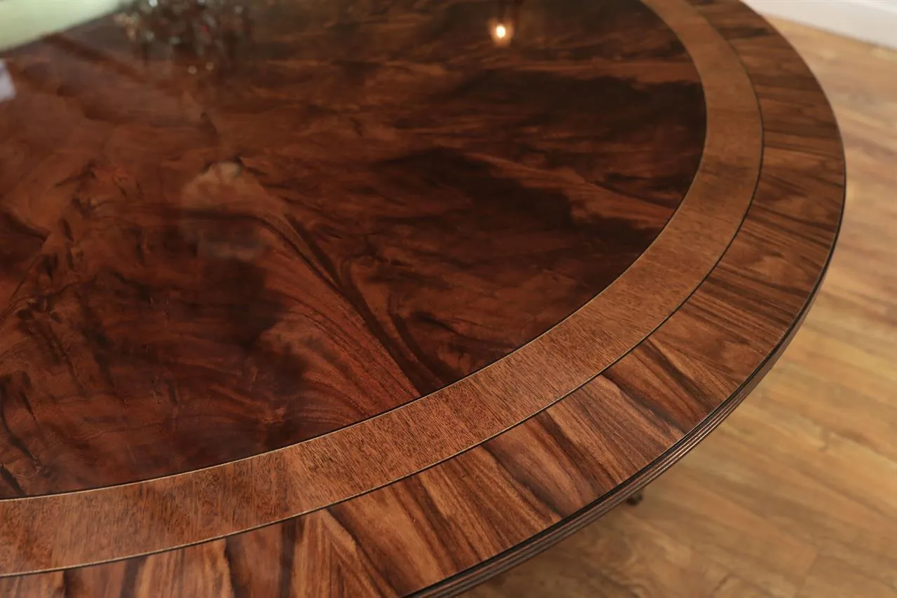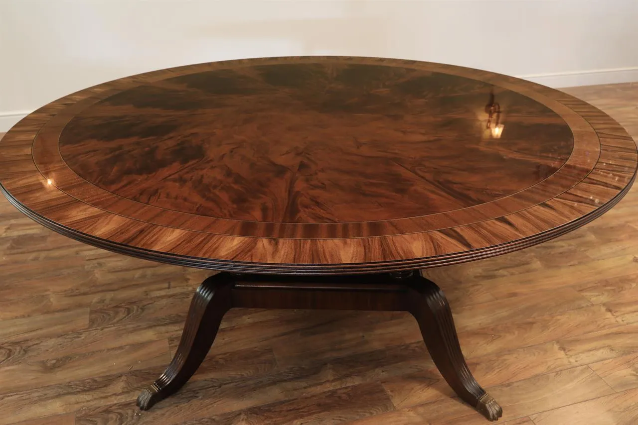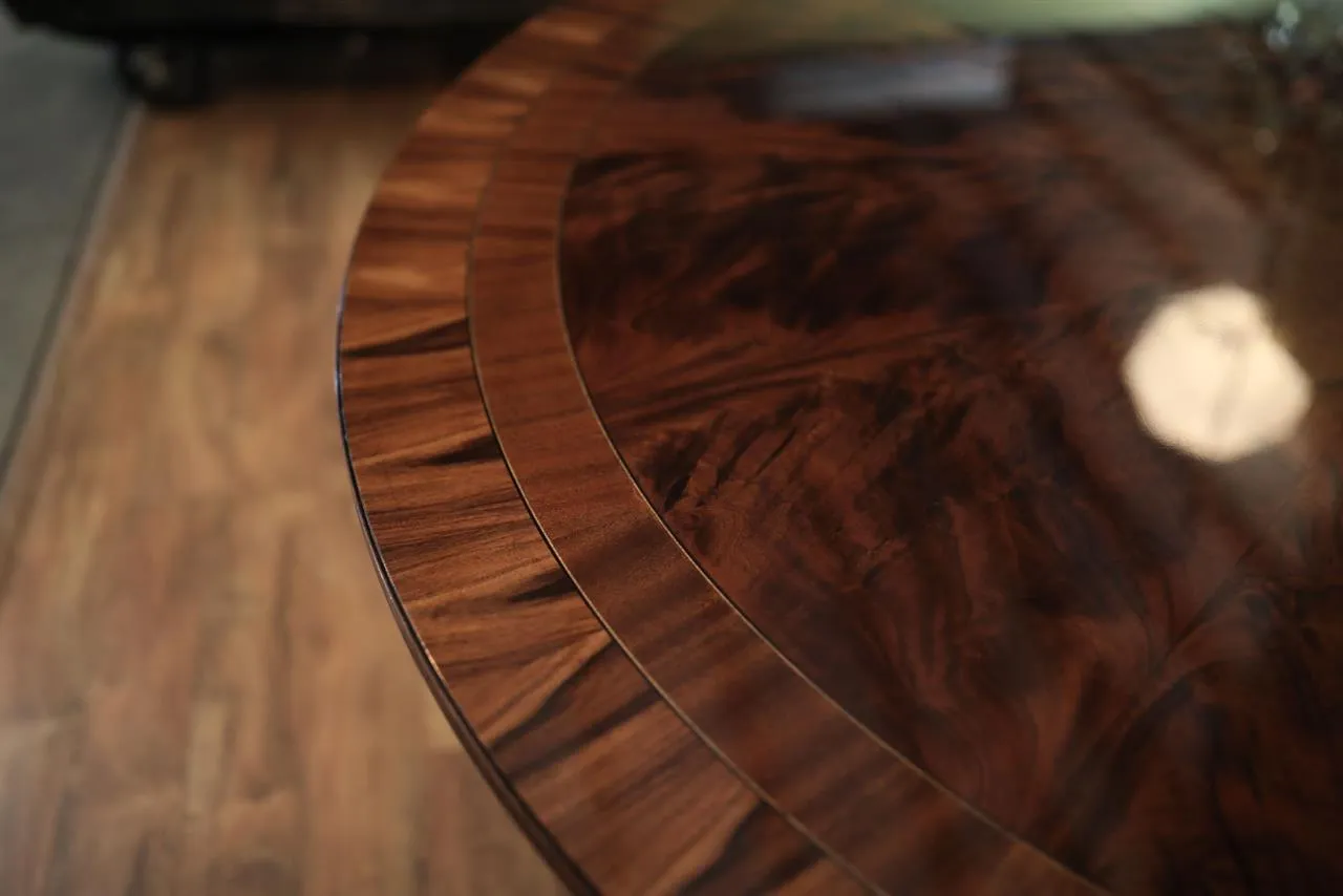 72-inch Round mahogany dining table. This is an American-made Duncan Phyfe antique reproduction. The quality is excellent. It has a razor-thin lacquer finish, buffed to shine like a French polish. Table has mahogany and rosewood inlays on a pie-cut mahogany field.