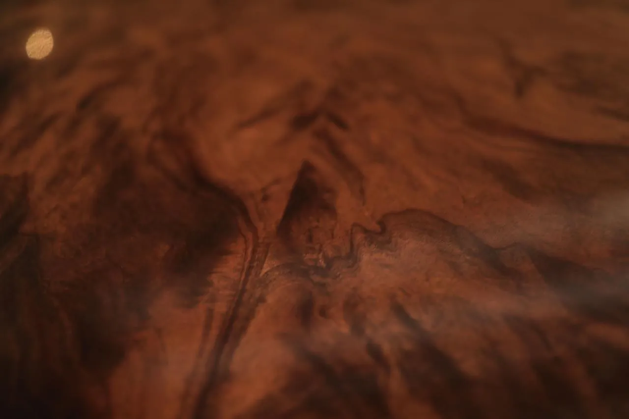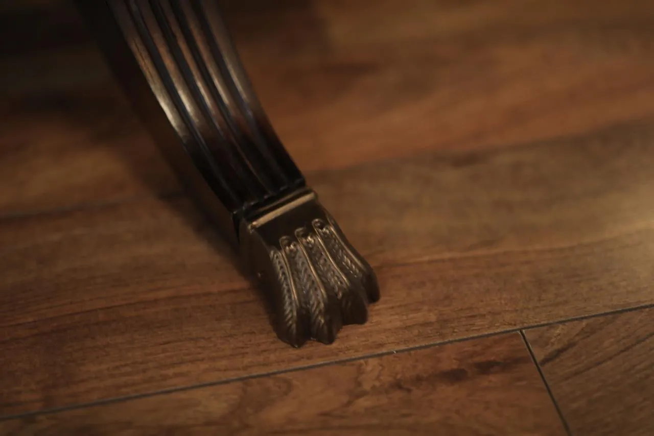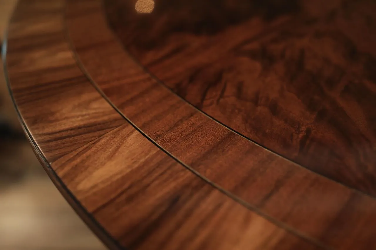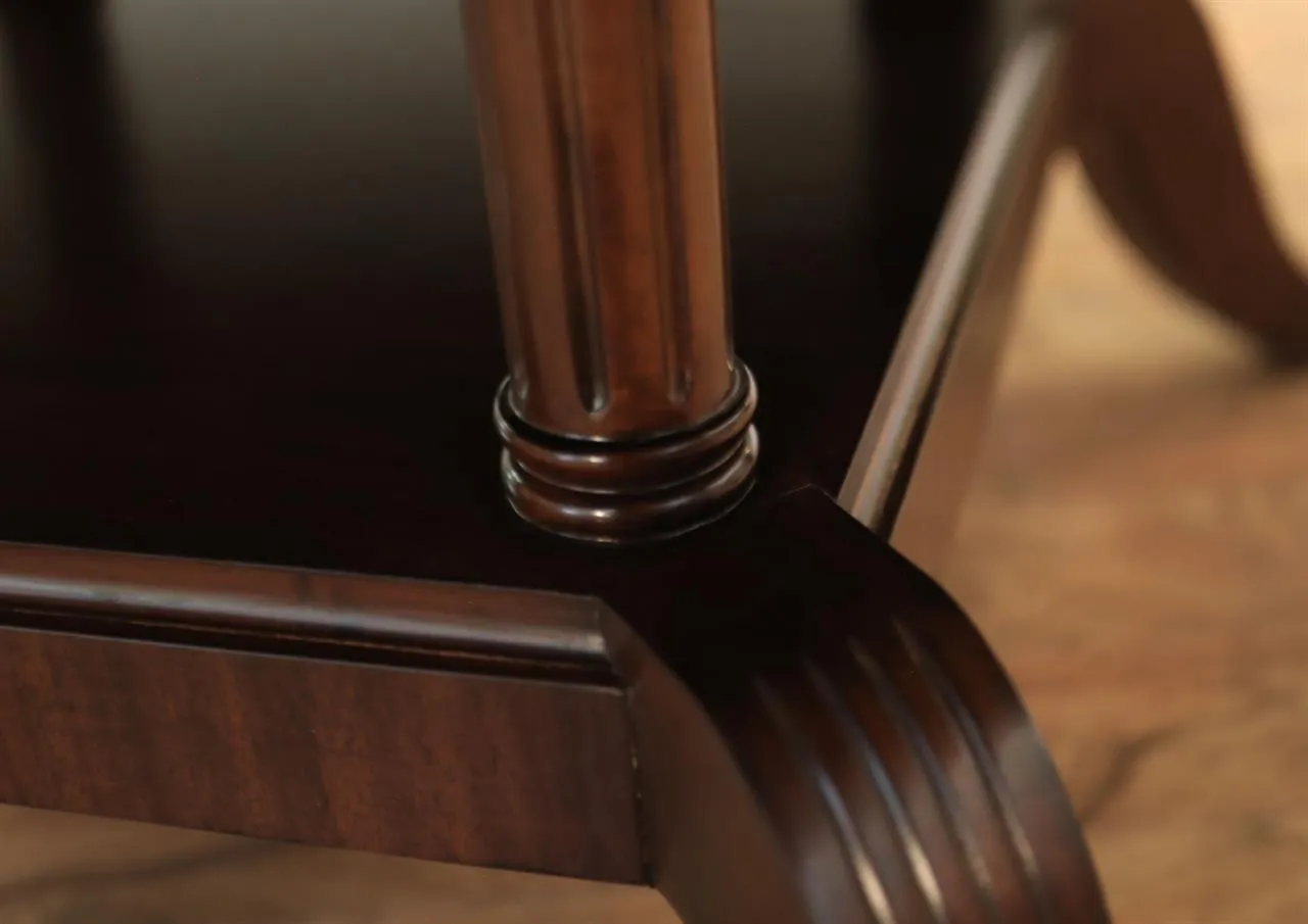 72-inch Round mahogany dining table. This is an American-made Duncan Phyfe antique reproduction. The quality is excellent. It has a razor-thin lacquer finish, buffed to shine like a French polish. Table has mahogany and rosewood inlays on a pie-cut mahogany field.