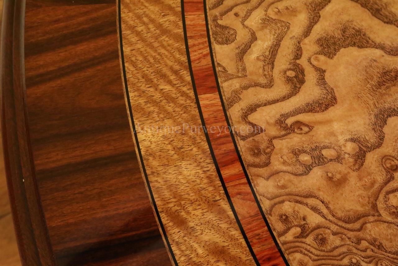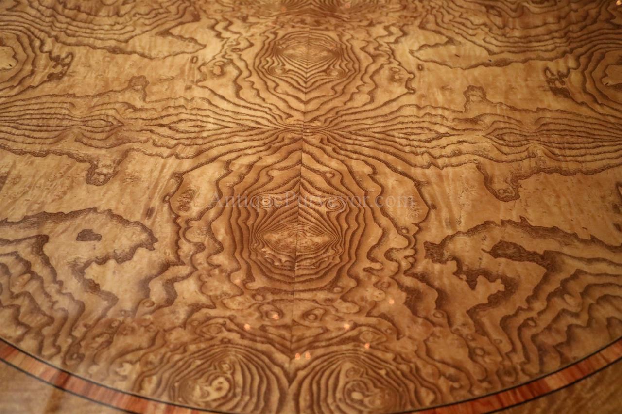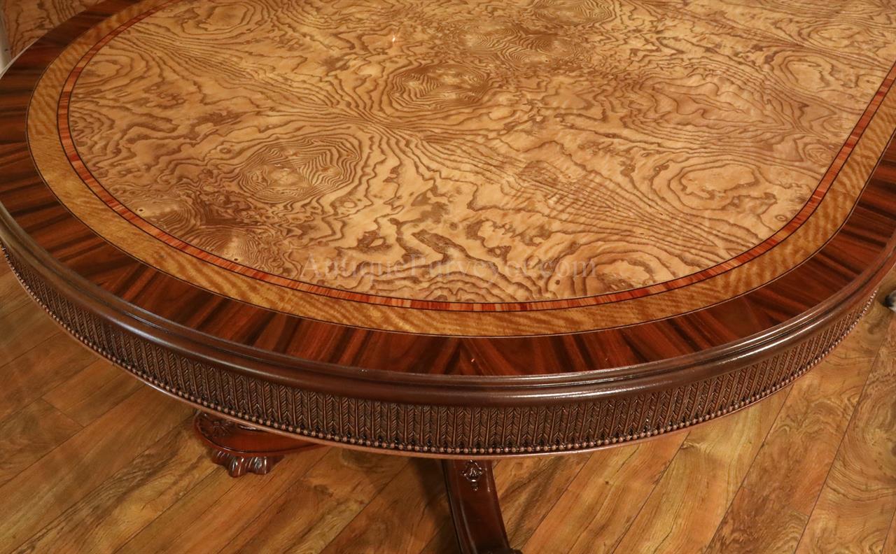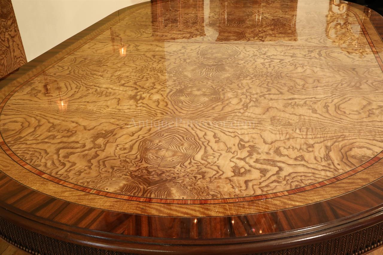 Home » Catalog » Rare and unique burly ash oval dining table with two rope and tassel carved pedestals. Wide and large oval dining table