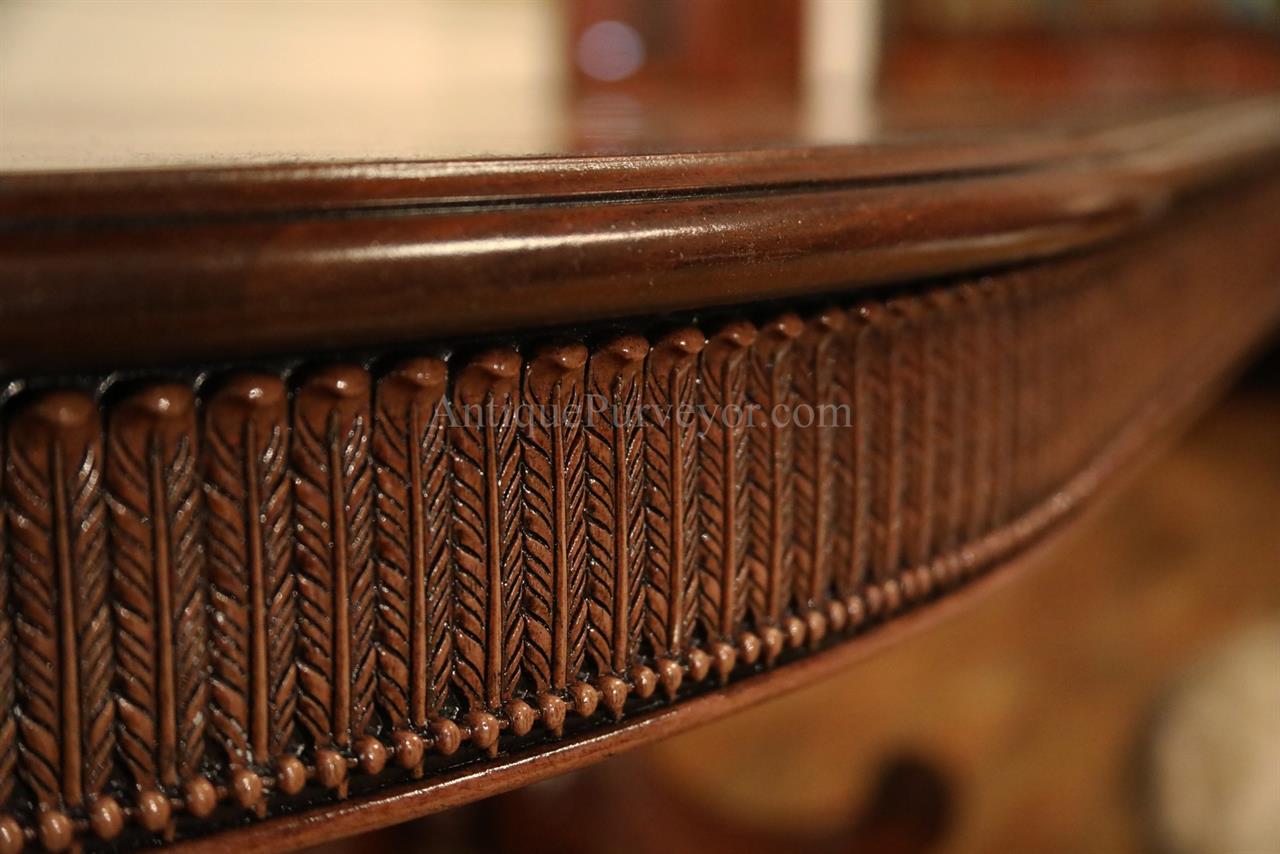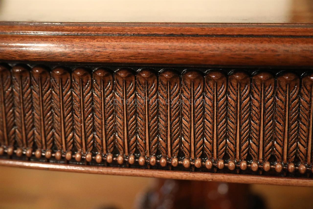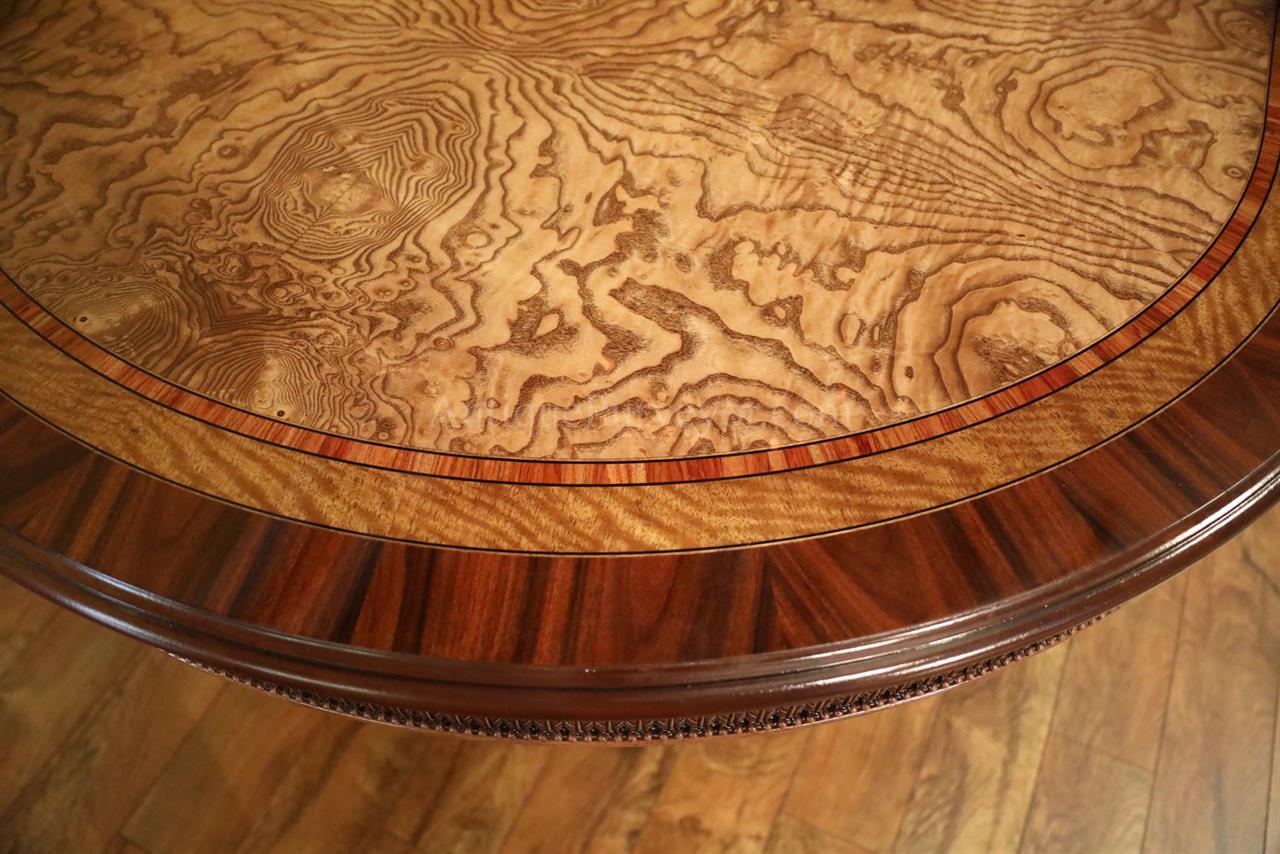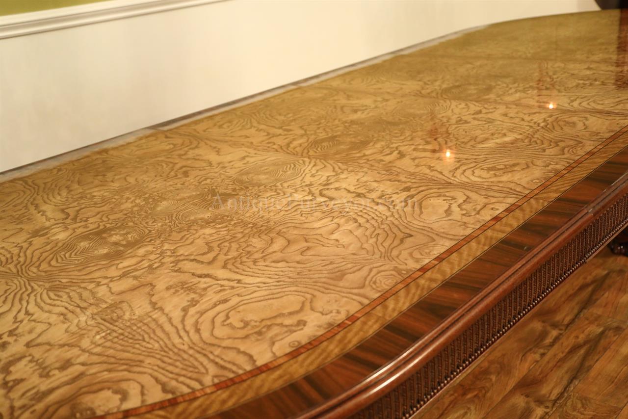 Luxurious and rare wide oval dining table and two leaves by EJ Victor. This fancy double pedestal dining table was discontinued about 20 years ago but this table was recently finished and it is virtually brand new. The burly ash wood grain sparkles under its new and recently lacquered finish. The finish on this table is razor-thin and polished to shine like a traditional French polish. This is a sturdy table, the original maker was a USA builder and we only have one table to offer. It stands very strongly on wide plume base pedestals with a rope and tassel carving. The table has a unique edging, it is bordered with rosewood and the perimeter of the table is wrapped with an intricate acanthus leaf-carved apron. This is also a great table for a traditional conference. Very good quality.