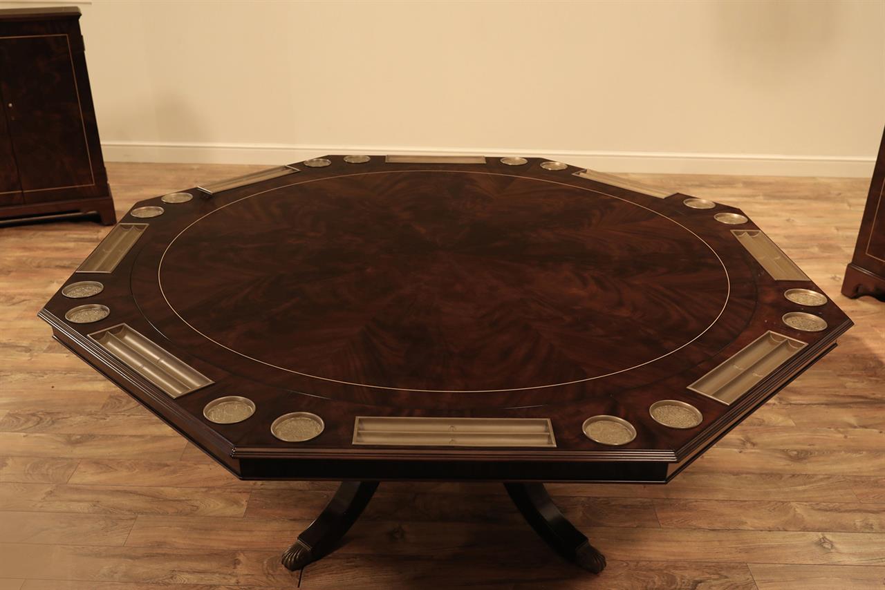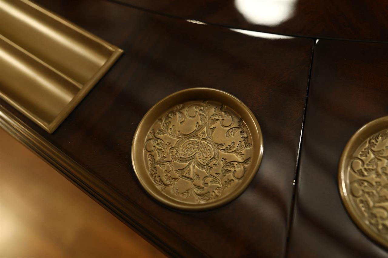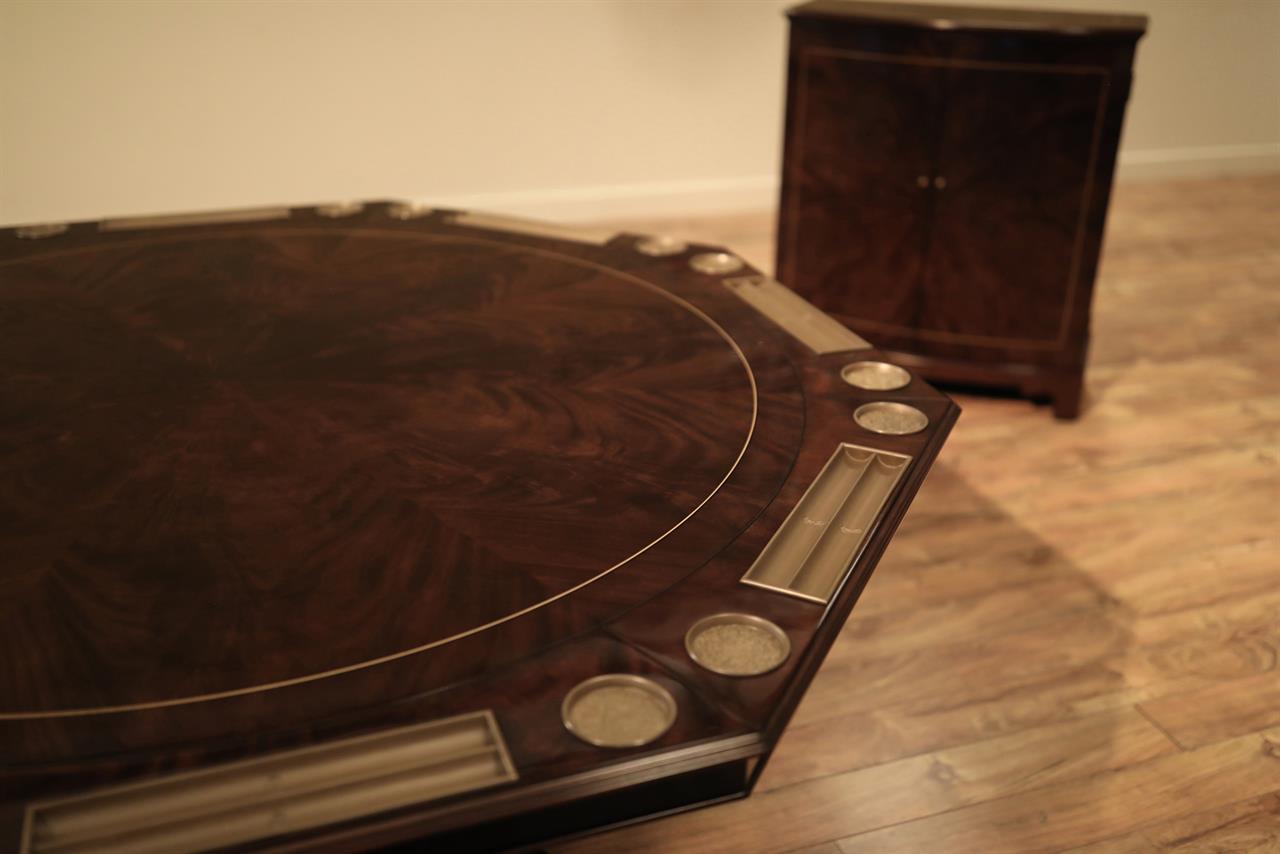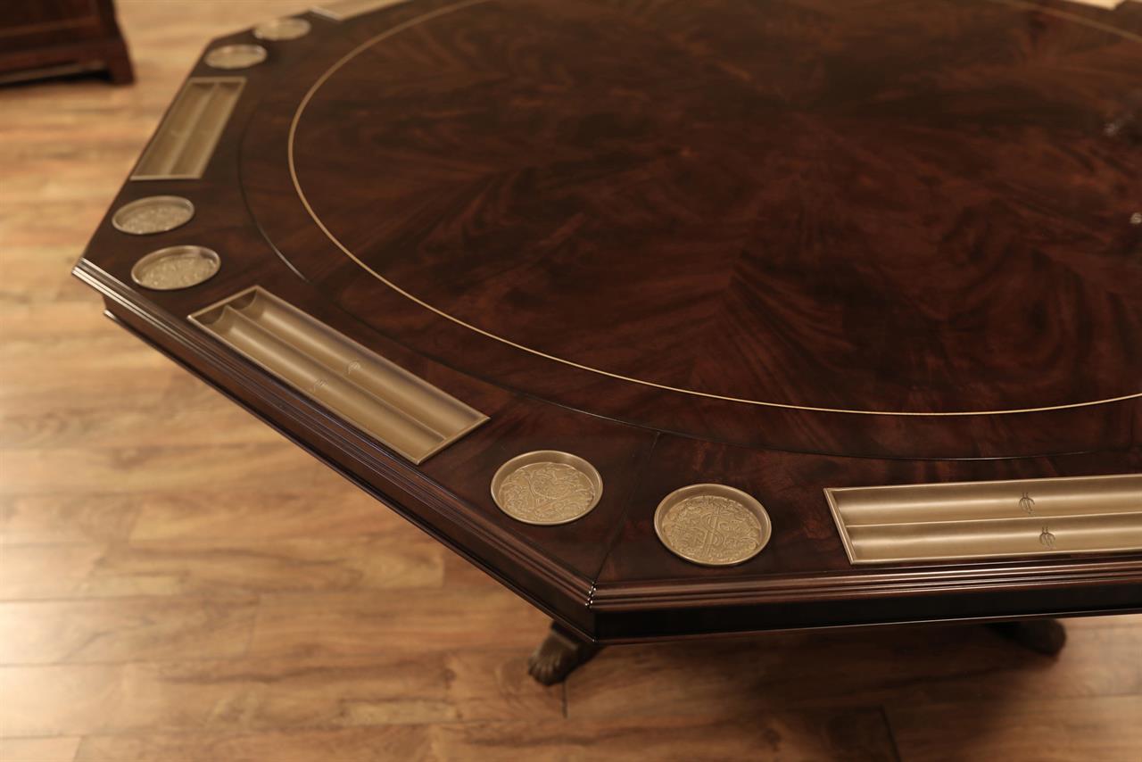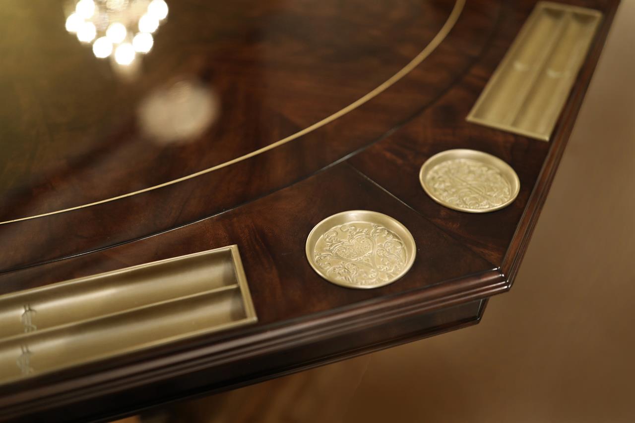 An AP exclusive mahogany poker table and large expanding dining table for seating 6 to 12 people finished in dark walnut (espresso bean brown). This table stands on a wide birdcage pedestal with a turned column. The pedestal has brass-capped feet with custom forged levelers and reinforced saber legs. This is a designer-grade pedestal table made just for our online customers. The top is crafted with pie-cut flame mahogany fletches and a simplistic white and black pinstripe. The table is traditional, but it was designed for today’s current colonial home. The top is decorated with fine black and white separators. Two leaf storage cabinets are included. The larger bowfront cabinet stores the dining table leaves, and the smaller cabinet stores the poker leaves. Both cabinets have a knick-knack drawer on top, and each cabinet has locking doors. The keys and locks are quality components. Each door has drawer pulls, so if you decide not to lock your doors, you can easily open and close these cabinets without reaching for keys. All of the cup holders and chip trays are solid brass. The cup holders are decorated with engraved hearts, spades, clubs, and diamonds. The chip trays are engraved with dollar signs.