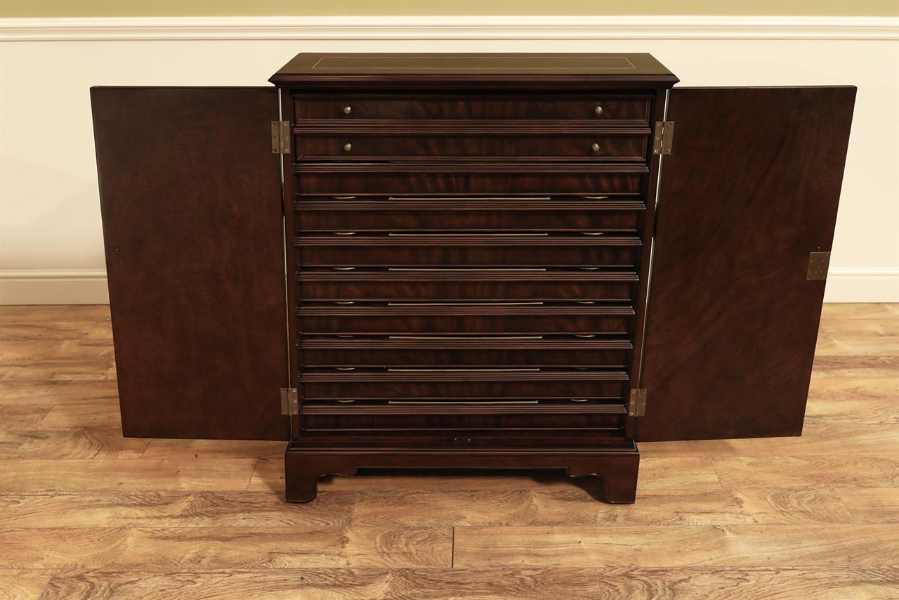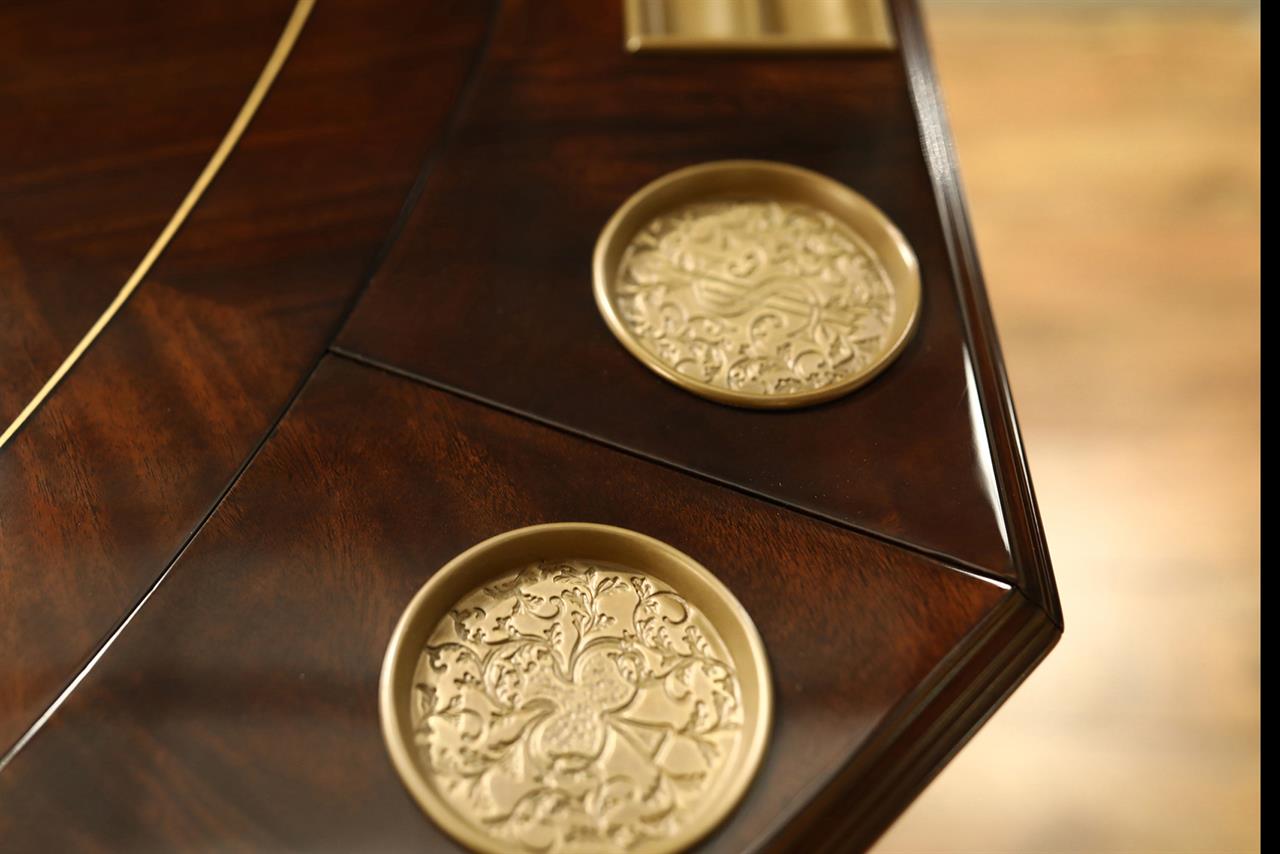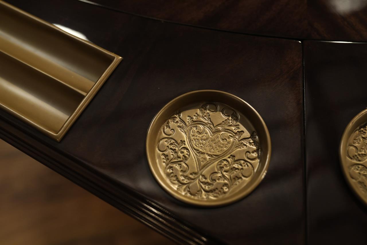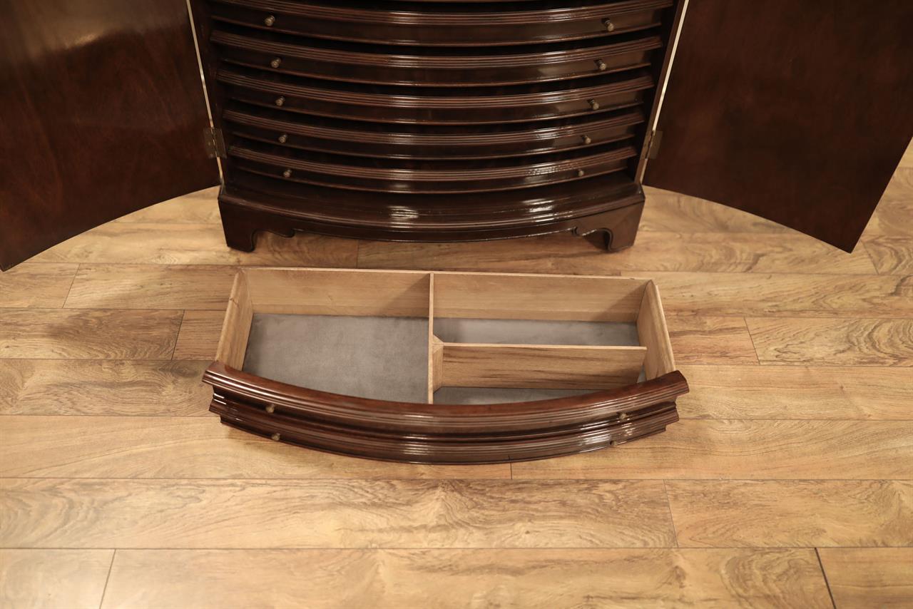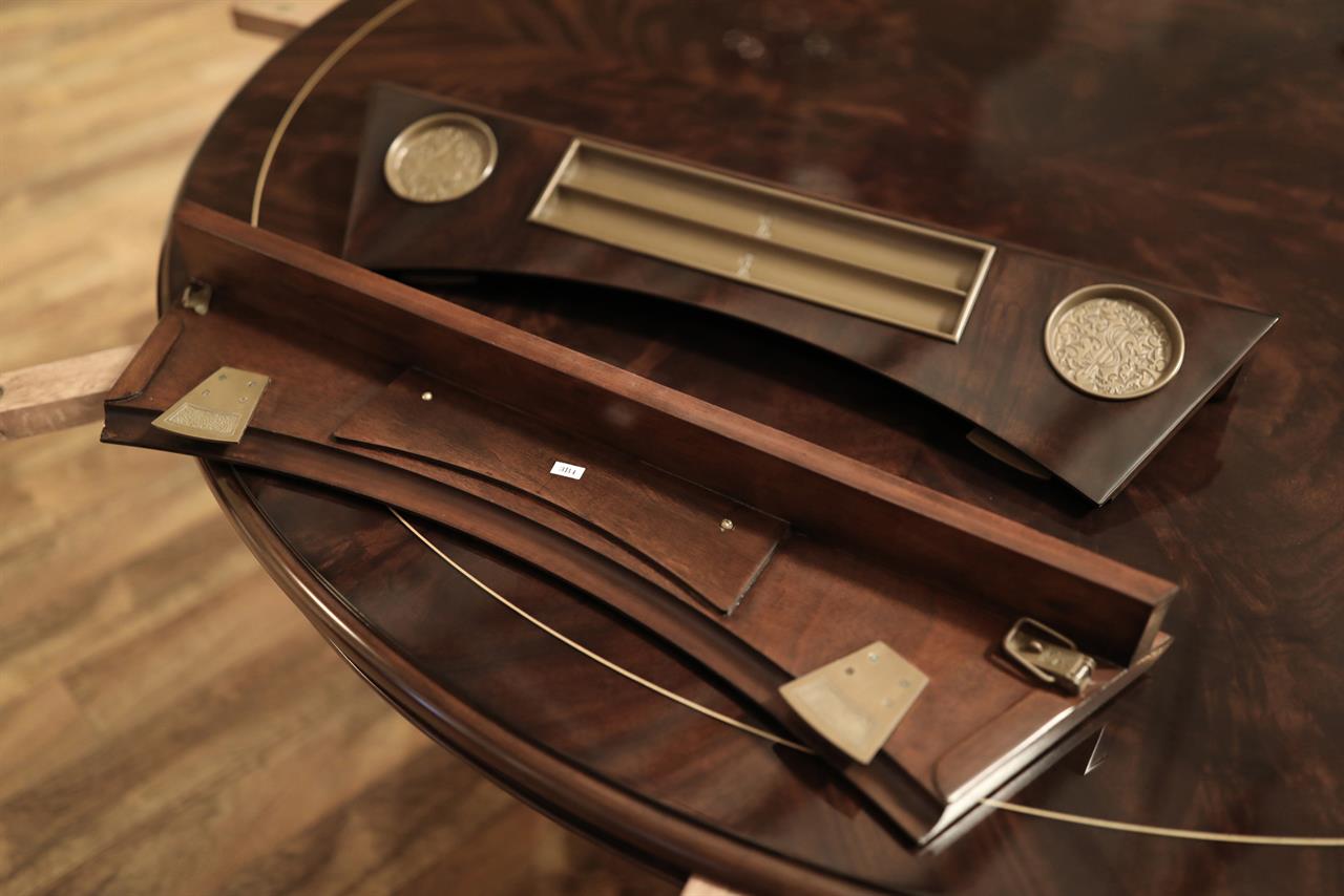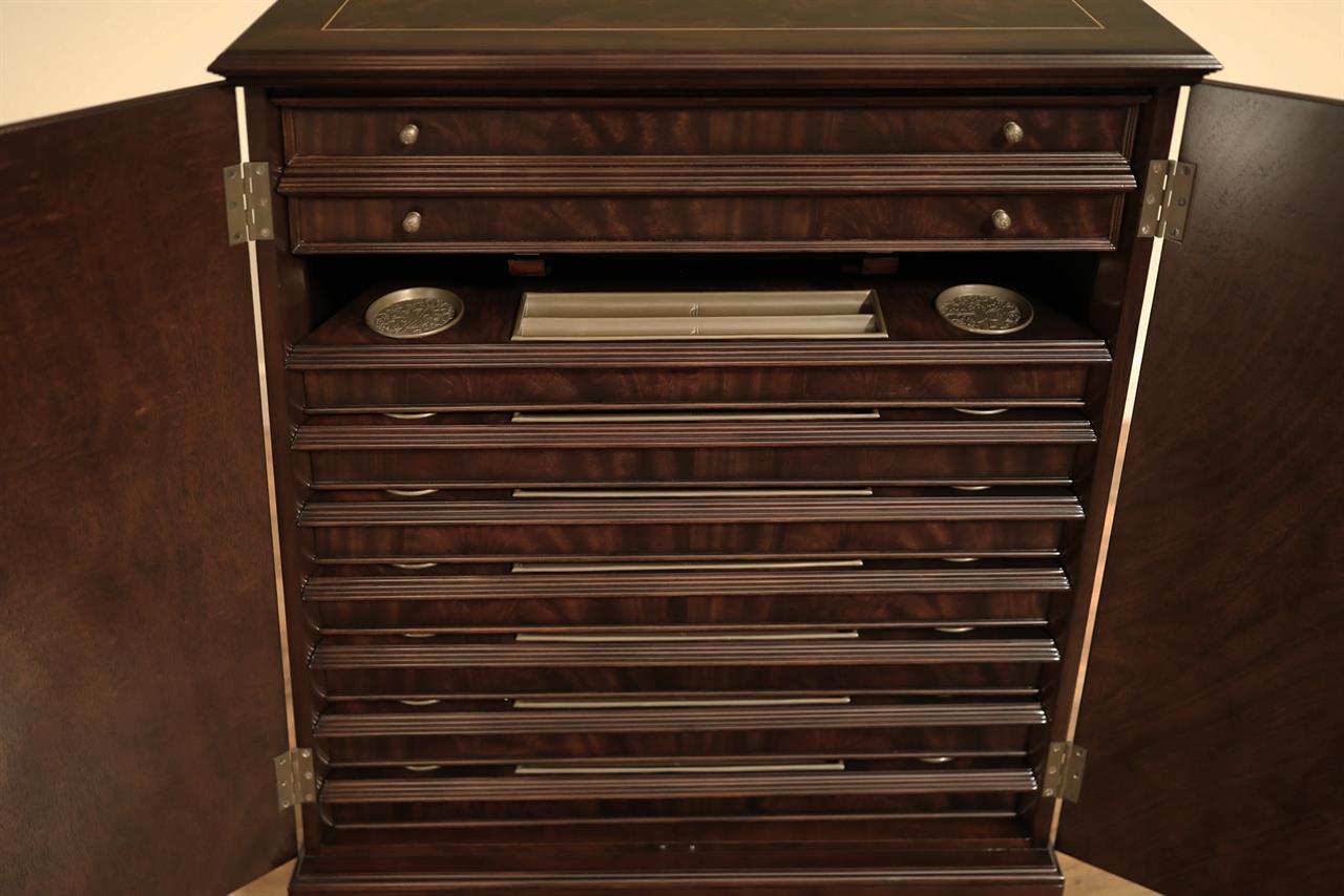 An AP exclusive mahogany poker table and large expanding dining table for seating 6 to 12 people finished in dark walnut (espresso bean brown). This table stands on a wide birdcage pedestal with a turned column. The pedestal has brass-capped feet with custom forged levelers and reinforced saber legs. This is a designer-grade pedestal table made just for our online customers. The top is crafted with pie-cut flame mahogany fletches and a simplistic white and black pinstripe. The table is traditional, but it was designed for today’s current colonial home. The top is decorated with fine black and white separators. Two leaf storage cabinets are included. The larger bowfront cabinet stores the dining table leaves, and the smaller cabinet stores the poker leaves. Both cabinets have a knick-knack drawer on top, and each cabinet has locking doors. The keys and locks are quality components. Each door has drawer pulls, so if you decide not to lock your doors, you can easily open and close these cabinets without reaching for keys. All of the cup holders and chip trays are solid brass. The cup holders are decorated with engraved hearts, spades, clubs, and diamonds. The chip trays are engraved with dollar signs.