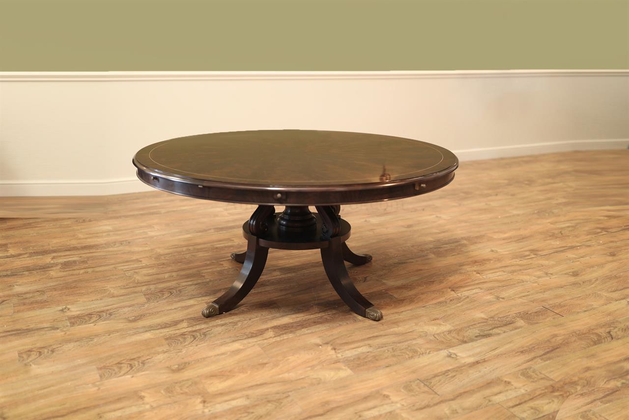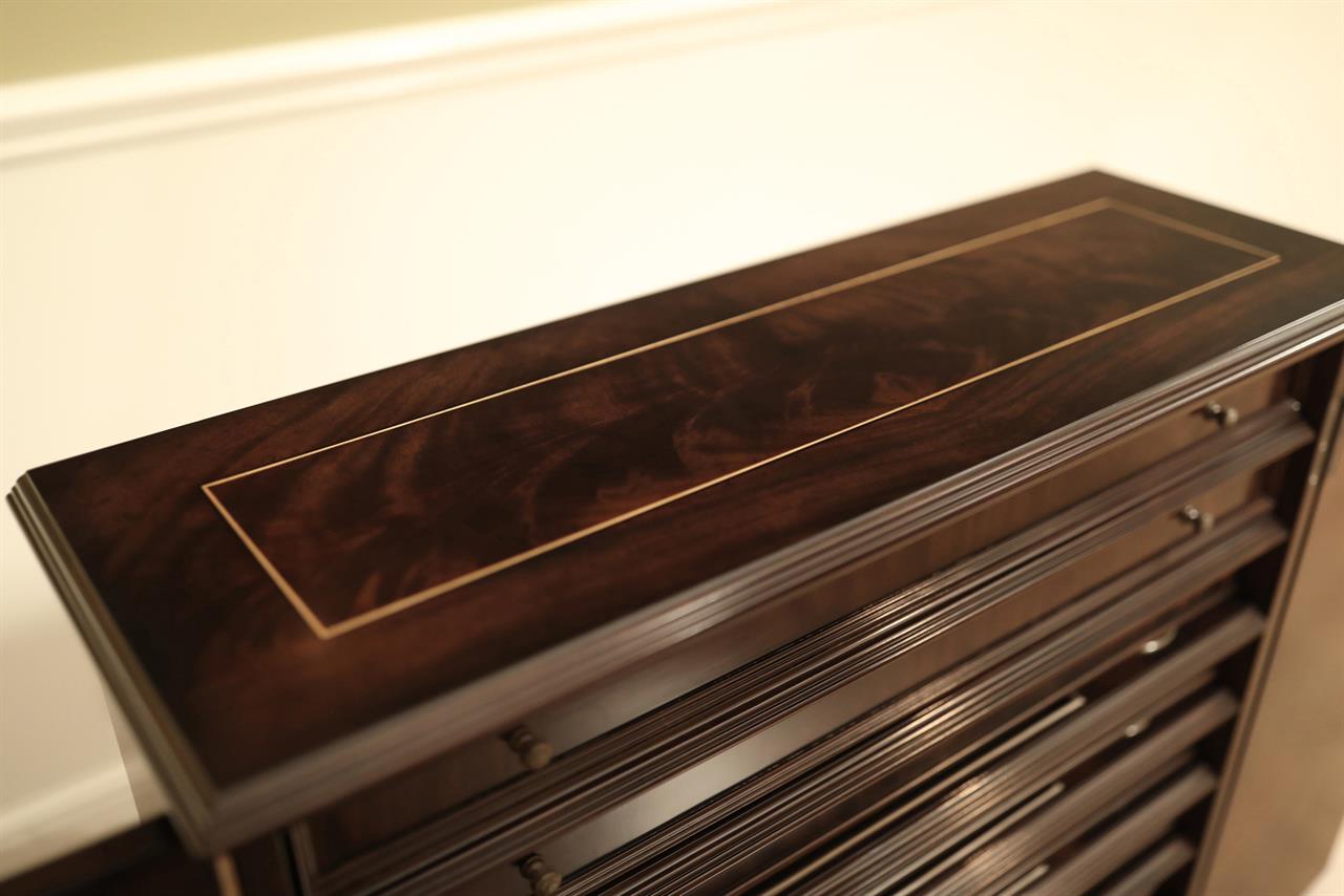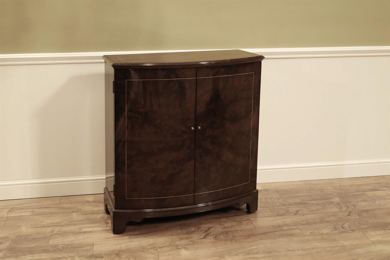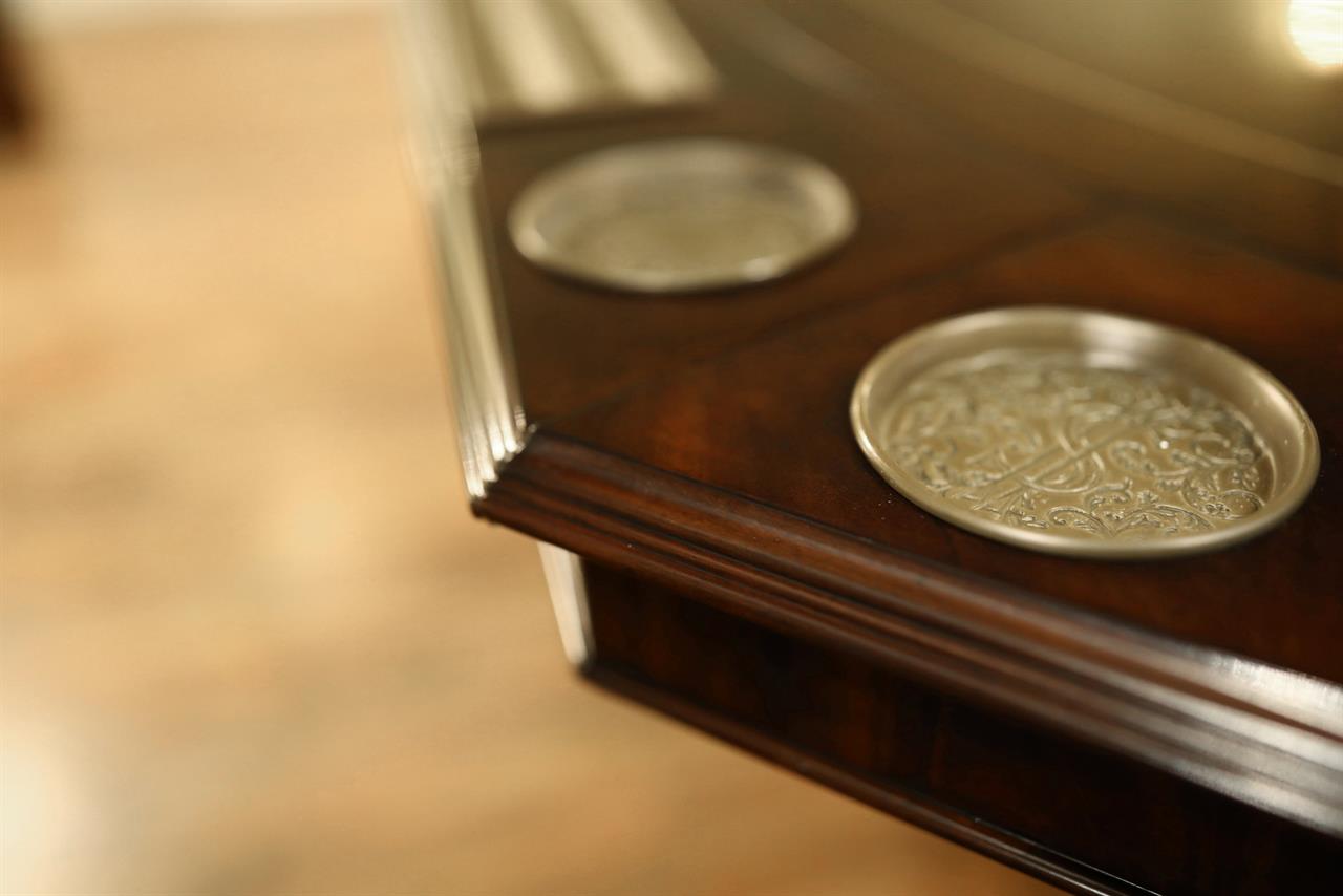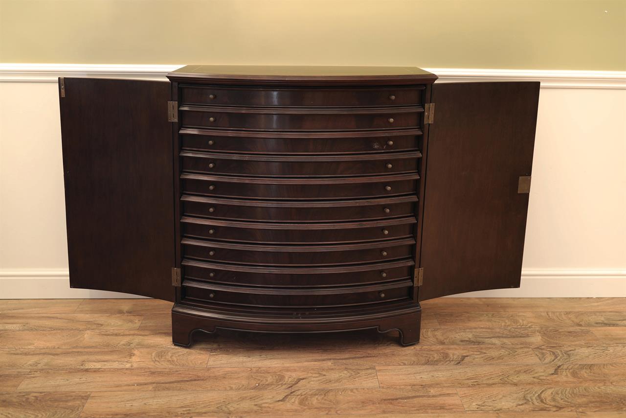 An AP exclusive mahogany poker table and large expanding dining table for seating 6 to 12 people finished in dark walnut (espresso bean brown). This table stands on a wide birdcage pedestal with a turned column. The pedestal has brass-capped feet with custom forged levelers and reinforced saber legs. This is a designer-grade pedestal table made just for our online customers. The top is crafted with pie-cut flame mahogany fletches and a simplistic white and black pinstripe. The table is traditional, but it was designed for today’s current colonial home. The top is decorated with fine black and white separators. Two leaf storage cabinets are included. The larger bowfront cabinet stores the dining table leaves, and the smaller cabinet stores the poker leaves. Both cabinets have a knick-knack drawer on top, and each cabinet has locking doors. The keys and locks are quality components. Each door has drawer pulls, so if you decide not to lock your doors, you can easily open and close these cabinets without reaching for keys. All of the cup holders and chip trays are solid brass. The cup holders are decorated with engraved hearts, spades, clubs, and diamonds. The chip trays are engraved with dollar signs.