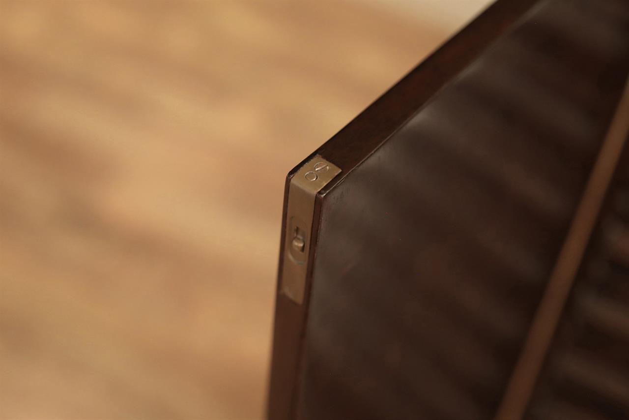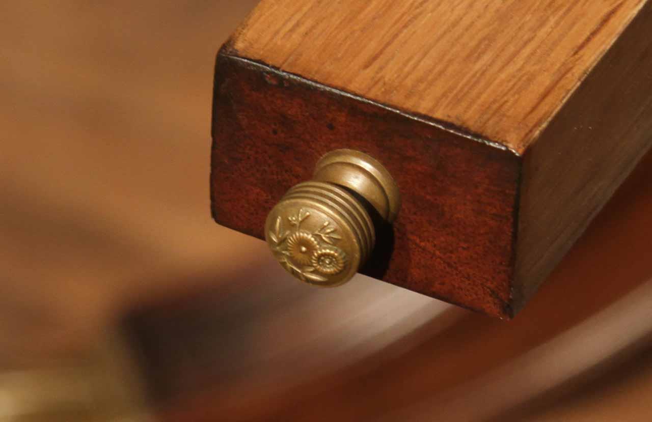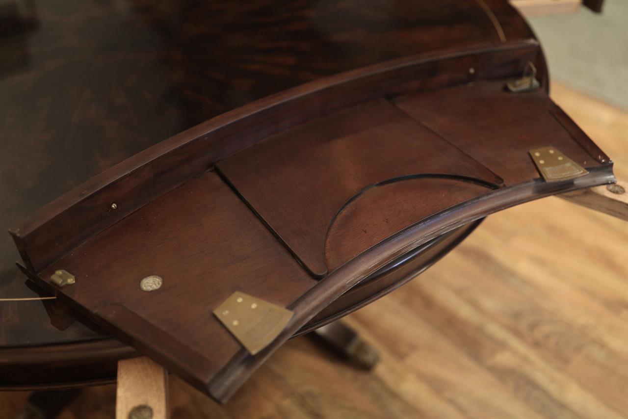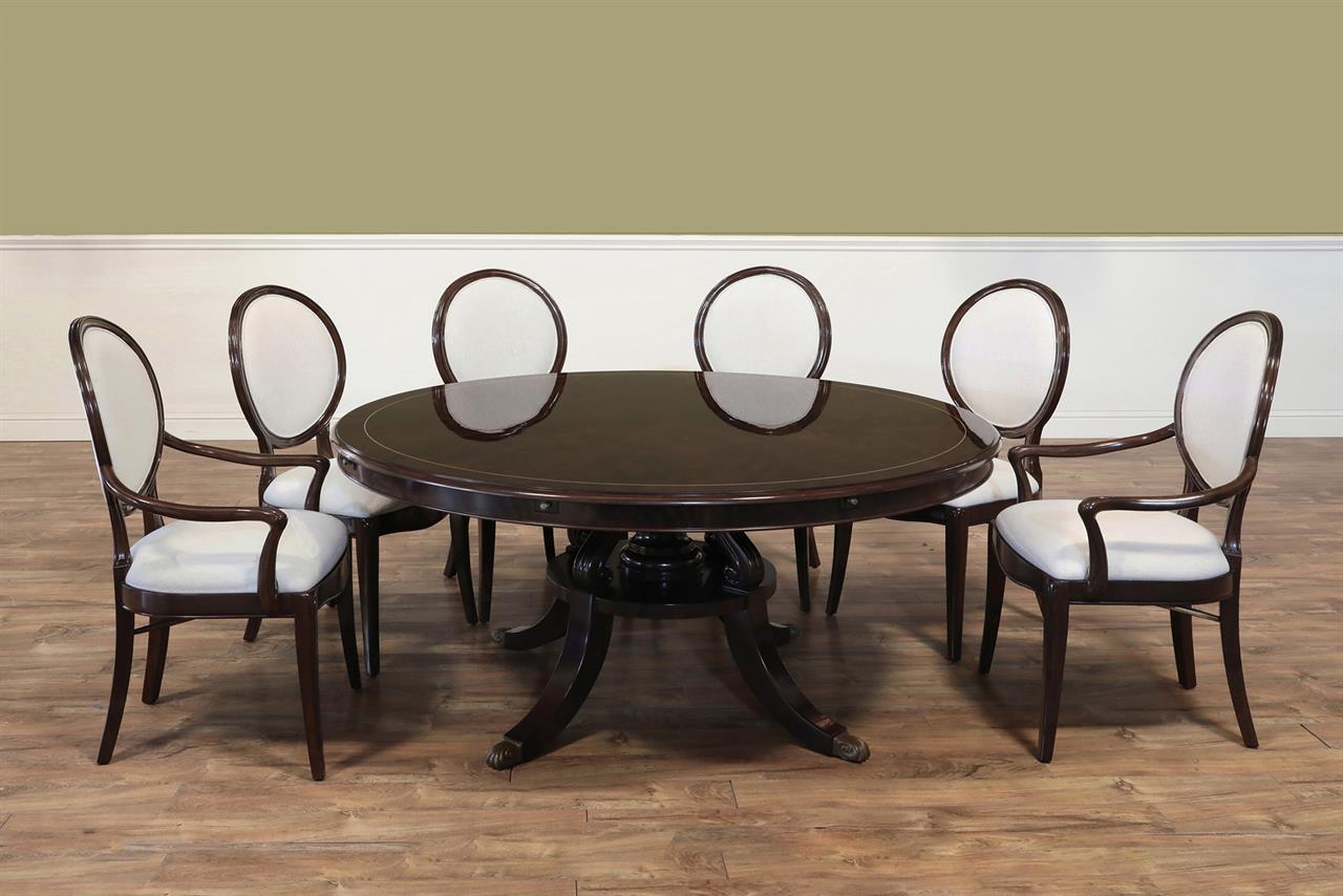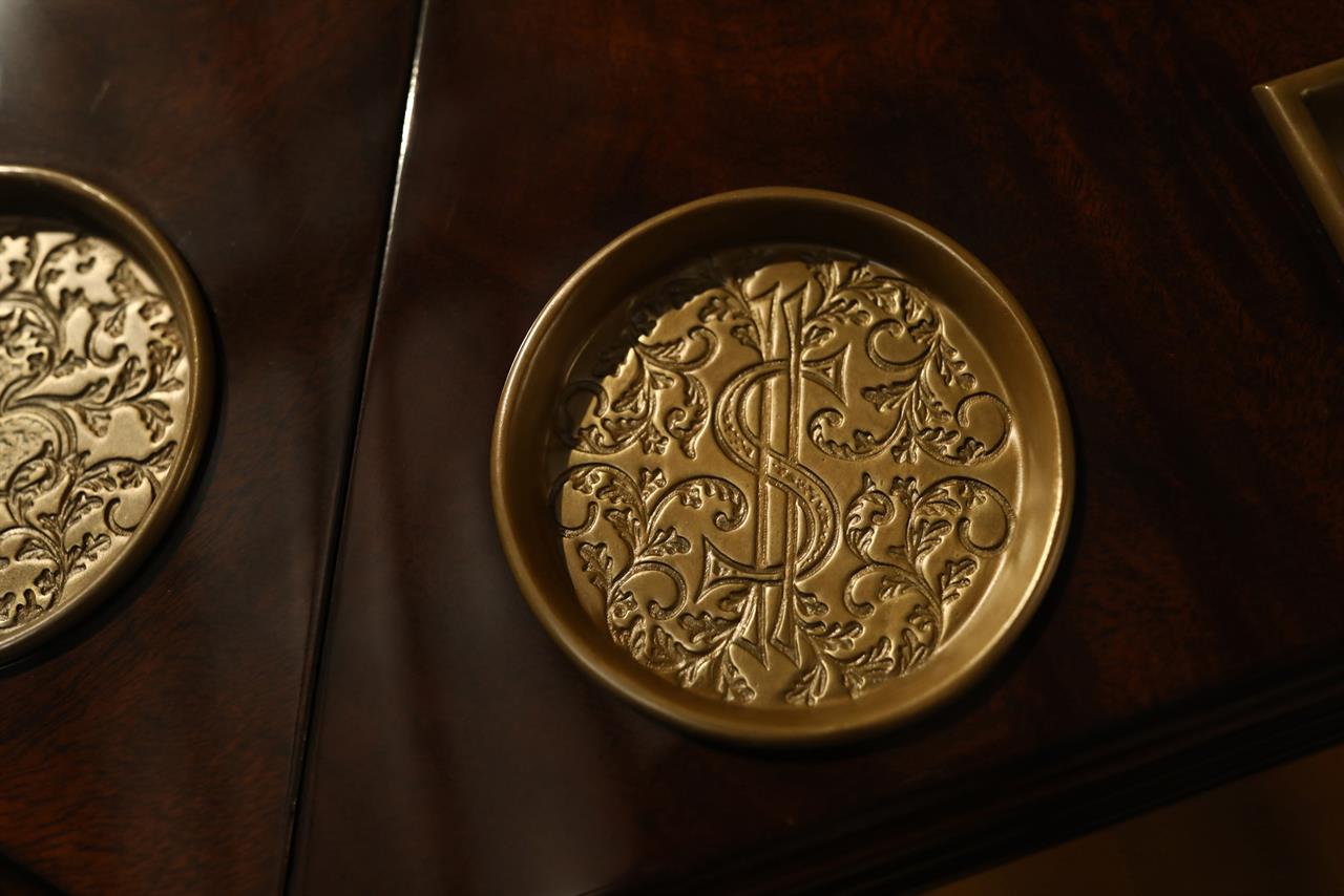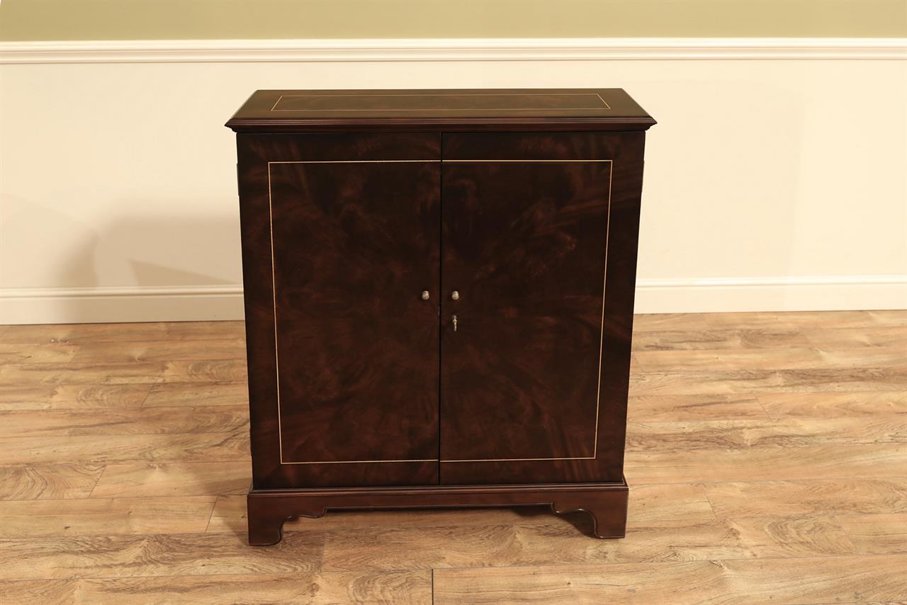 An AP exclusive mahogany poker table and large expanding dining table for seating 6 to 12 people finished in dark walnut (espresso bean brown). This table stands on a wide birdcage pedestal with a turned column. The pedestal has brass-capped feet with custom forged levelers and reinforced saber legs. This is a designer-grade pedestal table made just for our online customers. The top is crafted with pie-cut flame mahogany fletches and a simplistic white and black pinstripe. The table is traditional, but it was designed for today’s current colonial home. The top is decorated with fine black and white separators. Two leaf storage cabinets are included. The larger bowfront cabinet stores the dining table leaves, and the smaller cabinet stores the poker leaves. Both cabinets have a knick-knack drawer on top, and each cabinet has locking doors. The keys and locks are quality components. Each door has drawer pulls, so if you decide not to lock your doors, you can easily open and close these cabinets without reaching for keys. All of the cup holders and chip trays are solid brass. The cup holders are decorated with engraved hearts, spades, clubs, and diamonds. The chip trays are engraved with dollar signs.