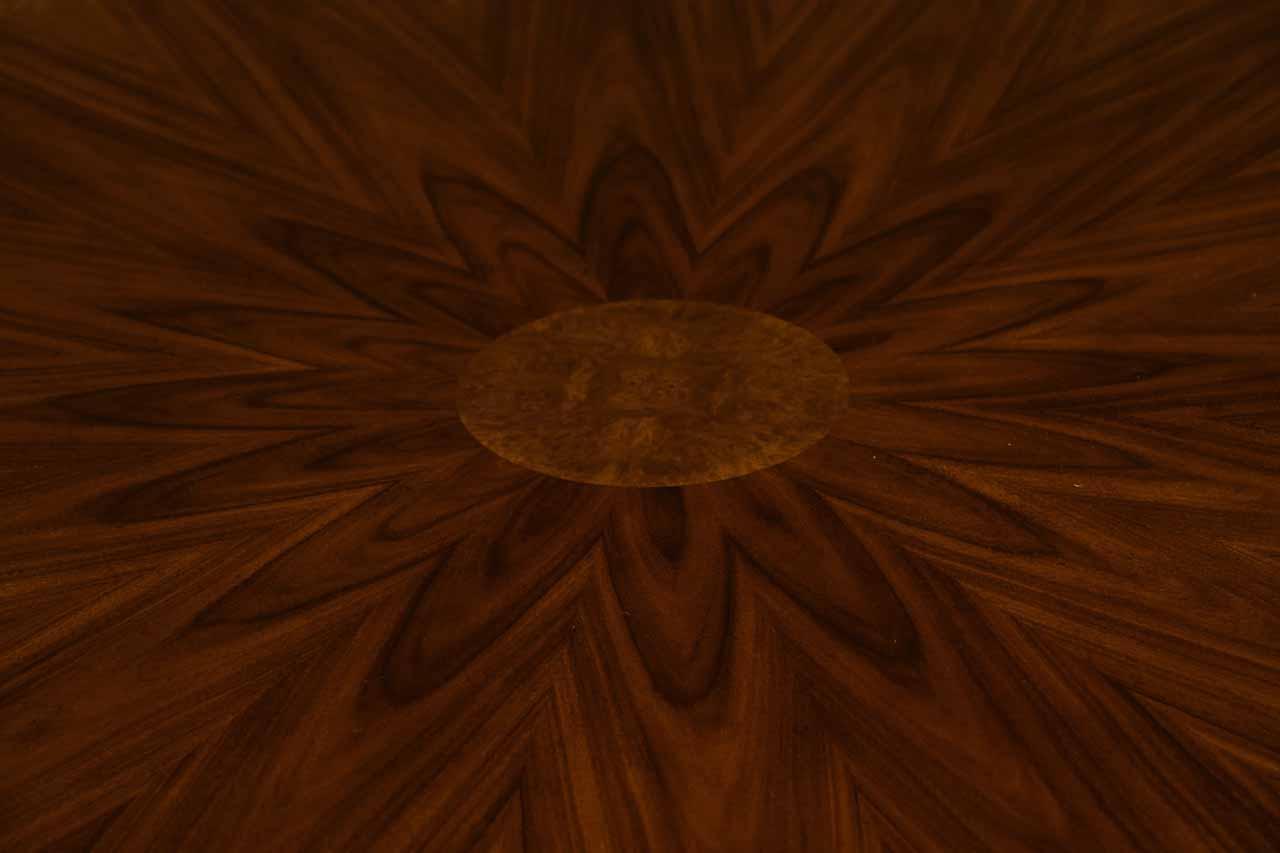 48-inch round mahogany and rosewood pedestal dining or center table. The table measures 30 inches in height and is designed for use as a dining table, but may also function as a foyer or center table. Working drawers and faux drawers alternate around the perimeter. The top features a pie-cut rosewood veneer field banded with pollard, with carved bead detailing along the edge. Brass handles are fitted to the drawers, and the table is supported by a hexagonal column pedestal with outswept legs. Solid brass leaf-cast foot caps with casters complete the base.