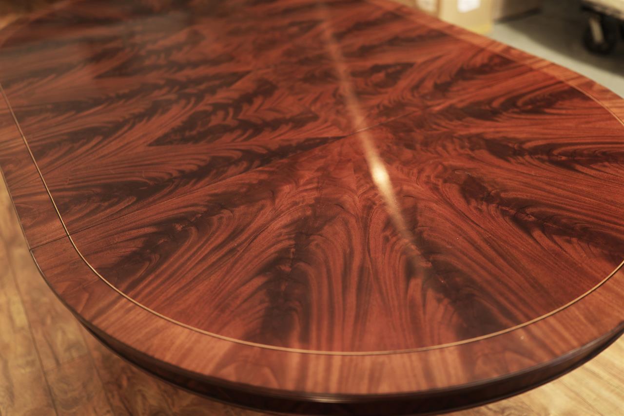 54-inch round mahogany dining table with 2 leaves. This table features custom brass forged hardware, pie cut mahogany field, satinwood border, inlaid black and white separator, and an overbuilt and very sturdy Duncan Phyfe style birdcage pedestal. Steel reinforced saber legs terminating in custom forged tarnished brass feet. These tables are being manufactured exclusively for our store, and you will not find them anywhere else. It is a precise, traditionally made, high-end 18th-century style table. The solid brass foot caps were made in-house using a technique called ’lost wax casting’. These simple brass foot caps are a classic design. The brass feet are also fitted with threaded levels so you will always have a sturdy table. The table halves and leaves lock into place with handmade cam buckles. The loose buckles (when not is use) are held in a snug position under the table by smartly placed hardware.