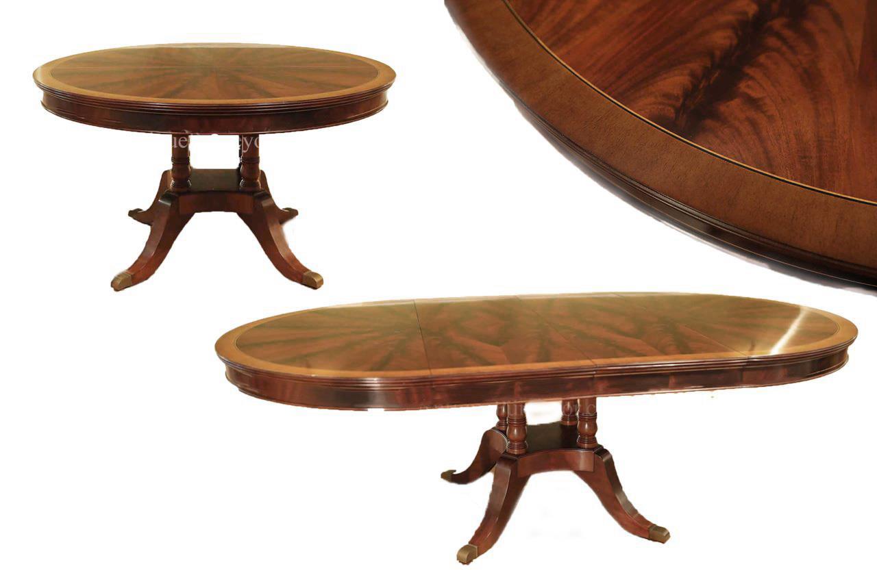 Home » Dining Room » 54″ round to 90″ oval flame mahogany dining table, seats 4 to 8 people.