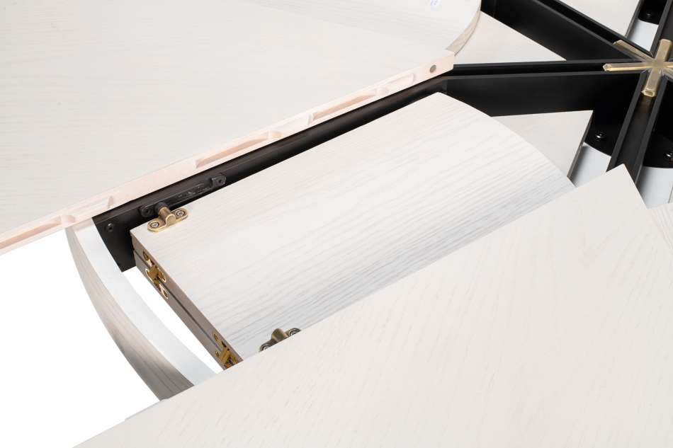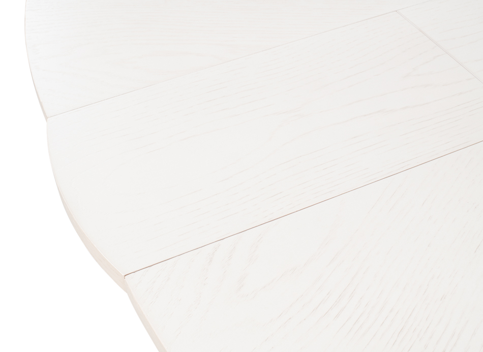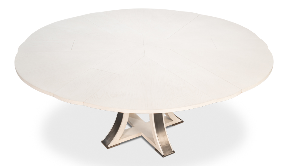 A Transitional expandable Jupe dining table with self-storing leaves, this table opens from 55 inches to 71 inches and seats 4 to 8 people. Modern white finish.