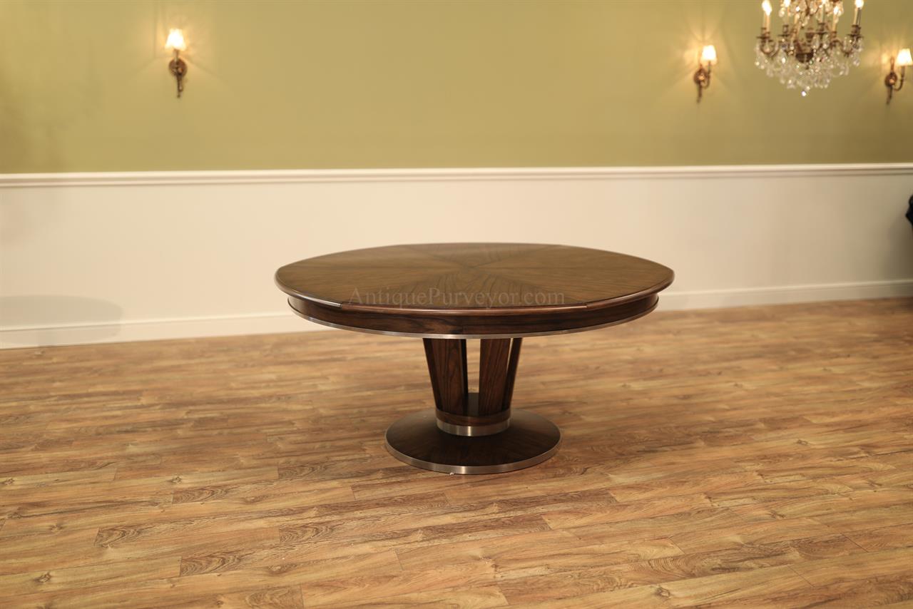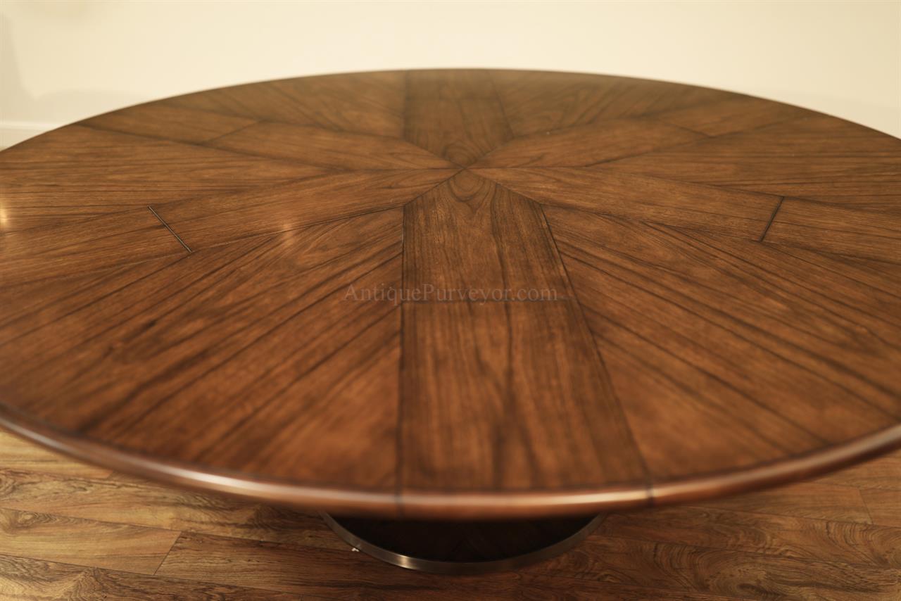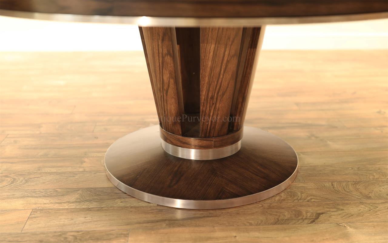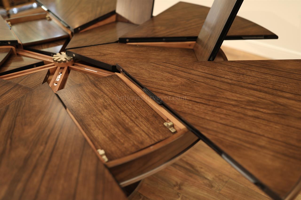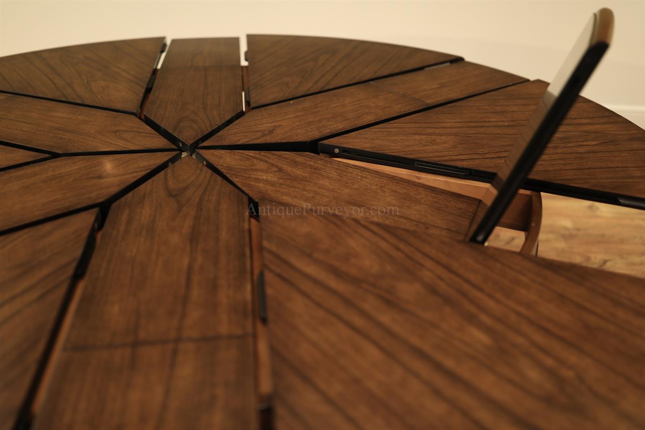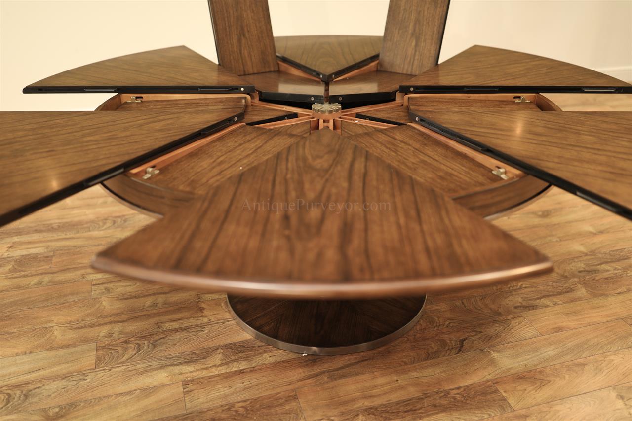 Round expanding dining table featuring a radial Jupe-style expansion mechanism designed to increase the dining surface while maintaining a continuous circular form. The table is constructed with paldao veneer and presented in a dark Palladio finish, creating a contemporary appearance defined by a smooth round top and a sculptural pedestal base. The tabletop is formed with segmented sections that radiate outward as the table expands. These panels move evenly from the center through an extruded aluminum mechanism engineered for controlled and balanced operation. As the sections open, the table increases in diameter while preserving the round geometry that defines its architectural profile. A central pedestal base supports the structure, concentrating the visual mass beneath the middle of the table and allowing unobstructed seating around the perimeter. The edge of the top is accented with a metal band that introduces a subtle contrast against the darker wood surface. The result is a mechanically sophisticated expanding dining table combining modern materials, a clean pedestal form, and a radial expansion system suited for dining rooms requiring flexible seating capacity.