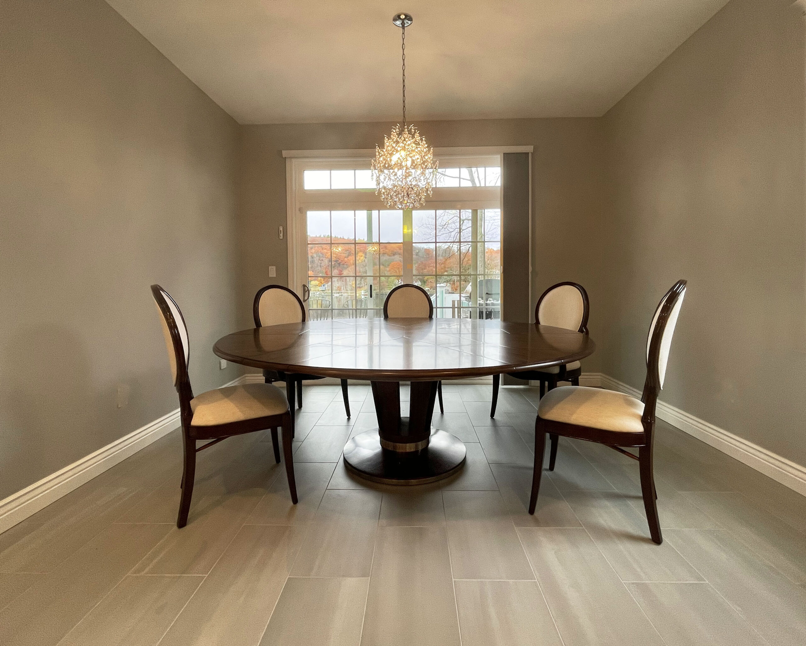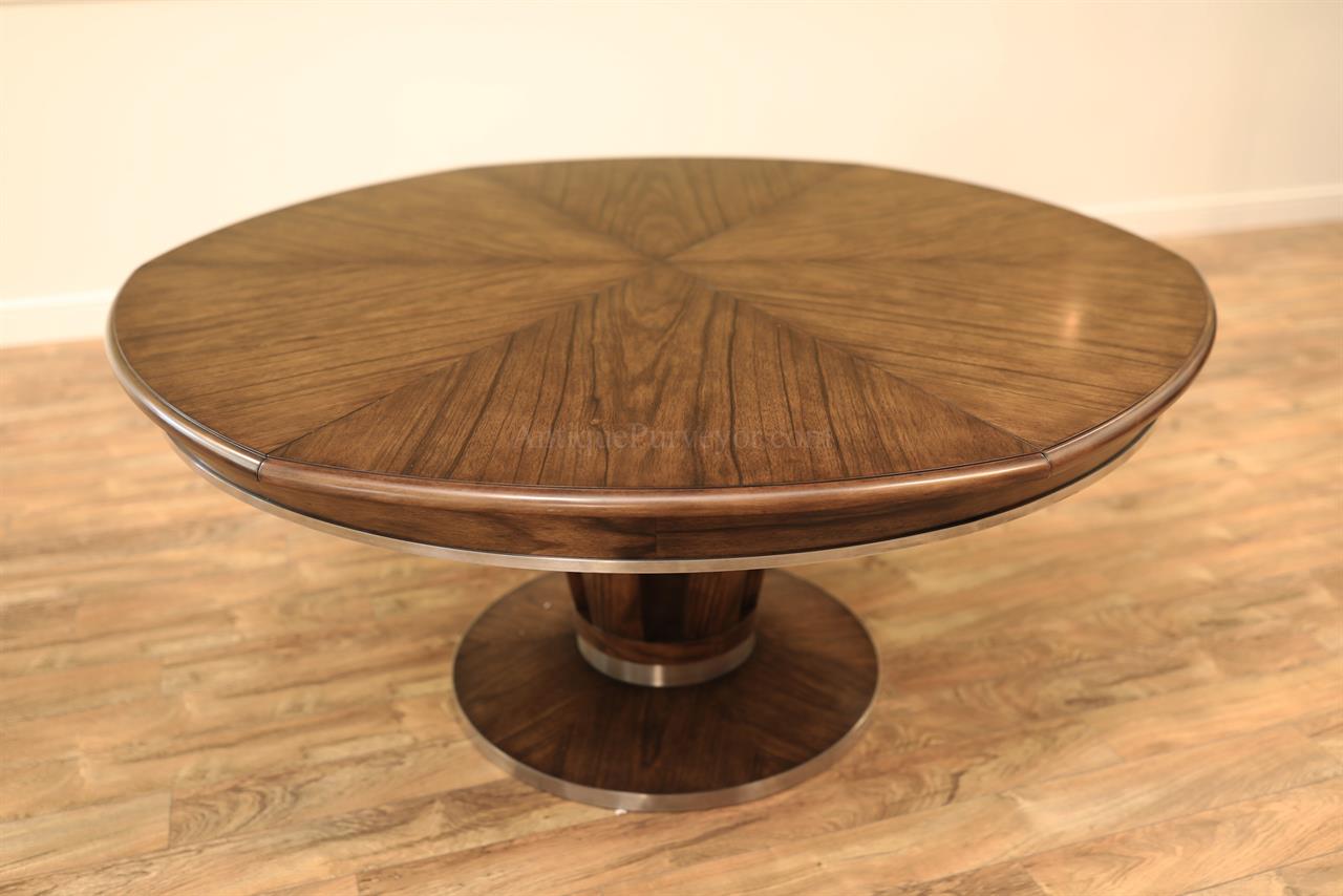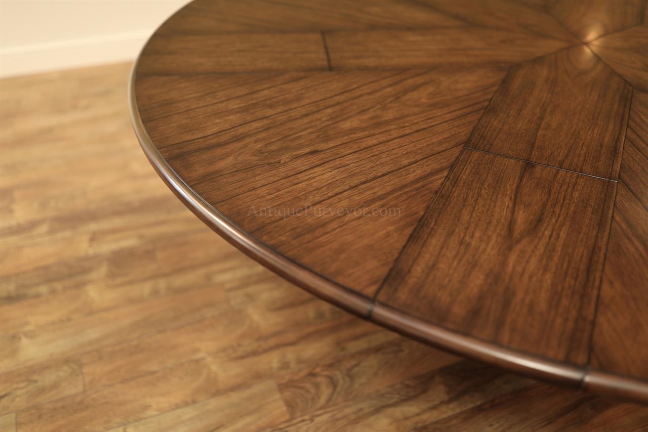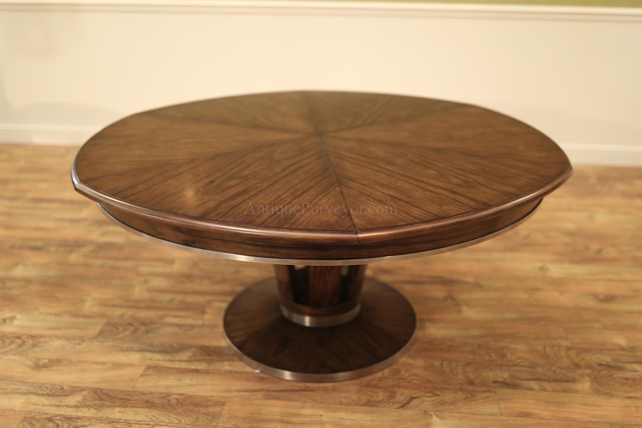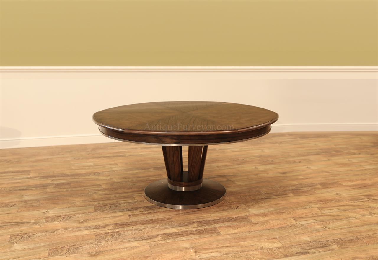 Round expanding dining table featuring a radial Jupe-style expansion mechanism designed to increase the dining surface while maintaining a continuous circular form. The table is constructed with paldao veneer and presented in a dark Palladio finish, creating a contemporary appearance defined by a smooth round top and a sculptural pedestal base. The tabletop is formed with segmented sections that radiate outward as the table expands. These panels move evenly from the center through an extruded aluminum mechanism engineered for controlled and balanced operation. As the sections open, the table increases in diameter while preserving the round geometry that defines its architectural profile. A central pedestal base supports the structure, concentrating the visual mass beneath the middle of the table and allowing unobstructed seating around the perimeter. The edge of the top is accented with a metal band that introduces a subtle contrast against the darker wood surface. The result is a mechanically sophisticated expanding dining table combining modern materials, a clean pedestal form, and a radial expansion system suited for dining rooms requiring flexible seating capacity.