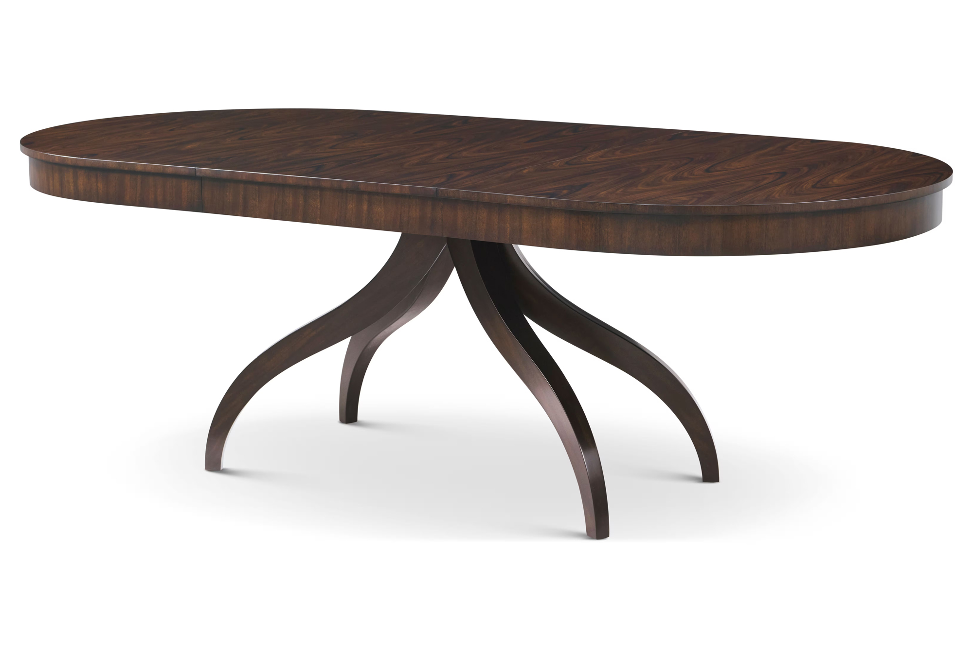 Expanding oval dining table featuring figured walnut veneers with refined linear detailing. The fixed top is supported by tapered legs with subtle architectural accents, offering a clean, transitional profile suitable for both formal and casual dining settings.
