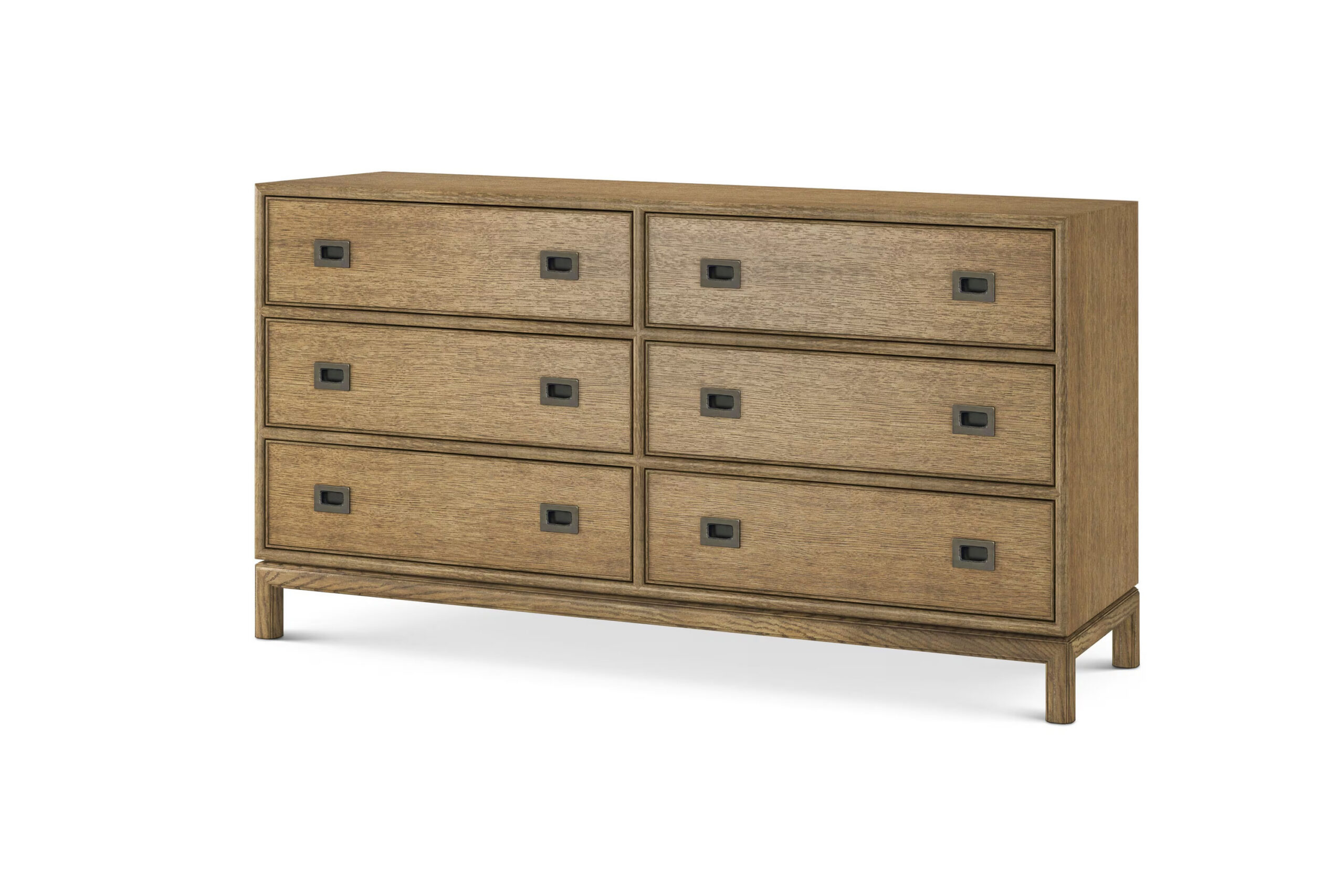 A six drawer dresser constructed in oak, featuring a clean-lined form with subtle detailing across the surface. The design emphasizes a restrained, rectilinear structure with minimal applied ornament, allowing the wood surface and grain to define the overall character. The dresser follows a balanced layout suited to a range of storage or display applications, with structural configuration not specified in the provided input. The detailing introduces surface variation without interrupting the primary form. This format is suited for interiors where a simplified wood profile and adaptable finish options support both transitional and contemporary environments.