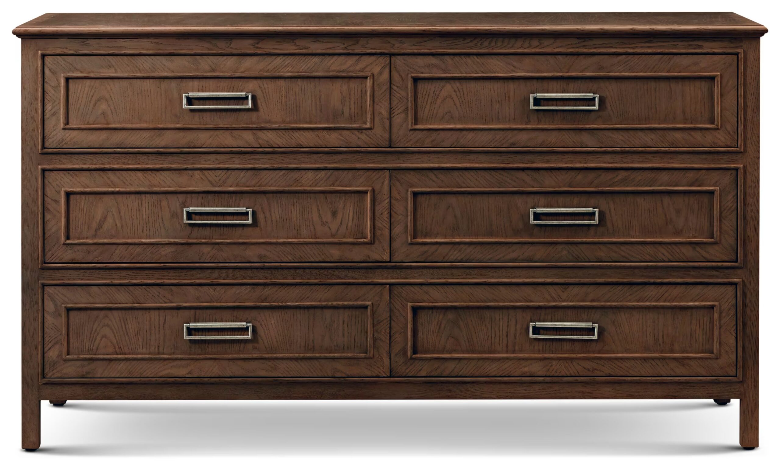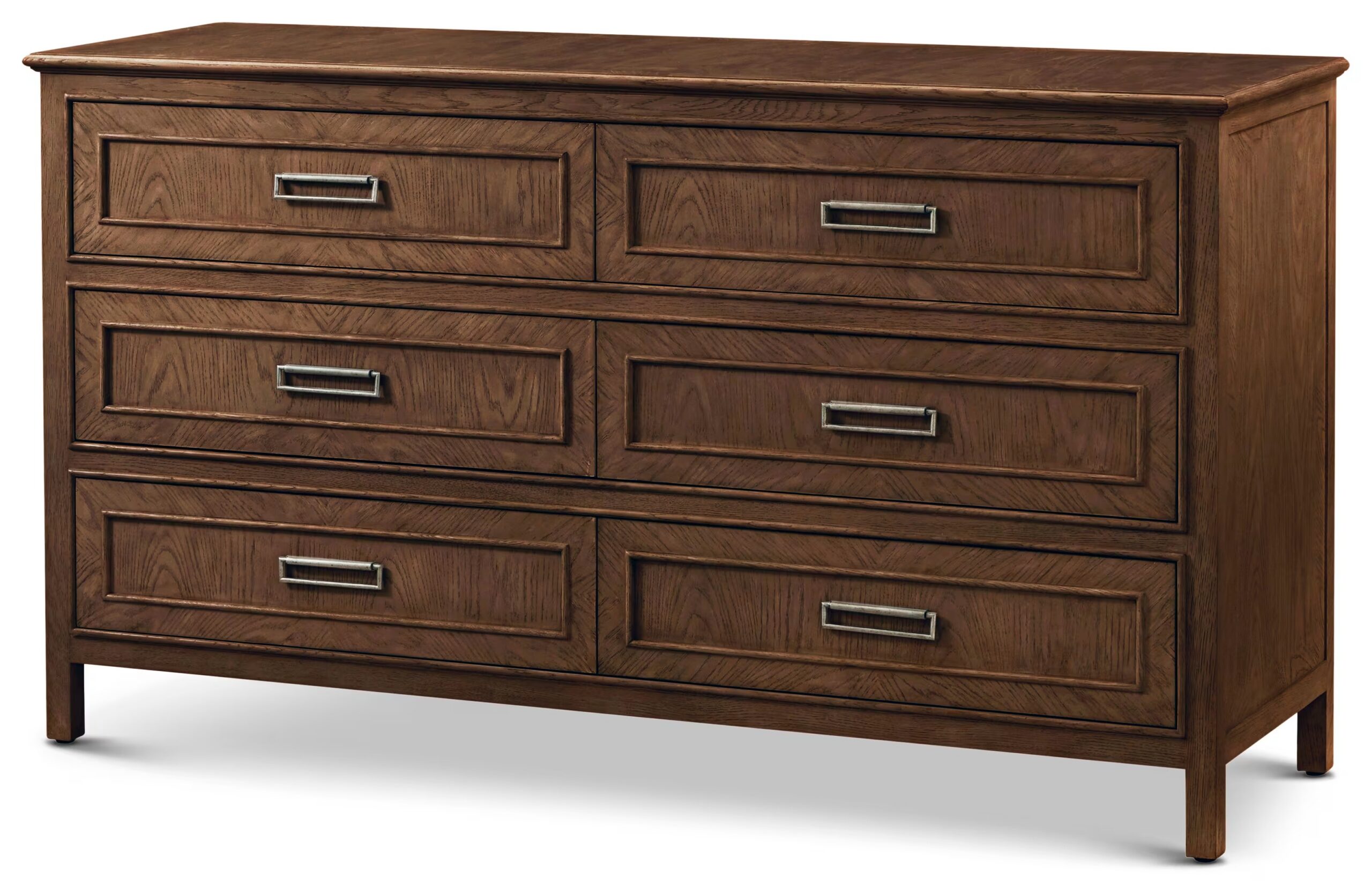 A six-drawer dresser constructed in oak with veneered surfaces, featuring a rectilinear case arranged in a balanced drawer layout. The top and drawer fronts present a continuous veneered surface, allowing the wood grain to define the overall character. The drawer configuration provides six storage compartments across the front, each integrated within a structured case format.