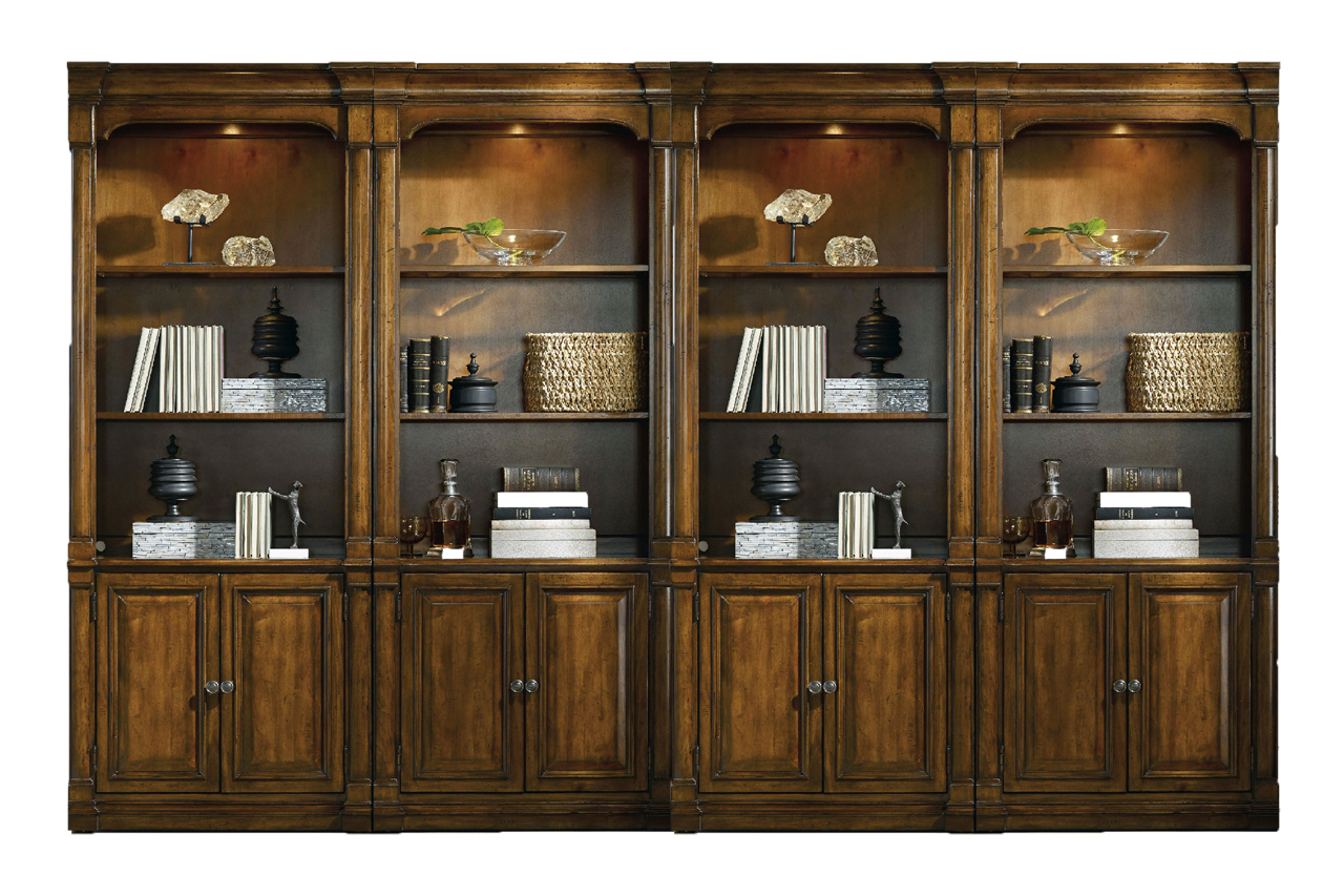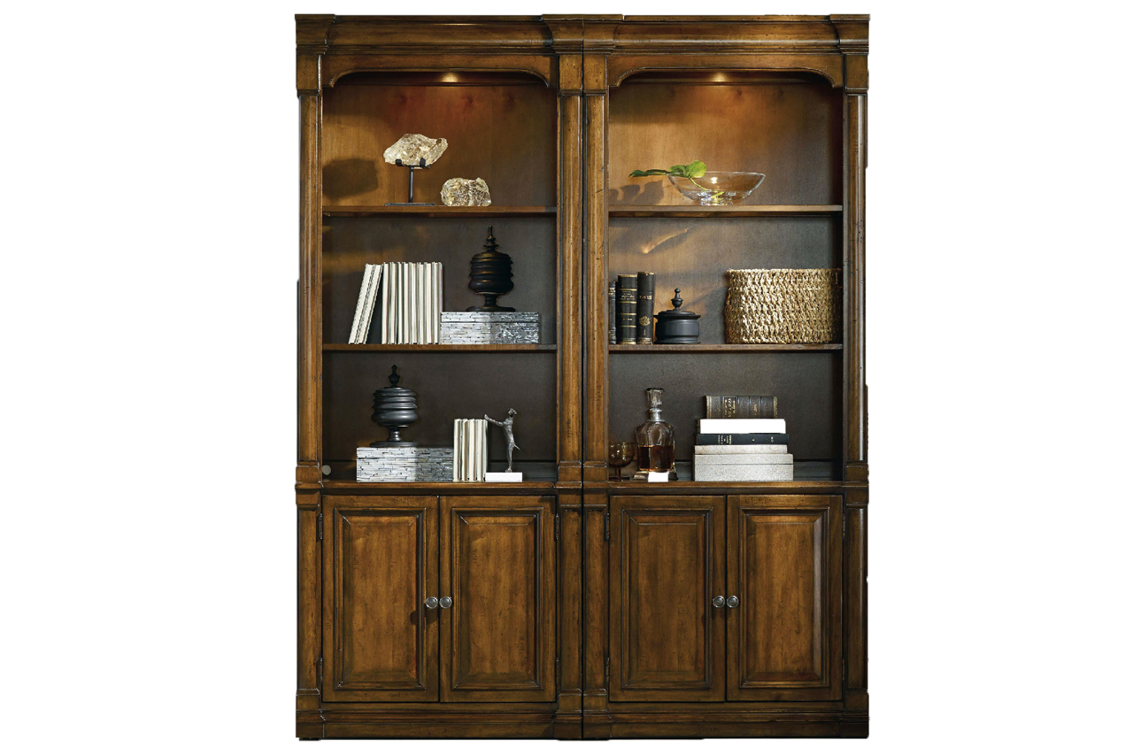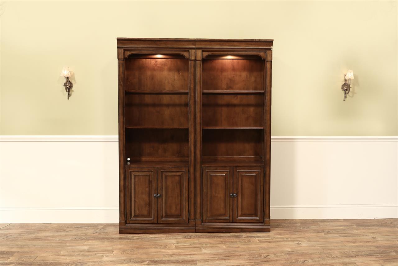 Historic traditional bookcase with columns, lower storage, open shelving, and a lighted display case. Finished in a warm brown tone with factory-distressed character. These bookcases can be used individually or in groups to create a longer display arrangement. The bookcase has one adjustable wood-framed glass shelf (to allow light to pass through), one adjustable solid shelf, and two doors with an adjustable shelf behind them. It also features interior lighting with a three-intensity touch switch. This product listing is for ONE bookcase, although we illustrate how they can be used together as intended.