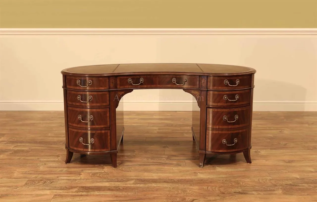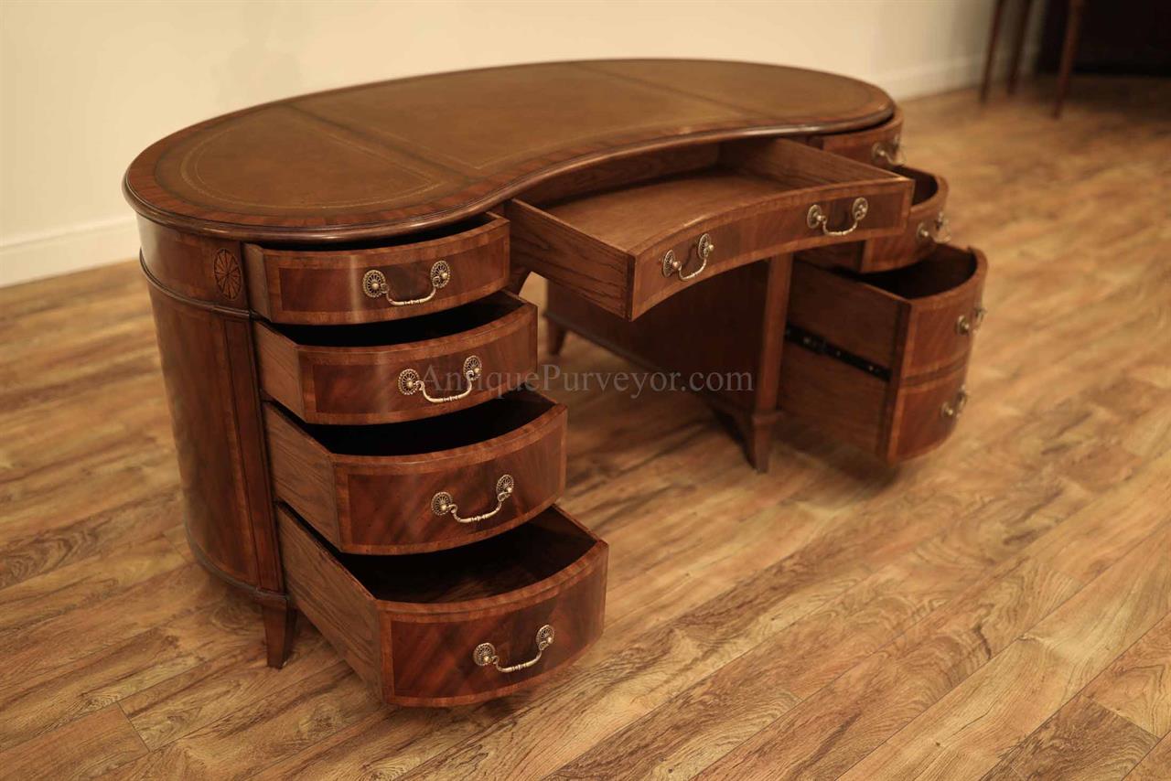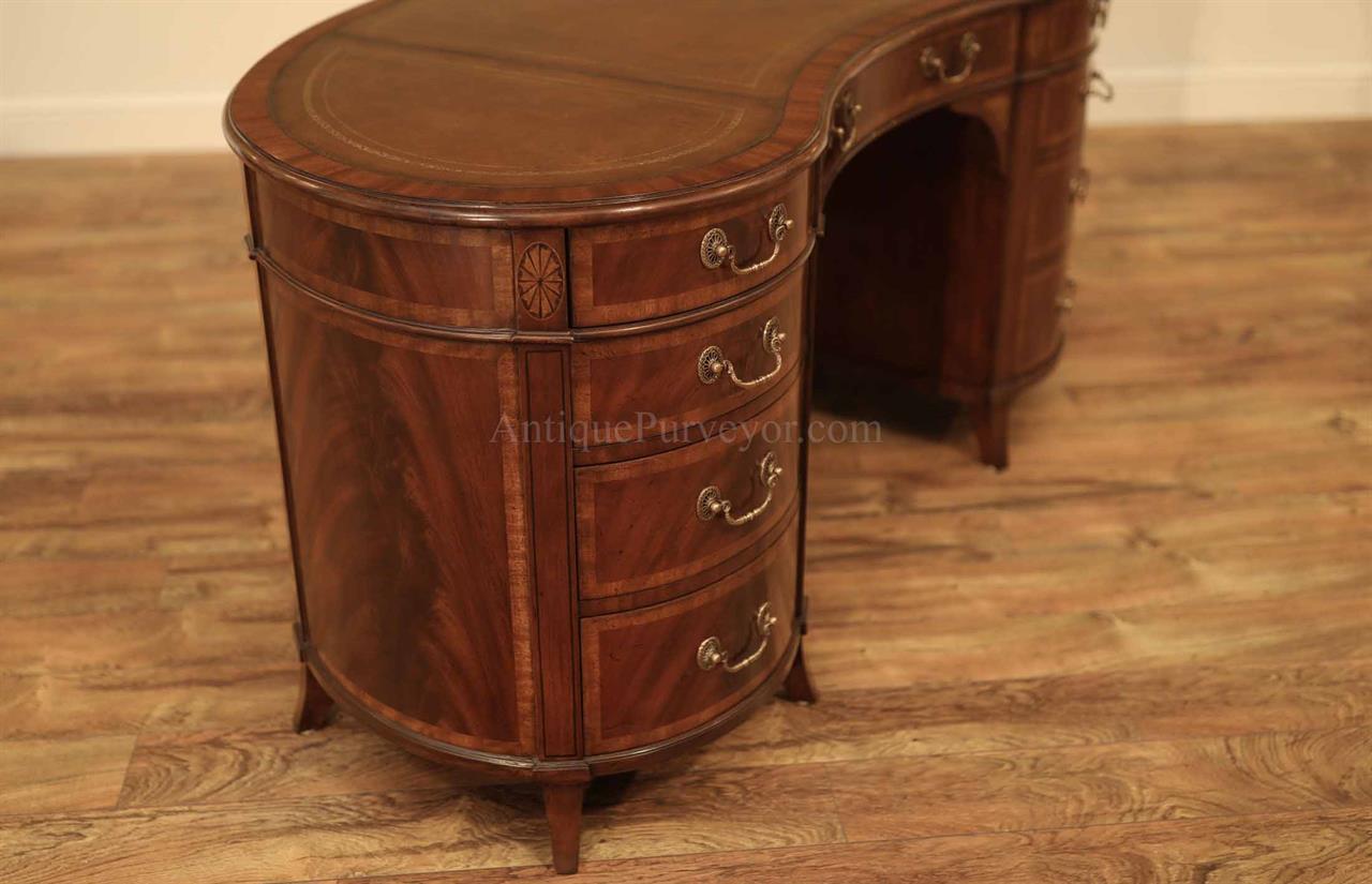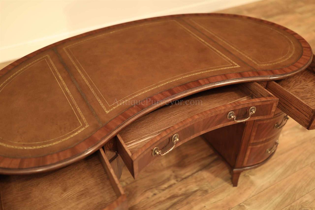 Mahogany and leather top kidney desk. Leather inset top with gold tooling. Banded mahogany drawers and quality brass hardware. Traditional saber leg kidney desk can be used as a writing desk or vanity for a bedroom. This cabinet is a high end desk by an English cabinetmaker. This is a showroom sample and currently available.