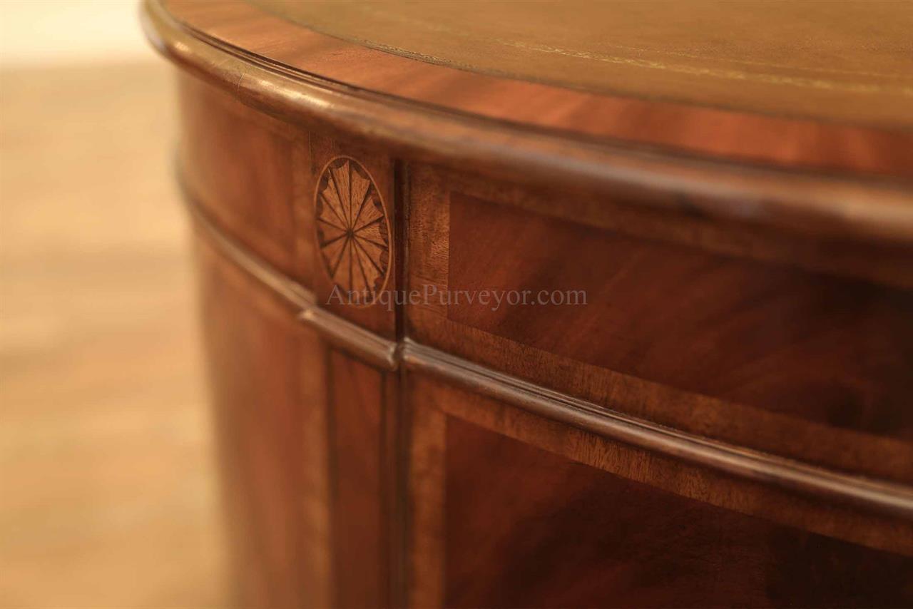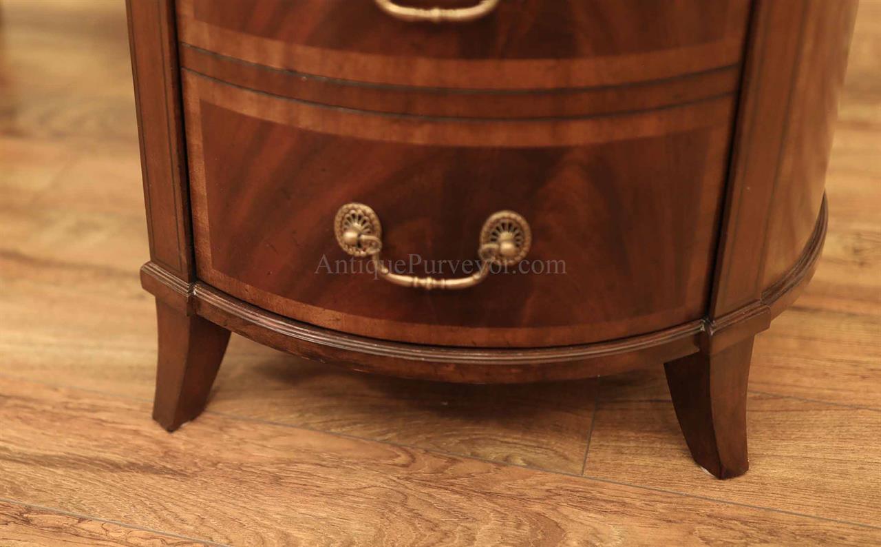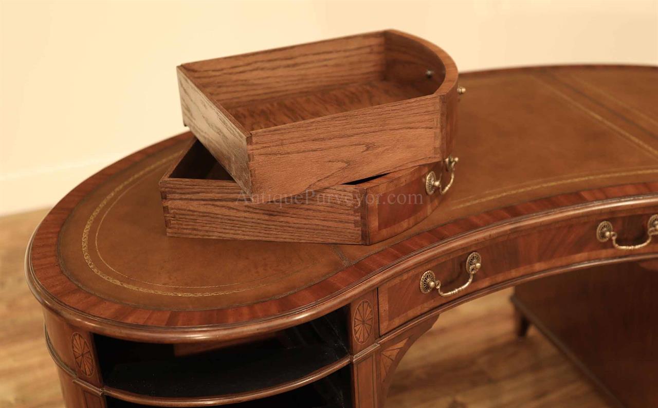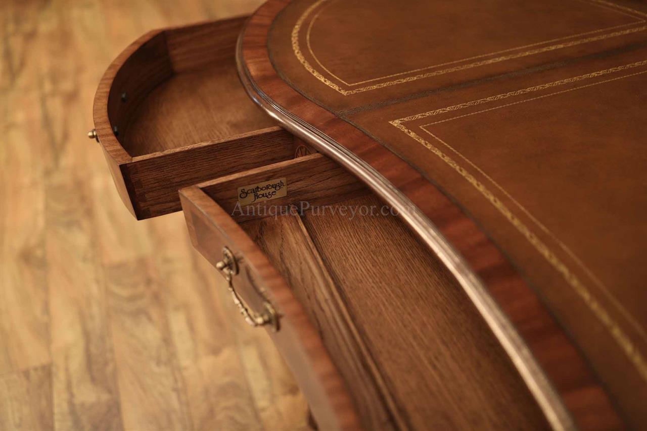 Mahogany and leather top kidney desk. Leather inset top with gold tooling. Banded mahogany drawers and quality brass hardware. Traditional saber leg kidney desk can be used as a writing desk or vanity for a bedroom. This cabinet is a high end desk by an English cabinetmaker. This is a showroom sample and currently available.