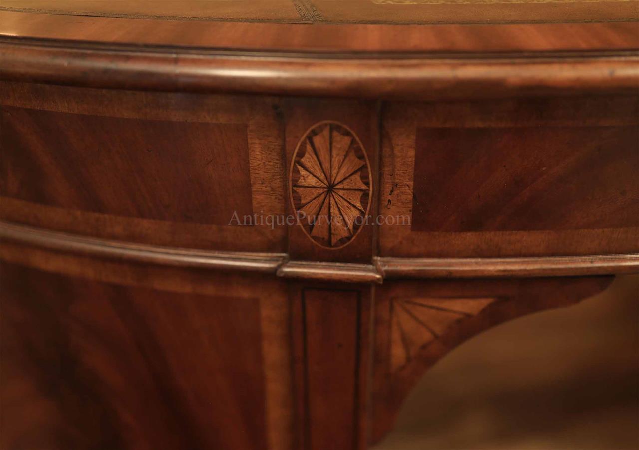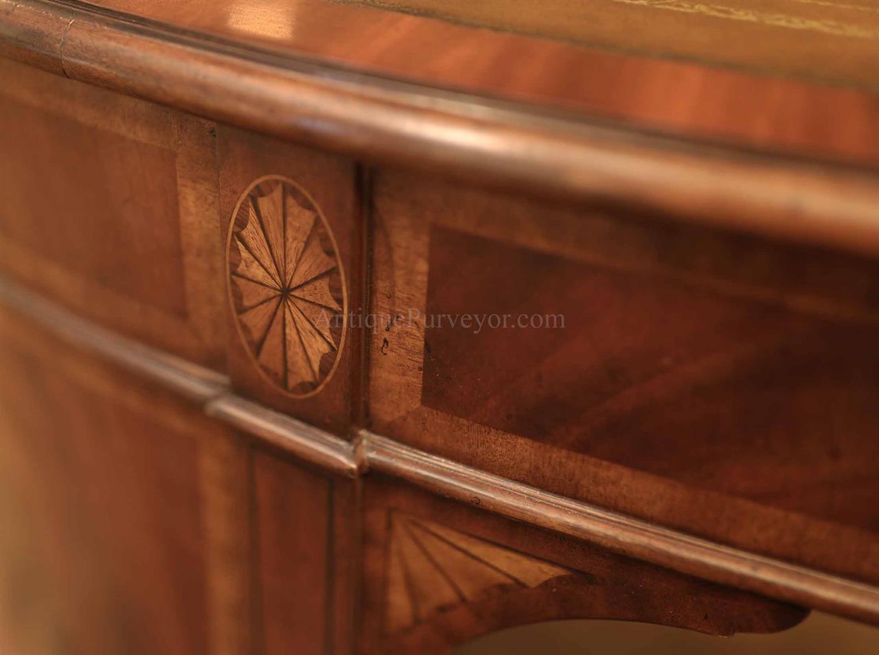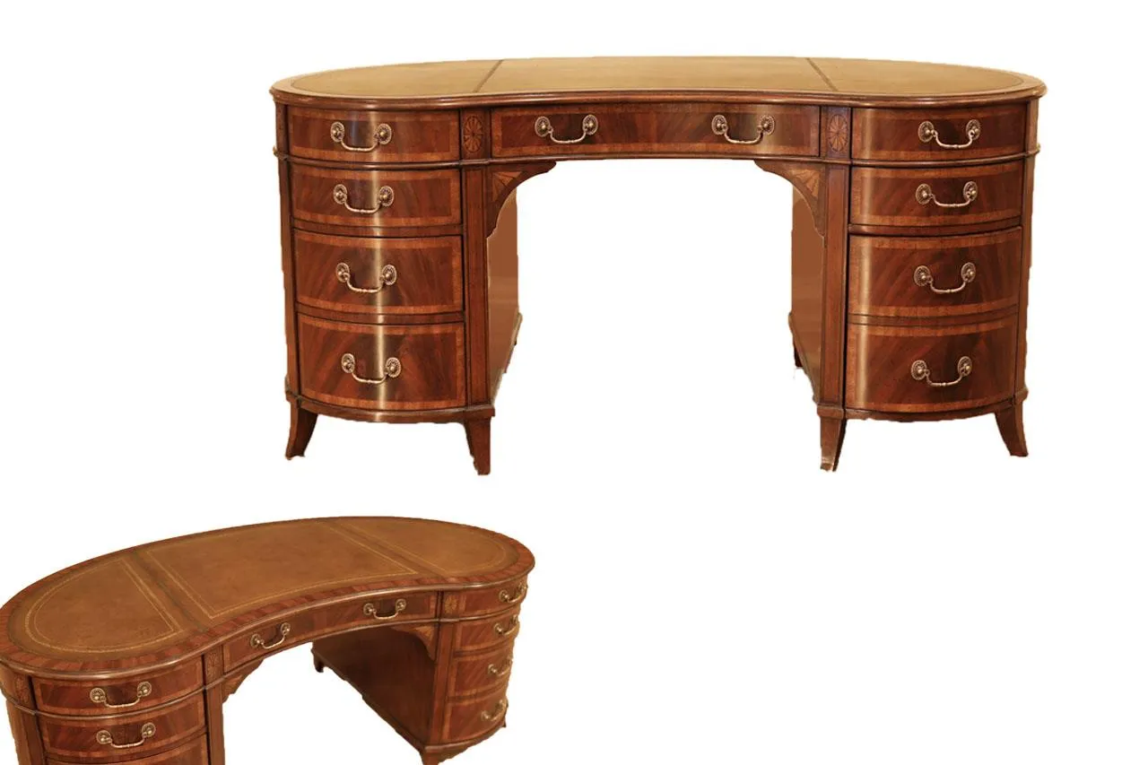 Home » Dining Room » Mahogany kidney desk with leather top. Saber leg writing desk with satinwood inlays