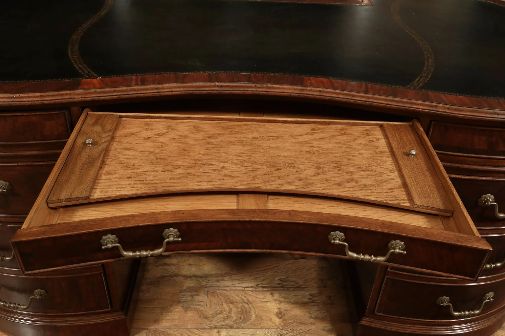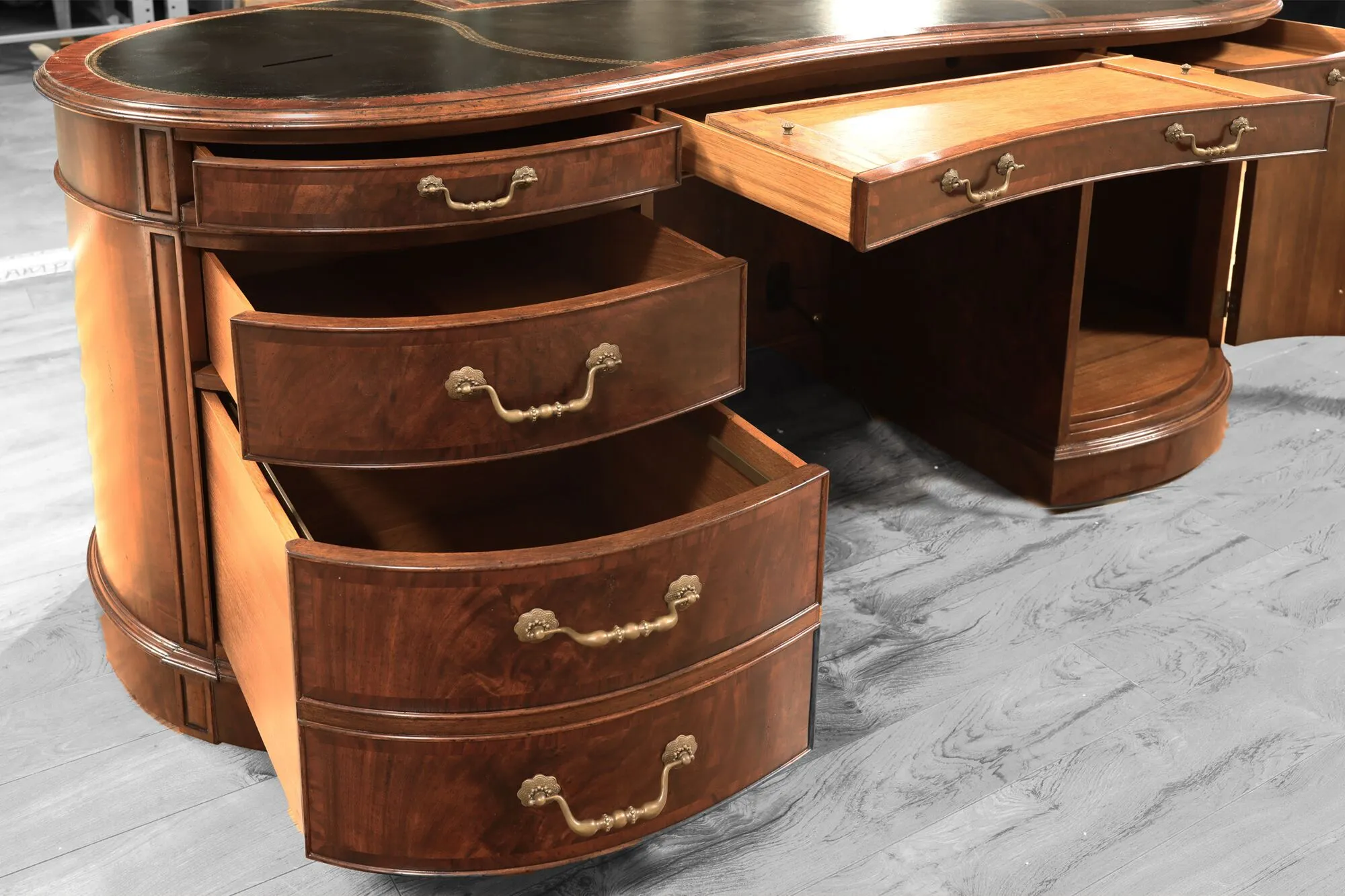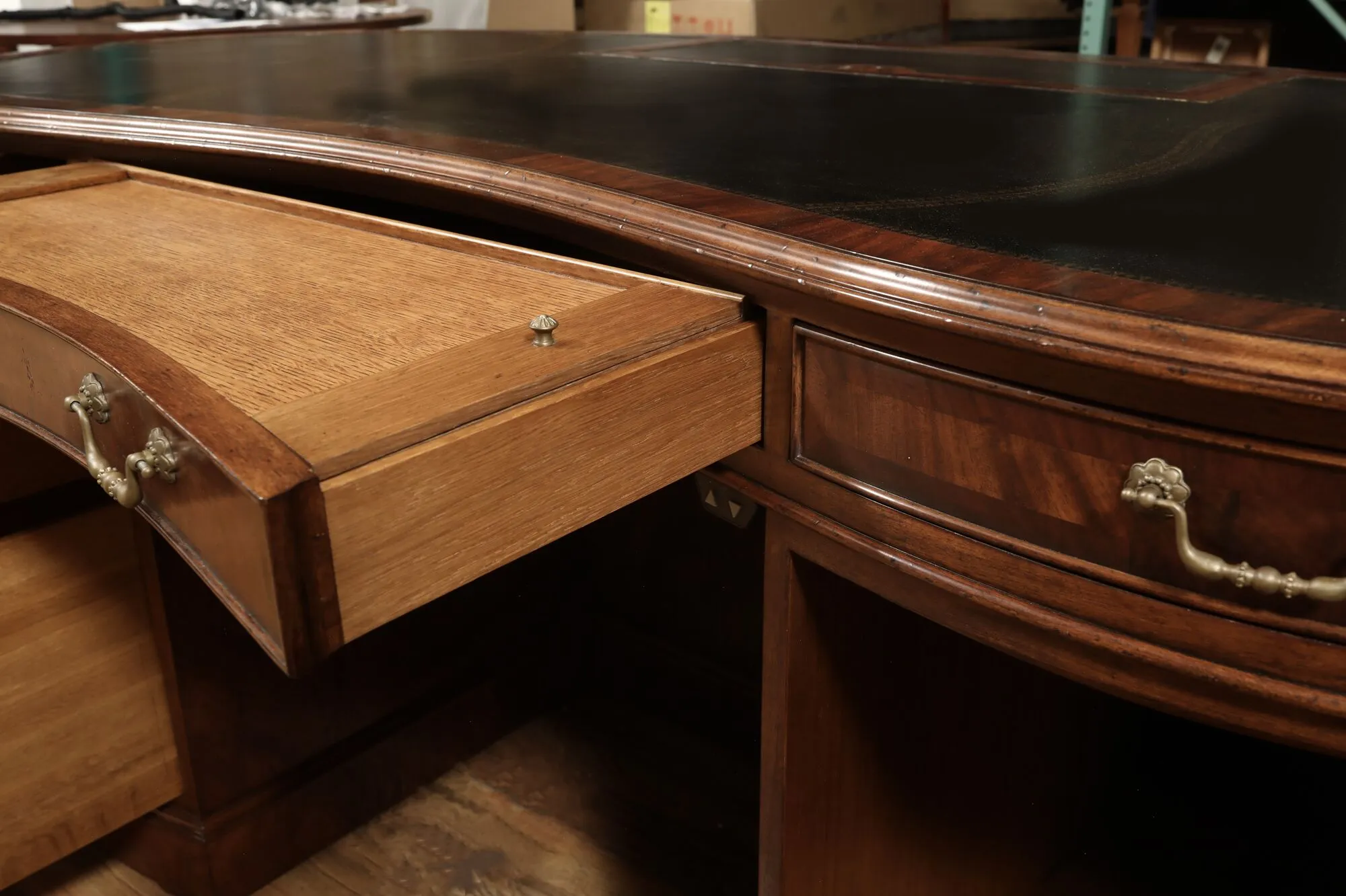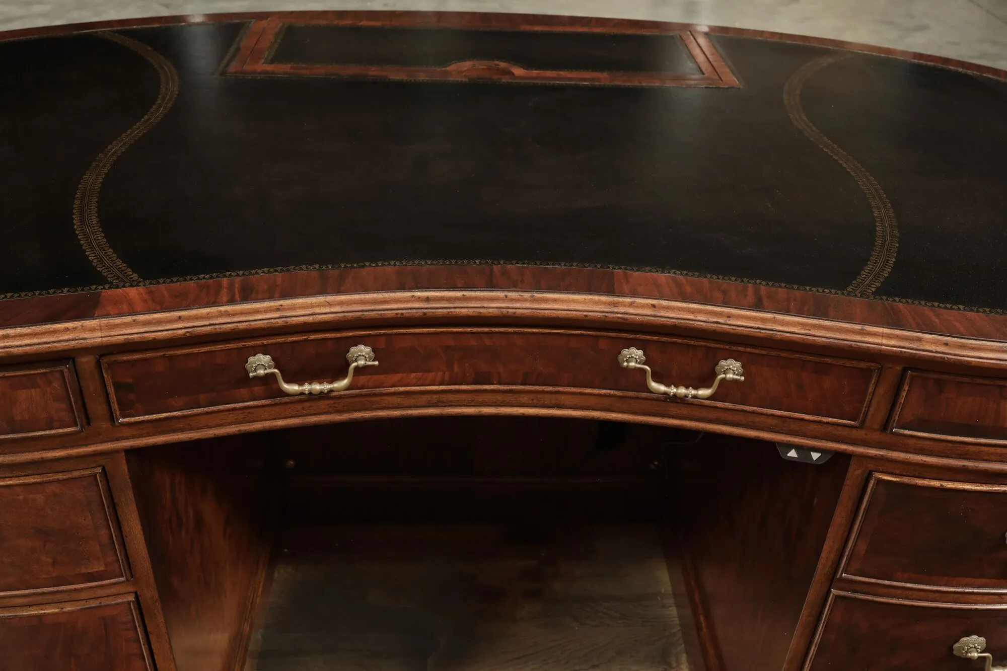 Kidney-shaped desk with gilt-tooled black leather top. A high-end antique reproduction with variegated walnut cross-banded raised panels, solid oak drawers, and black leather inset top. This kidney desk sits on two pedestal cabinets and a privacy panel. The generous privacy panel features a removable rear panel, revealing a storage area suitable for a large surge protector or monitor lift. The top of the desk has a large hinged trap door with a half-moon cutout for cable management. The desk has graduated drawers on the left, two pencil drawers, and a large storage area on the right. The doors and drawers feature finely decorated brass pulls, which were crafted using traditional lost-wax casting techniques. The desk is a medium golden brown, which coordinates well with walnut and mahogany. The lightly distressed finish on this desk is the result of a meticulous, multi-step process that creates a warm, patina-rich appearance resembling a period piece. The finish is forgiving, easy to touch up, and suitable for active families. The glazed black leather top has warm undertones and gilt tooling.