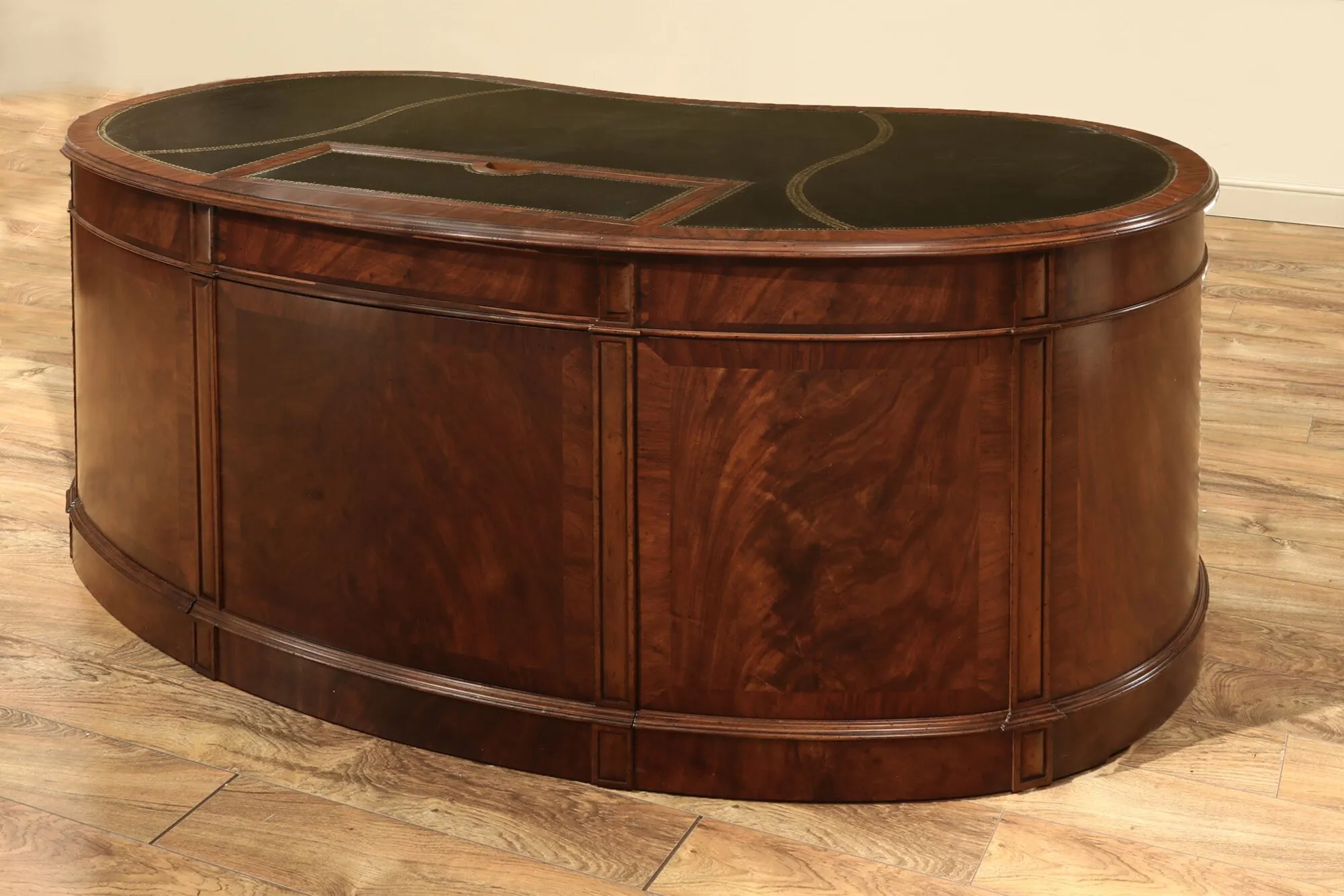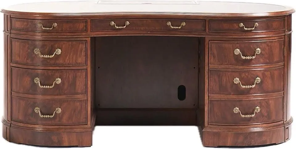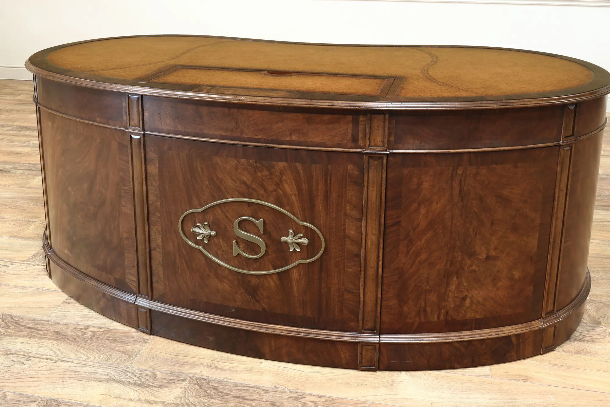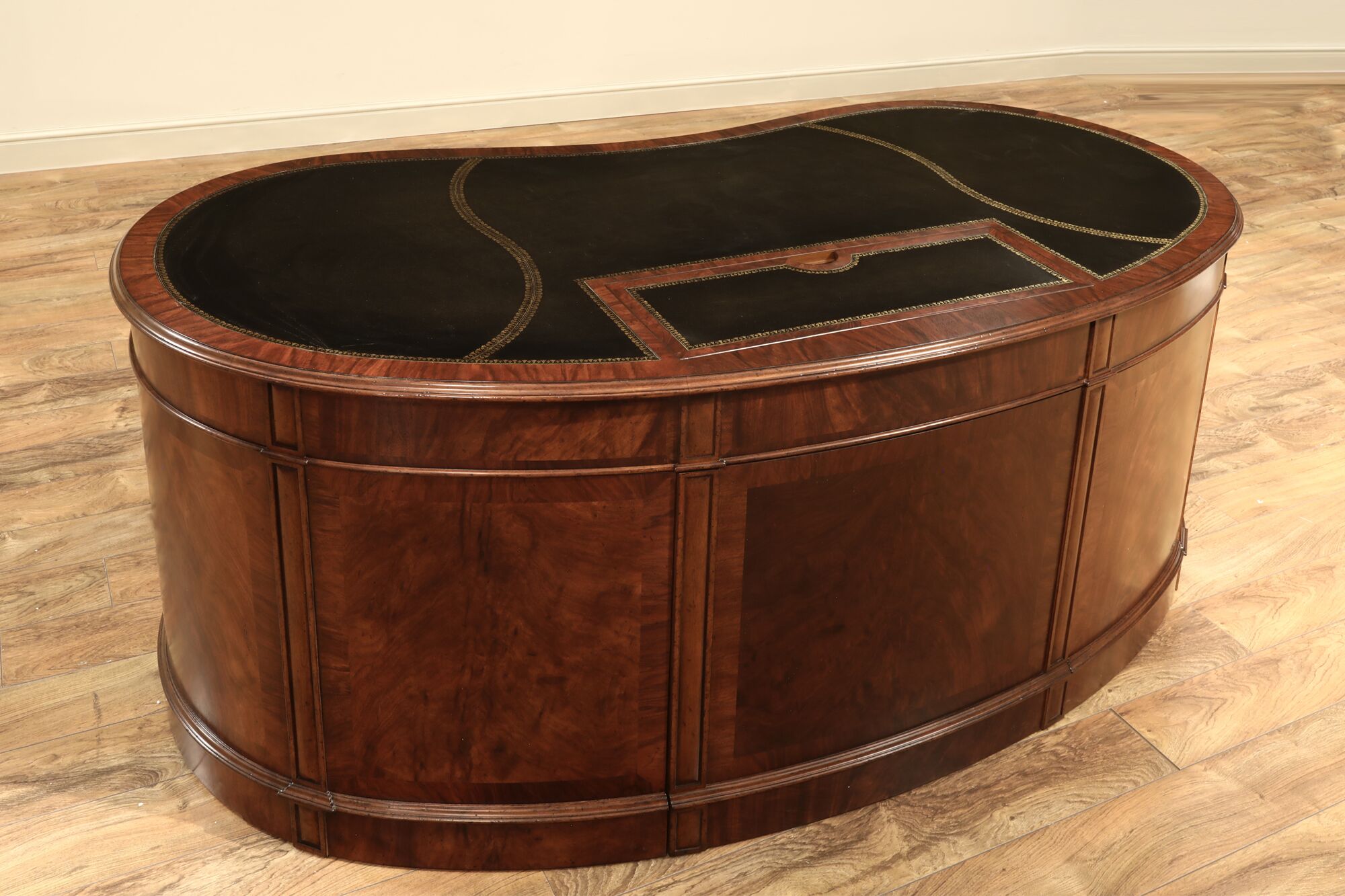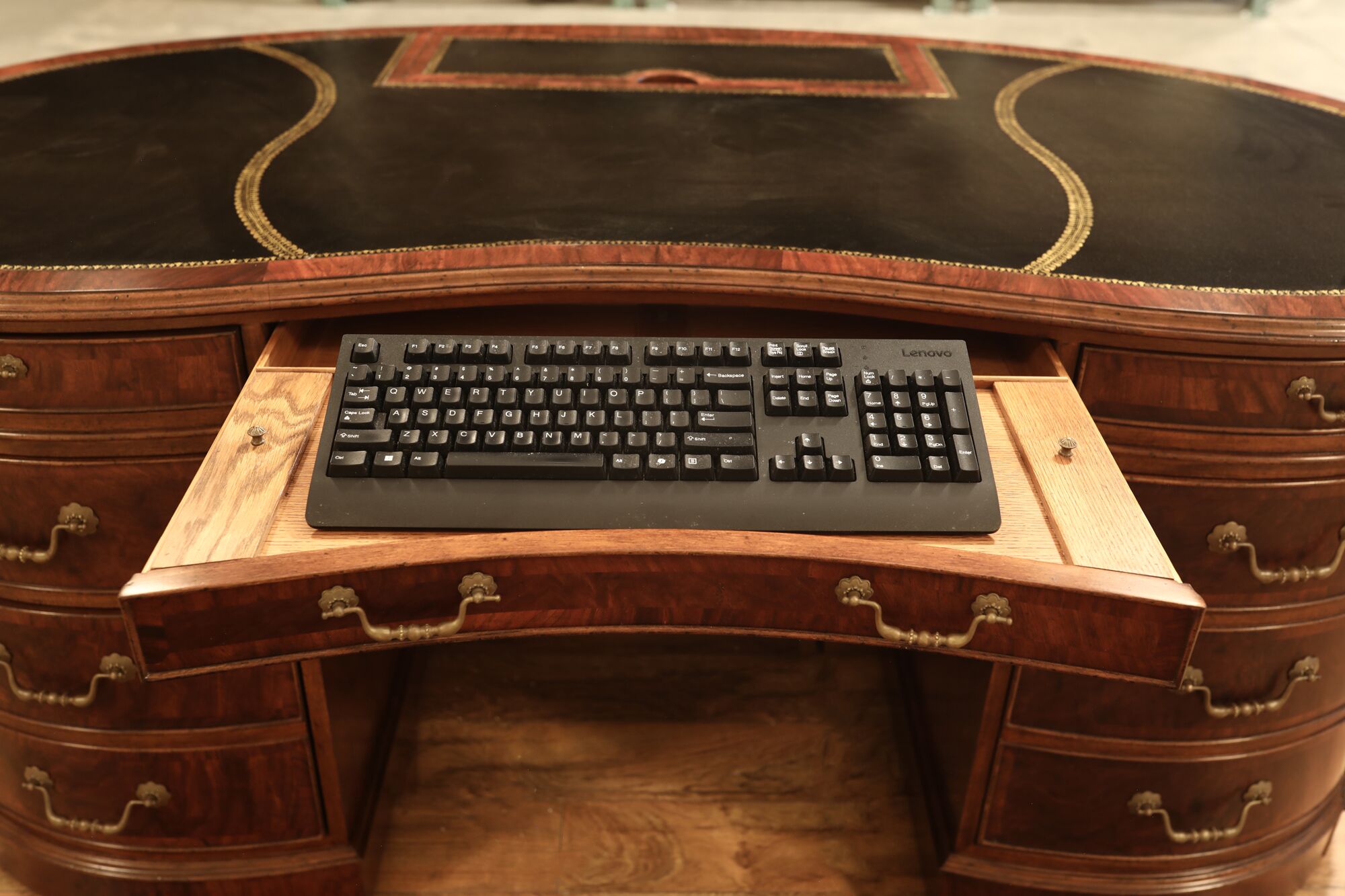 Kidney-shaped desk with gilt-tooled black leather top. A high-end antique reproduction with variegated walnut cross-banded raised panels, solid oak drawers, and black leather inset top. This kidney desk sits on two pedestal cabinets and a privacy panel. The generous privacy panel features a removable rear panel, revealing a storage area suitable for a large surge protector or monitor lift. The top of the desk has a large hinged trap door with a half-moon cutout for cable management. The desk has graduated drawers on the left, two pencil drawers, and a large storage area on the right. The doors and drawers feature finely decorated brass pulls, which were crafted using traditional lost-wax casting techniques. The desk is a medium golden brown, which coordinates well with walnut and mahogany. The lightly distressed finish on this desk is the result of a meticulous, multi-step process that creates a warm, patina-rich appearance resembling a period piece. The finish is forgiving, easy to touch up, and suitable for active families. The glazed black leather top has warm undertones and gilt tooling.