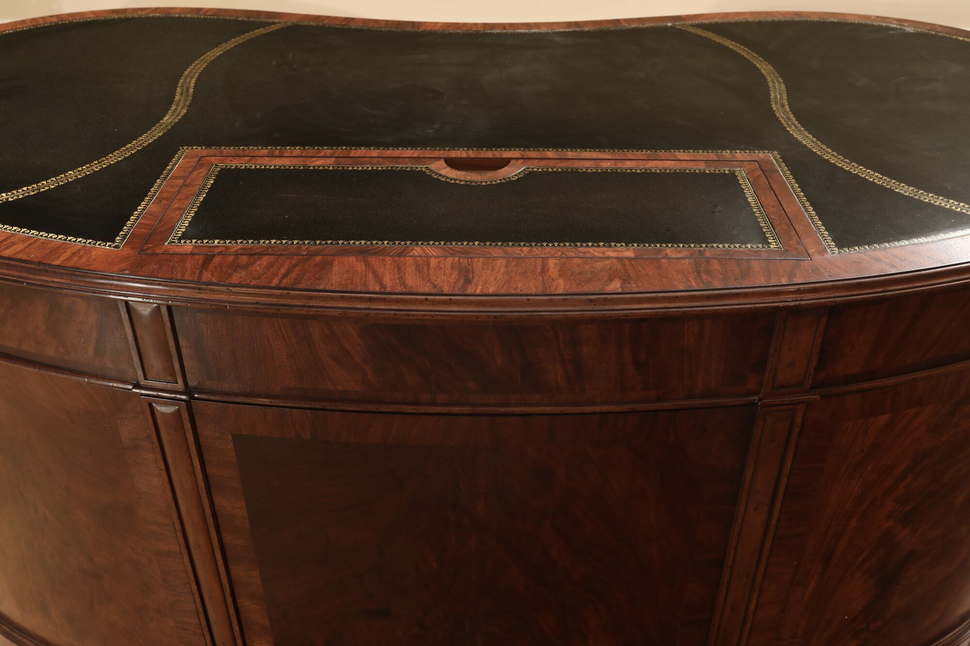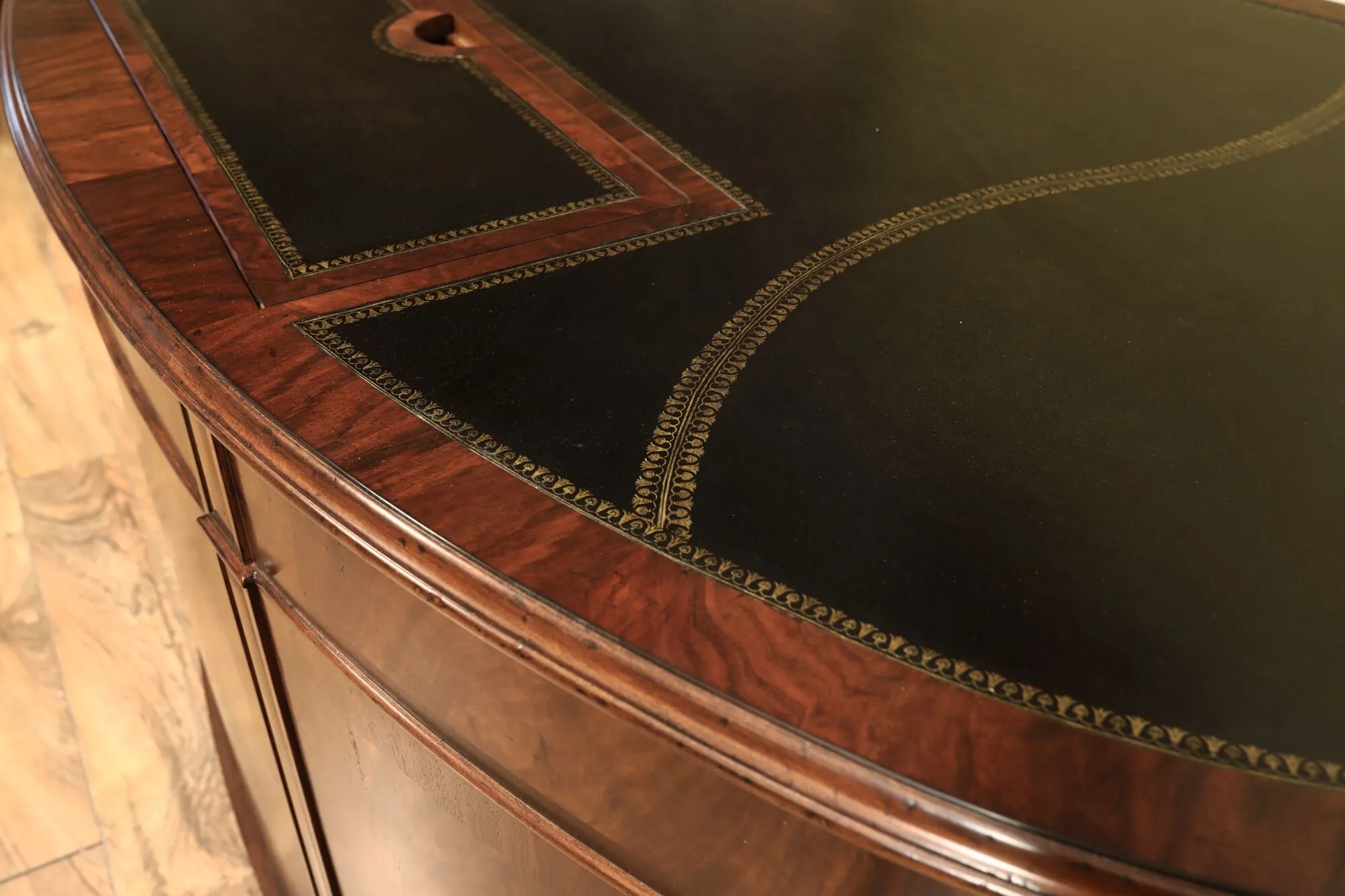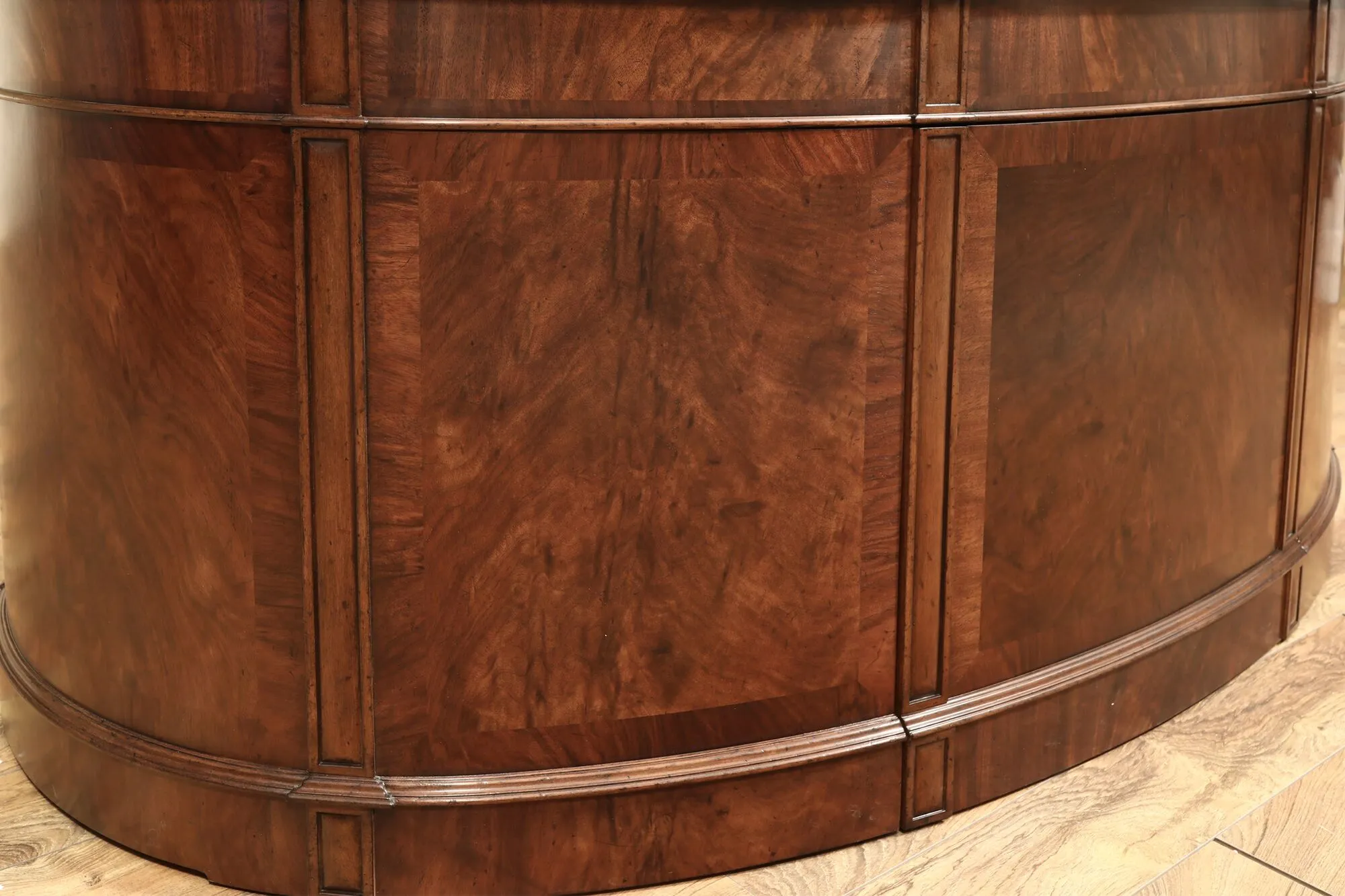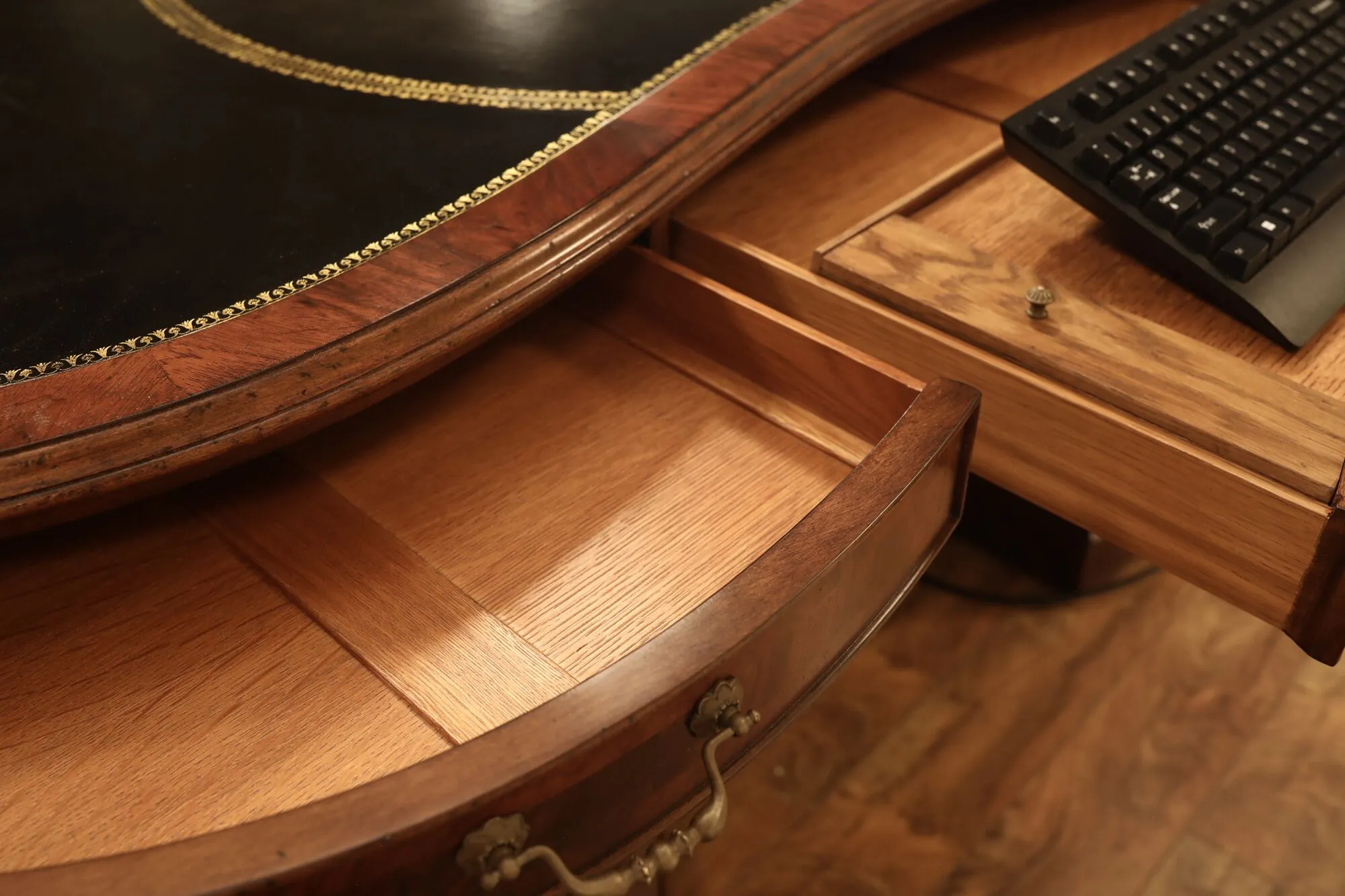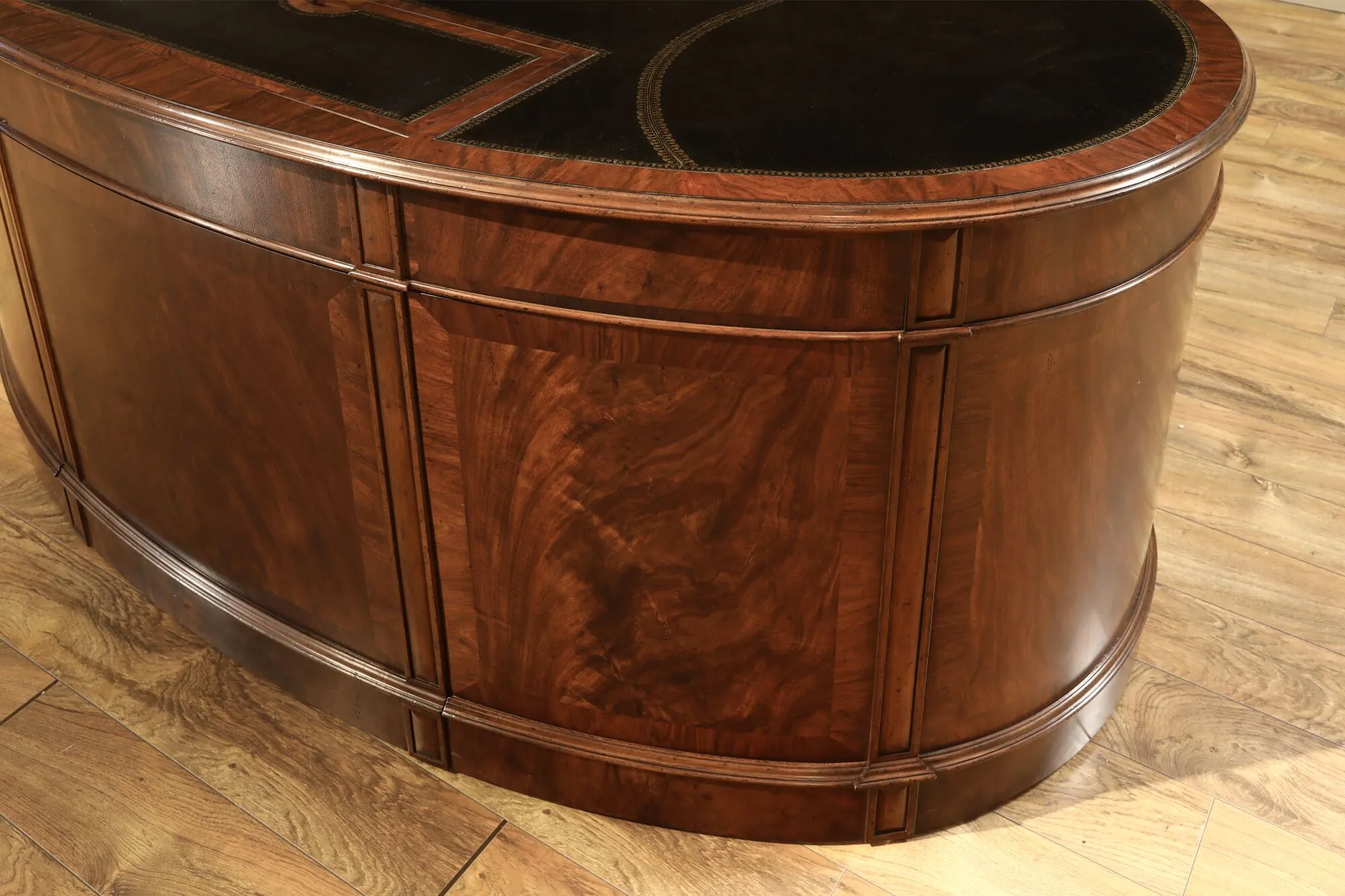 Kidney-shaped desk with gilt-tooled black leather top. A high-end antique reproduction with variegated walnut cross-banded raised panels, solid oak drawers, and black leather inset top. This kidney desk sits on two pedestal cabinets and a privacy panel. The generous privacy panel features a removable rear panel, revealing a storage area suitable for a large surge protector or monitor lift. The top of the desk has a large hinged trap door with a half-moon cutout for cable management. The desk has graduated drawers on the left, two pencil drawers, and a large storage area on the right. The doors and drawers feature finely decorated brass pulls, which were crafted using traditional lost-wax casting techniques. The desk is a medium golden brown, which coordinates well with walnut and mahogany. The lightly distressed finish on this desk is the result of a meticulous, multi-step process that creates a warm, patina-rich appearance resembling a period piece. The finish is forgiving, easy to touch up, and suitable for active families. The glazed black leather top has warm undertones and gilt tooling.