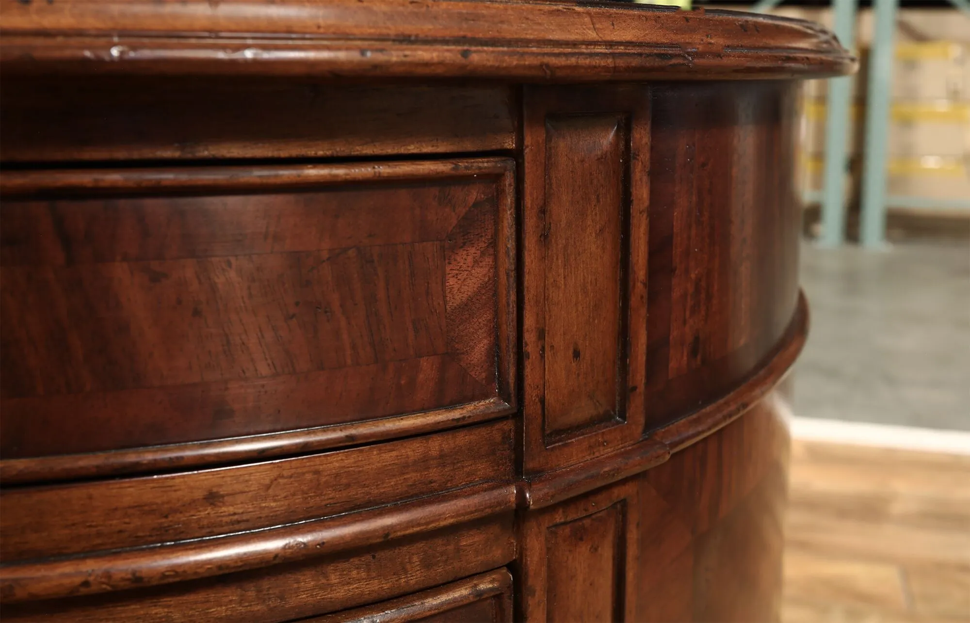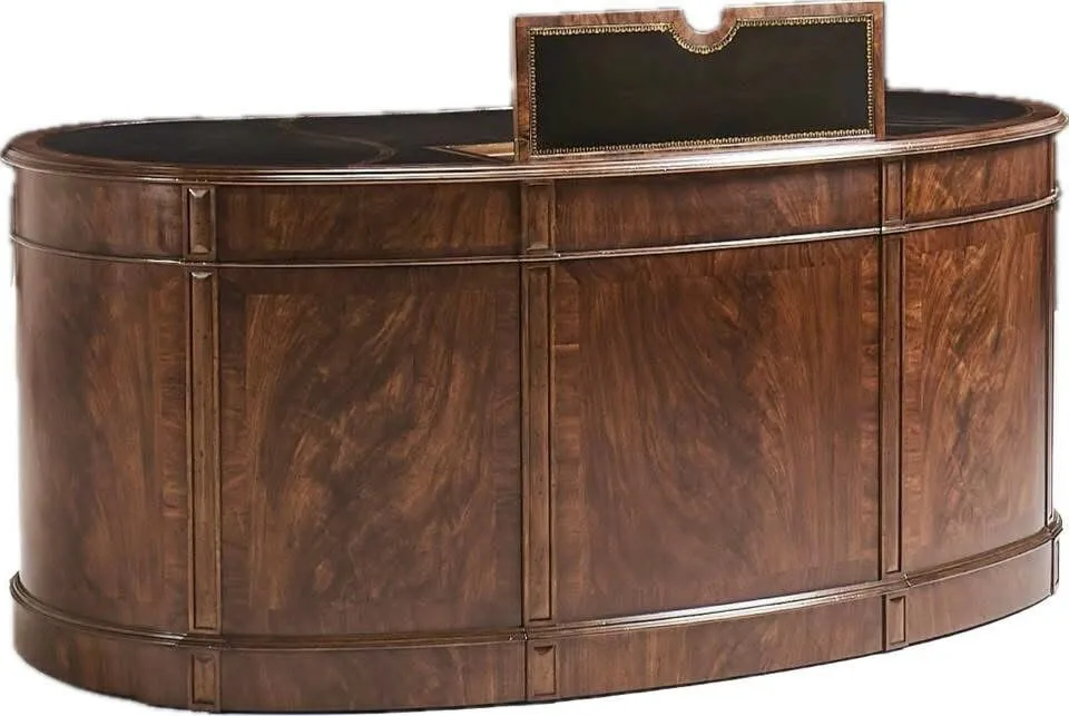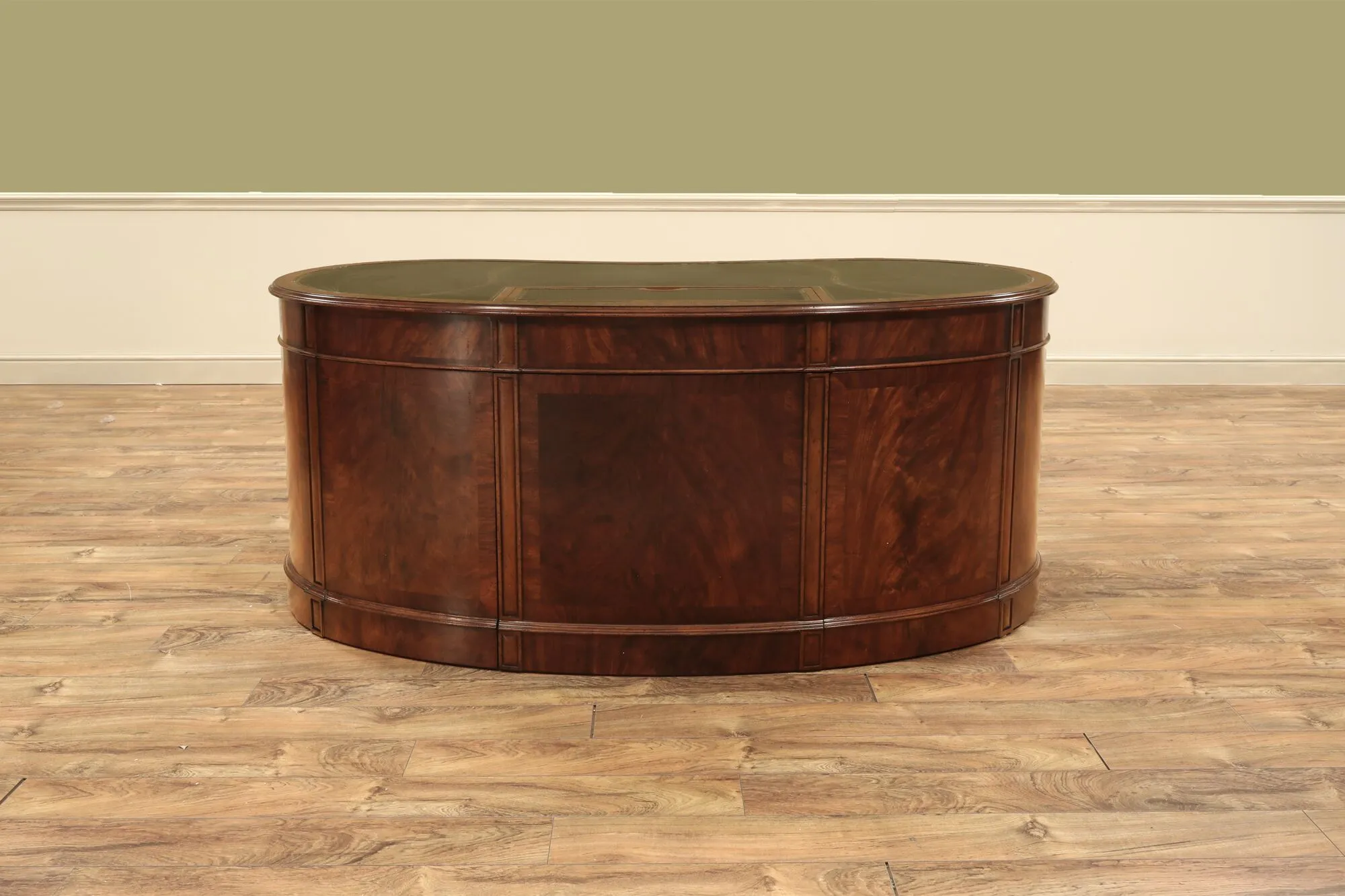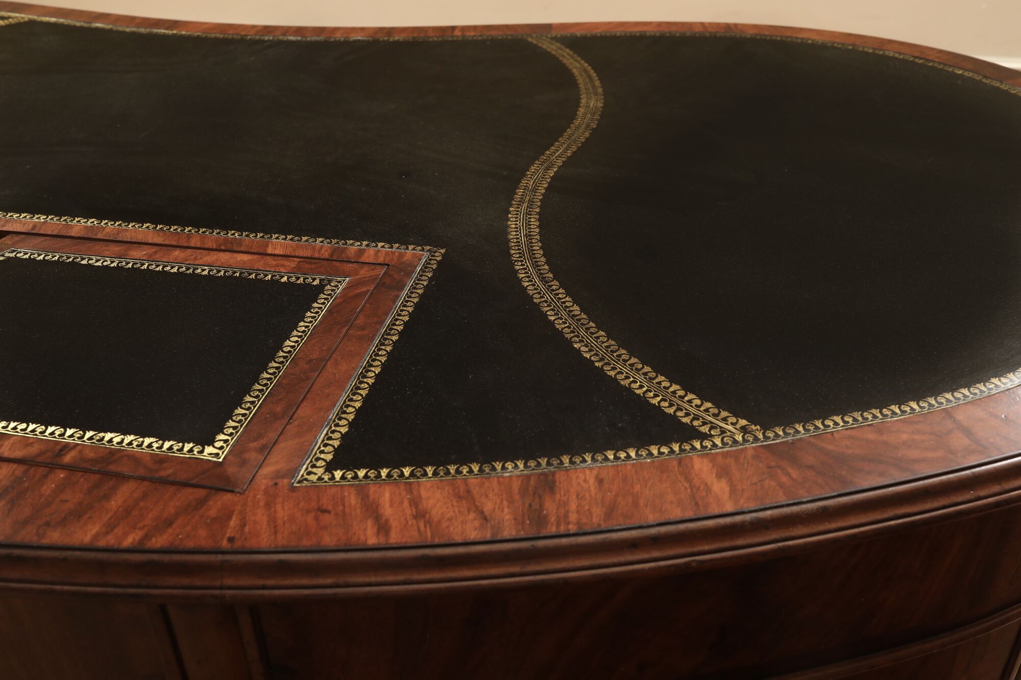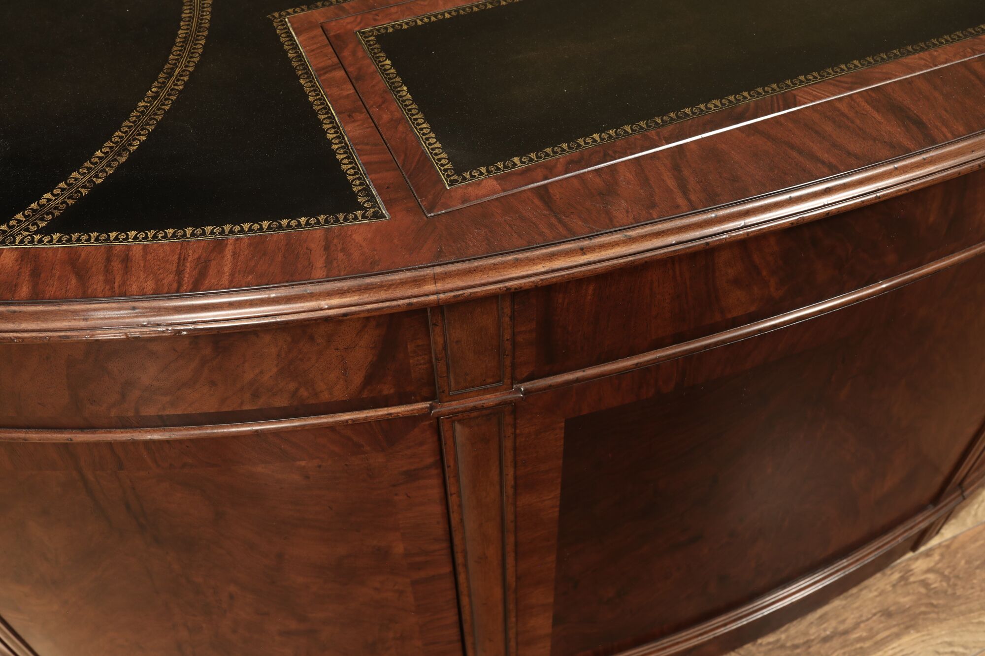 Kidney-shaped desk with gilt-tooled black leather top. A high-end antique reproduction with variegated walnut cross-banded raised panels, solid oak drawers, and black leather inset top. This kidney desk sits on two pedestal cabinets and a privacy panel. The generous privacy panel features a removable rear panel, revealing a storage area suitable for a large surge protector or monitor lift. The top of the desk has a large hinged trap door with a half-moon cutout for cable management. The desk has graduated drawers on the left, two pencil drawers, and a large storage area on the right. The doors and drawers feature finely decorated brass pulls, which were crafted using traditional lost-wax casting techniques. The desk is a medium golden brown, which coordinates well with walnut and mahogany. The lightly distressed finish on this desk is the result of a meticulous, multi-step process that creates a warm, patina-rich appearance resembling a period piece. The finish is forgiving, easy to touch up, and suitable for active families. The glazed black leather top has warm undertones and gilt tooling.