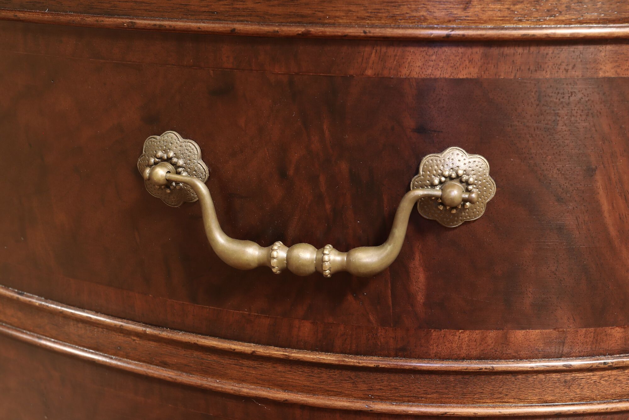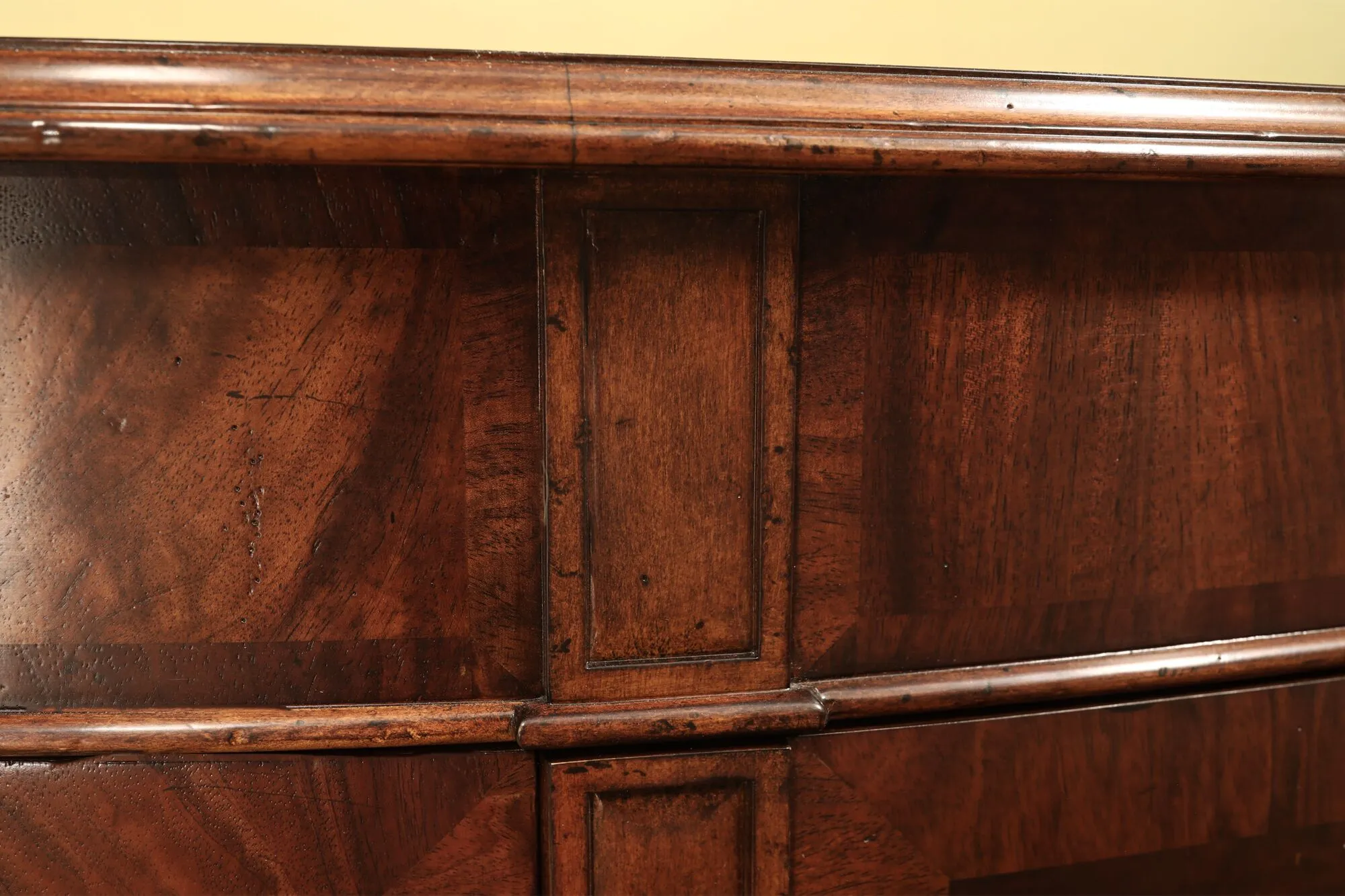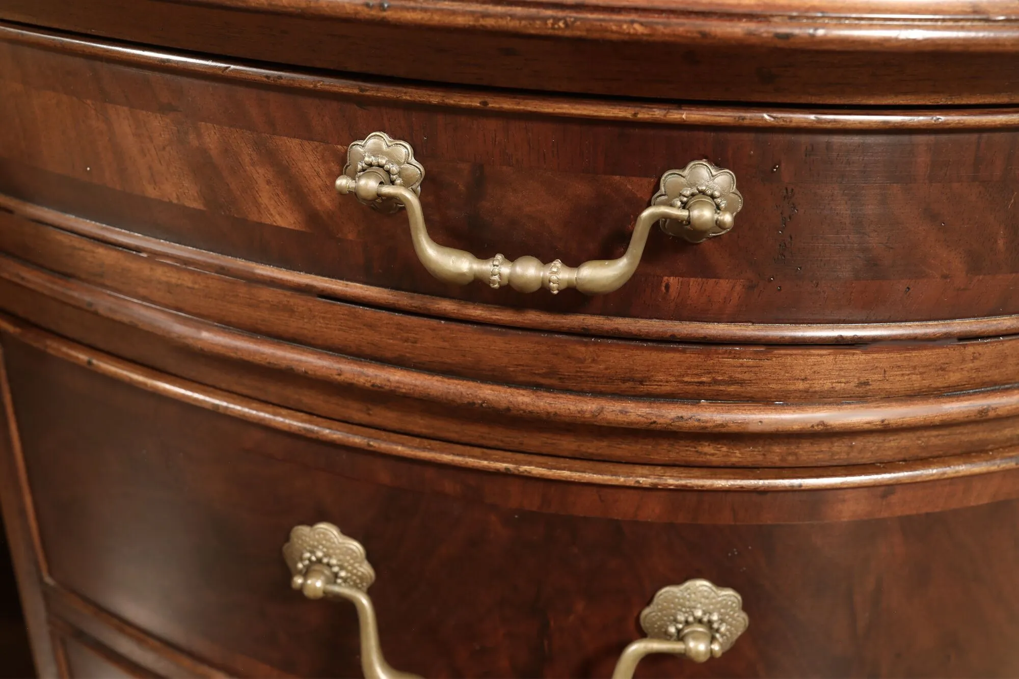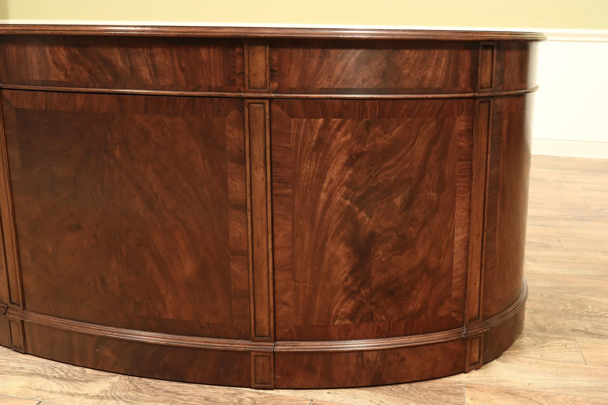 Kidney-shaped desk with gilt-tooled black leather top. A high-end antique reproduction with variegated walnut cross-banded raised panels, solid oak drawers, and black leather inset top. This kidney desk sits on two pedestal cabinets and a privacy panel. The generous privacy panel features a removable rear panel, revealing a storage area suitable for a large surge protector or monitor lift. The top of the desk has a large hinged trap door with a half-moon cutout for cable management. The desk has graduated drawers on the left, two pencil drawers, and a large storage area on the right. The doors and drawers feature finely decorated brass pulls, which were crafted using traditional lost-wax casting techniques. The desk is a medium golden brown, which coordinates well with walnut and mahogany. The lightly distressed finish on this desk is the result of a meticulous, multi-step process that creates a warm, patina-rich appearance resembling a period piece. The finish is forgiving, easy to touch up, and suitable for active families. The glazed black leather top has warm undertones and gilt tooling.