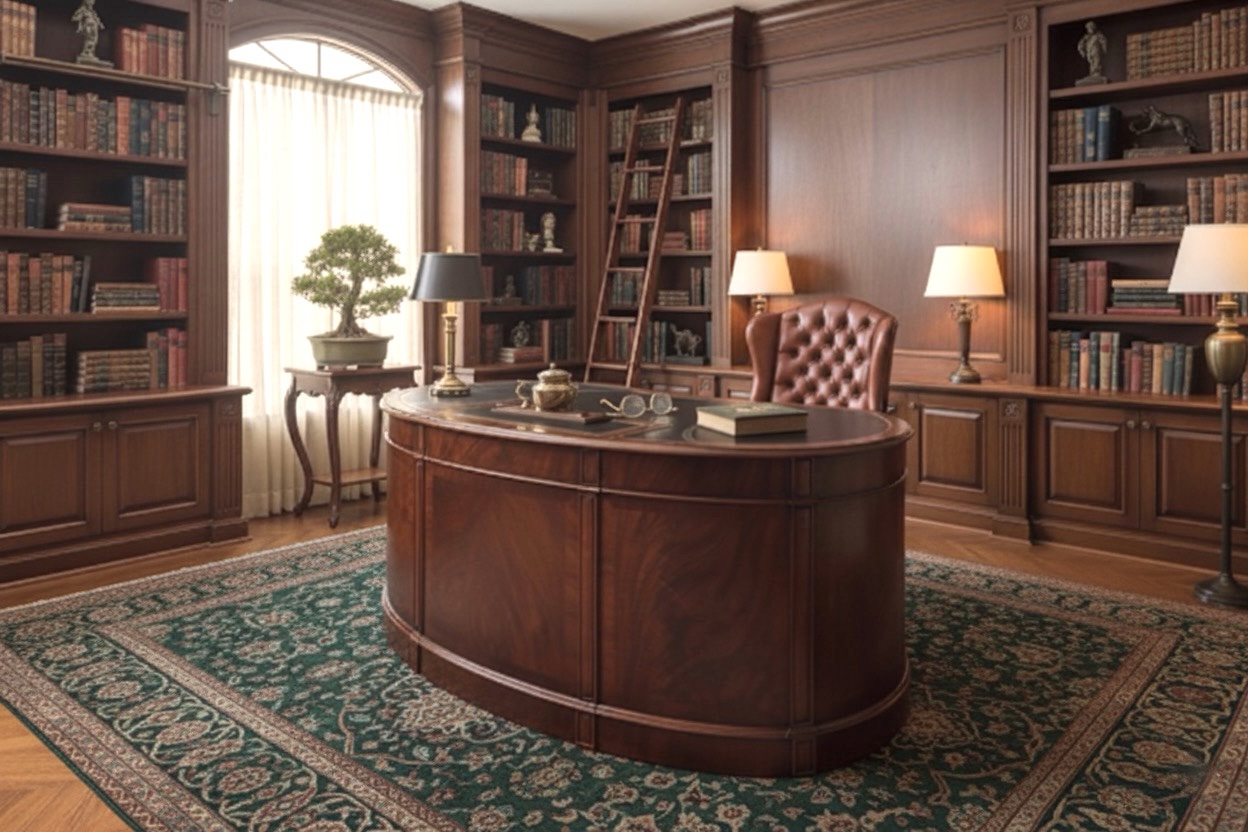 Home » Dining Room » Kidney Shaped Desk with Optional Monitor Lift, Gilt-Tooled Leather Top