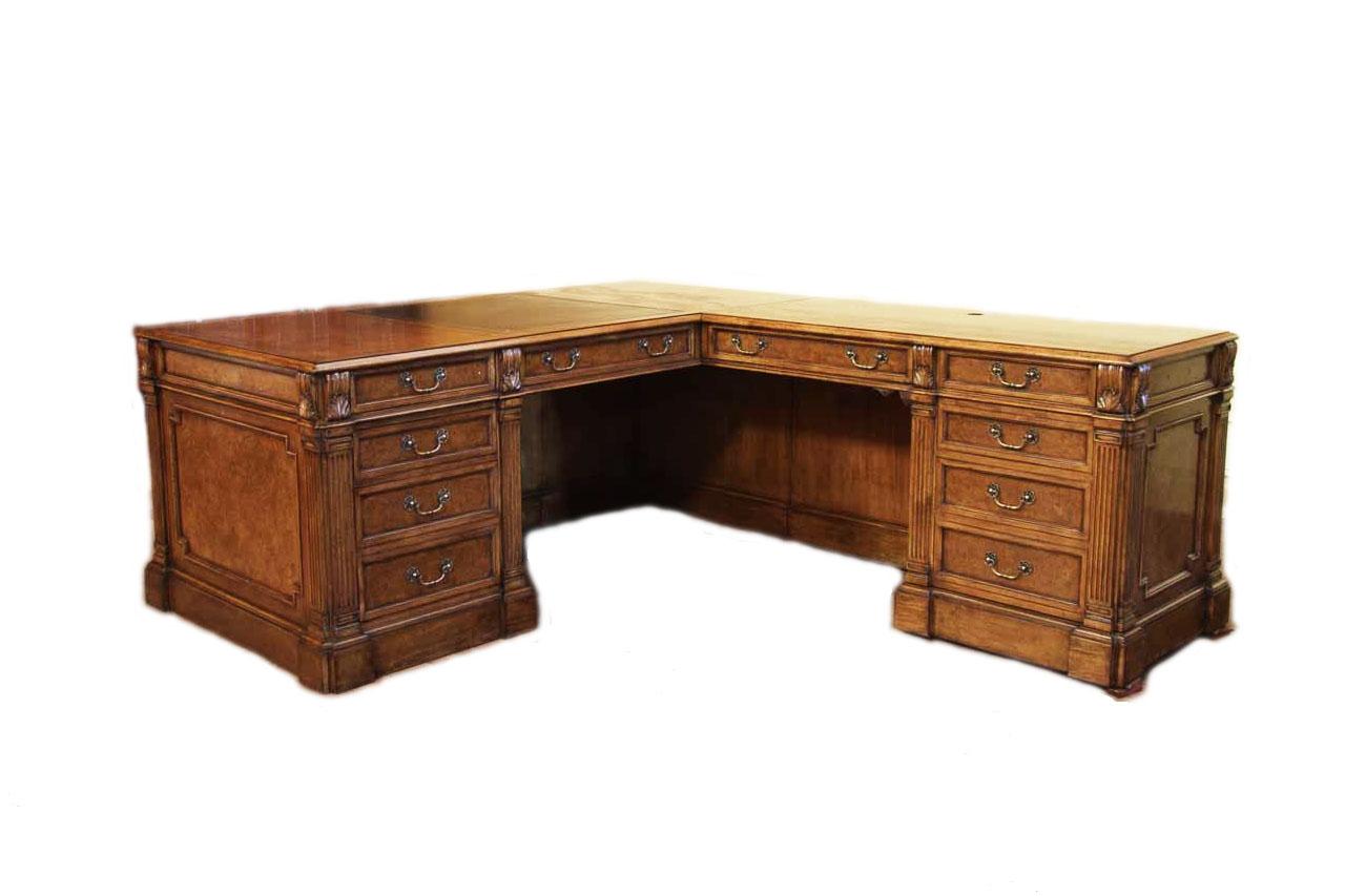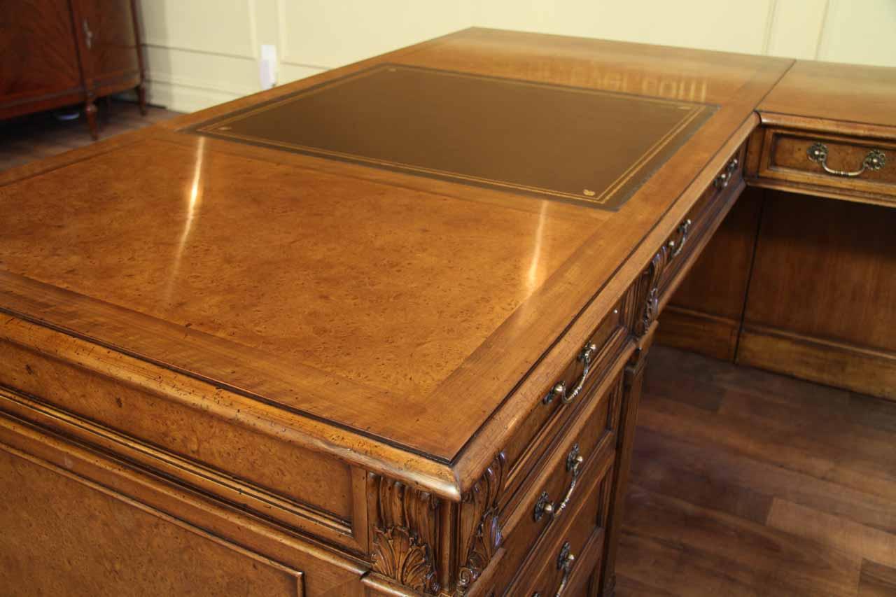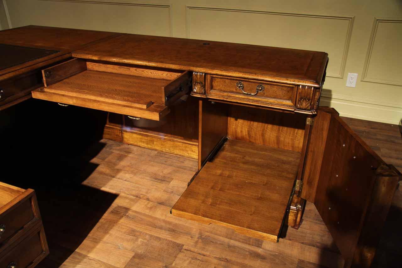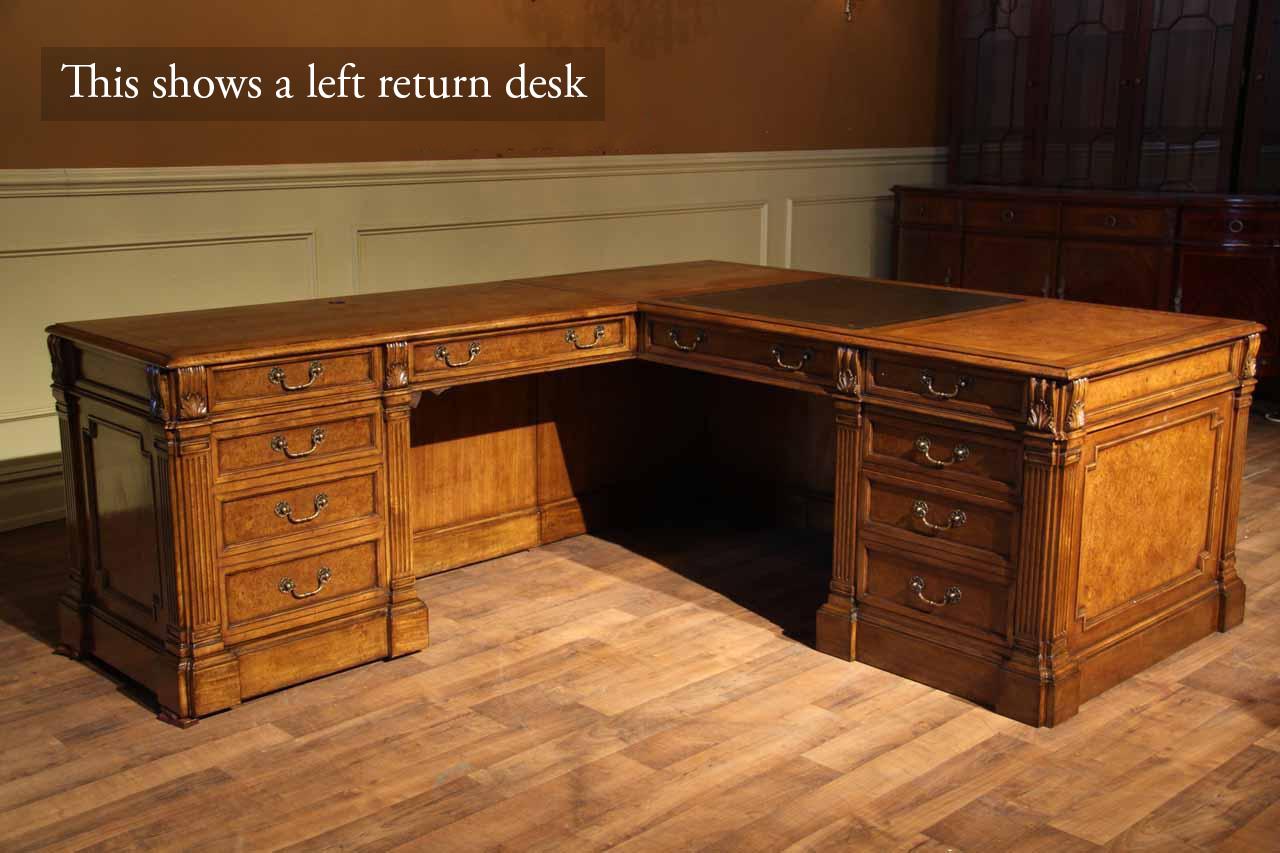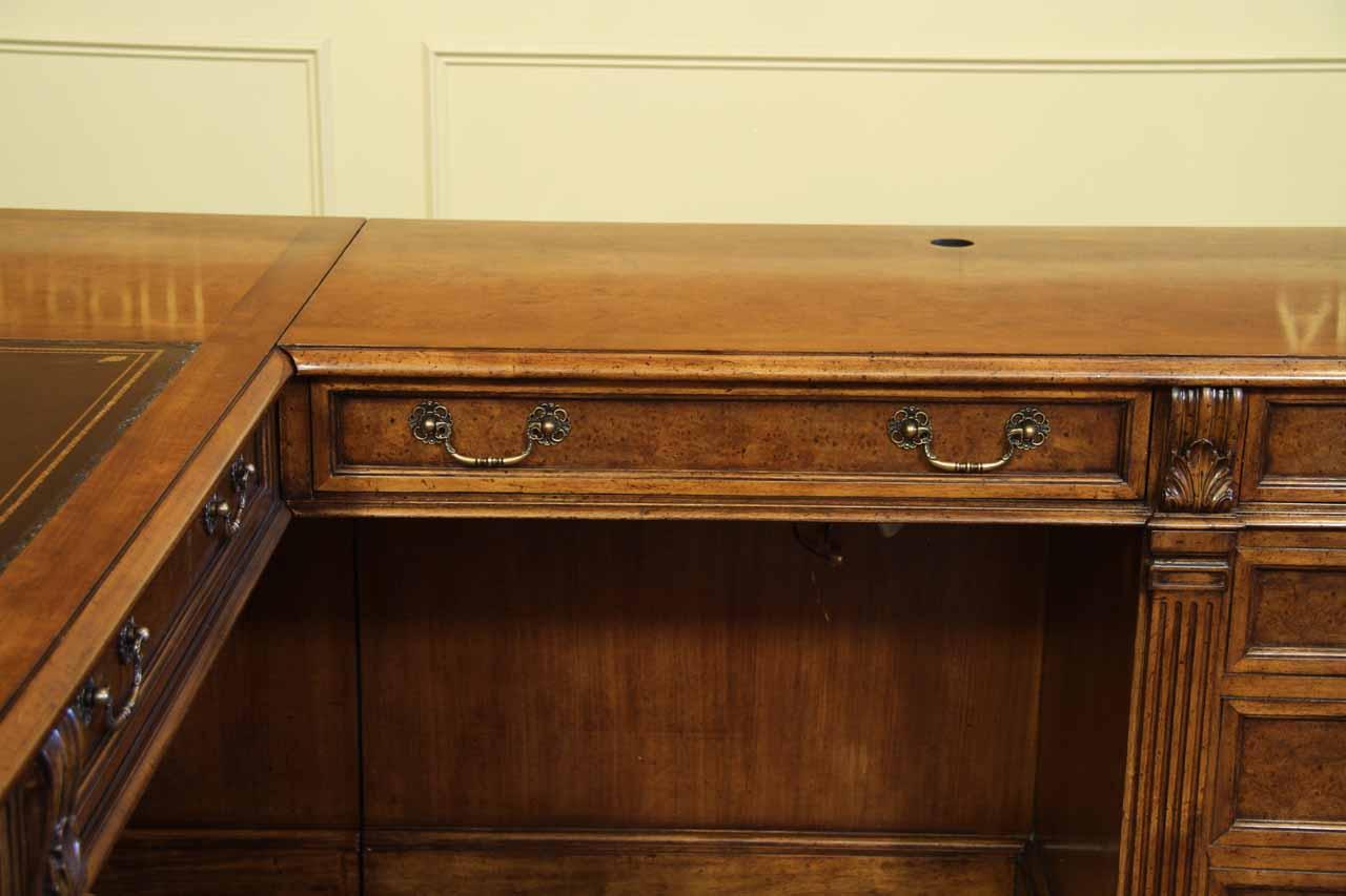 Traditional walnut leather top return desk available in left or right return configurations. A quality traditional return desk for an executive, reception area or for your home office. This is a very heavy and well made desk. It features quality leather with detailed tooling, solid oak drawers, wired surge protection with easy access power switch, wiring hole, printer or tower storage and sliding tray, keyboard drawer with kick out drawer face, burly walnut and mahogany solids. The cabinet in this traditional return desk also has a filing cabinet which is on the left side of this cabinet behind the drawer face. This return desk was made by an English cabinet maker in Cebu. The quality of this walnut leather top return desk is amazing, it is an overbuilt desk.