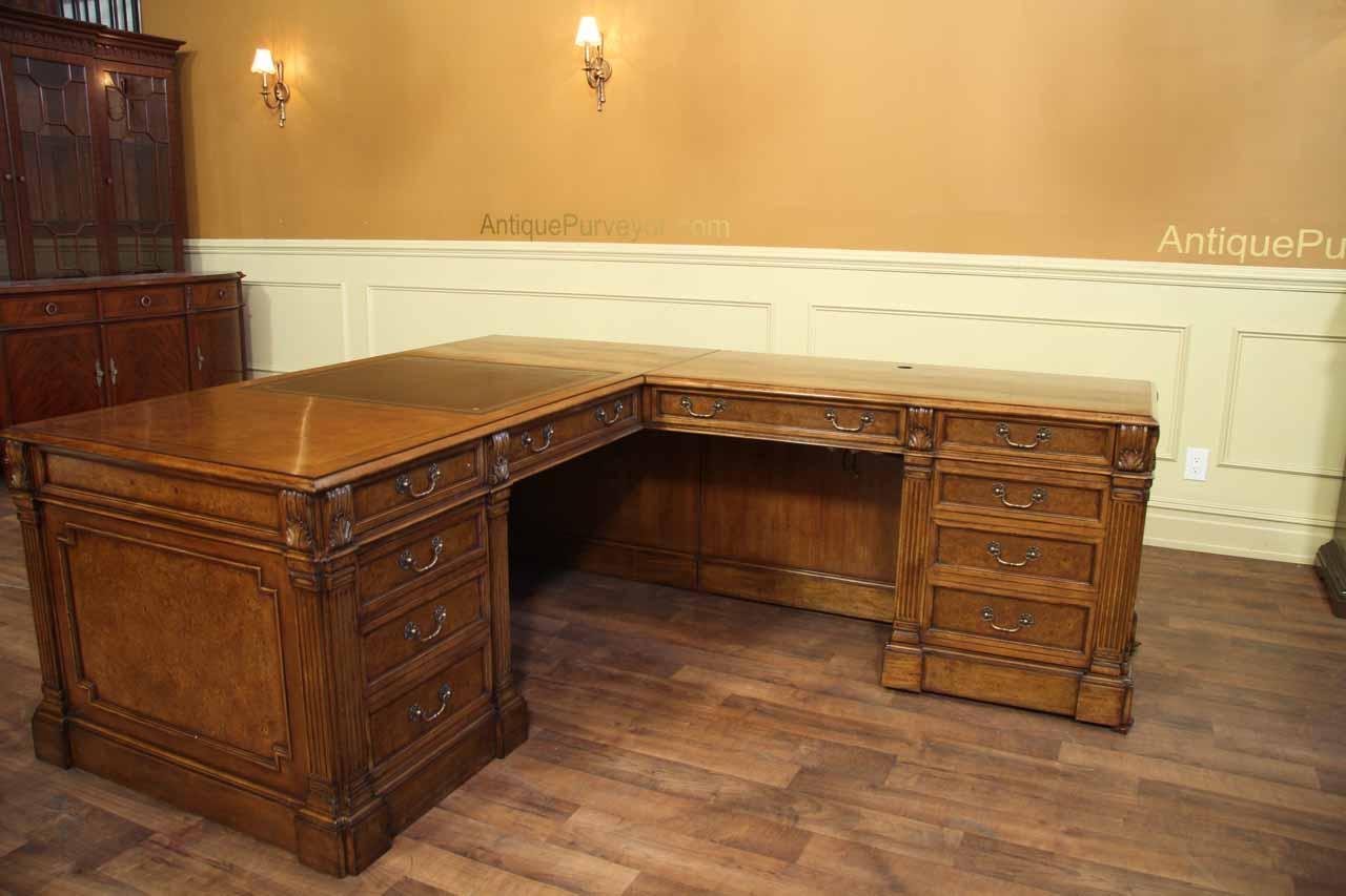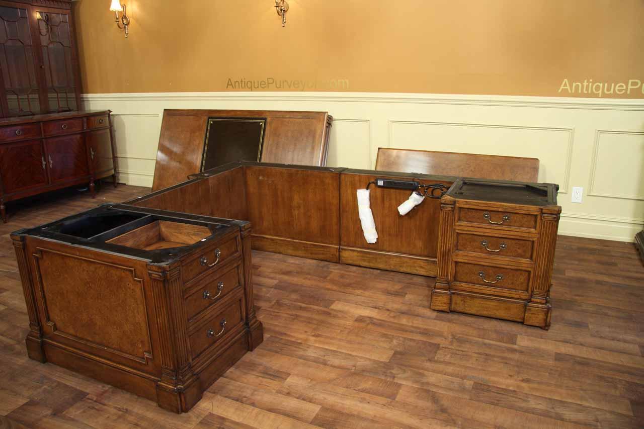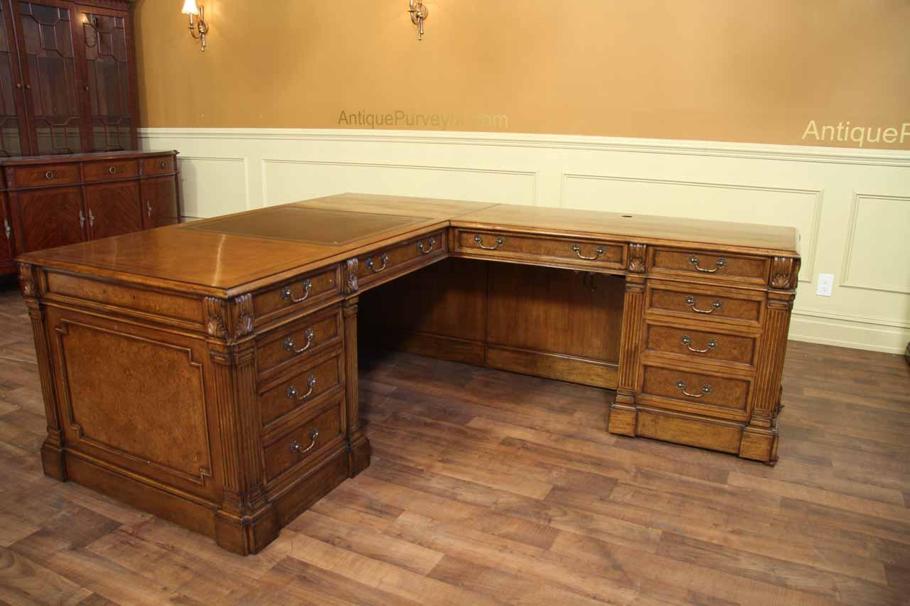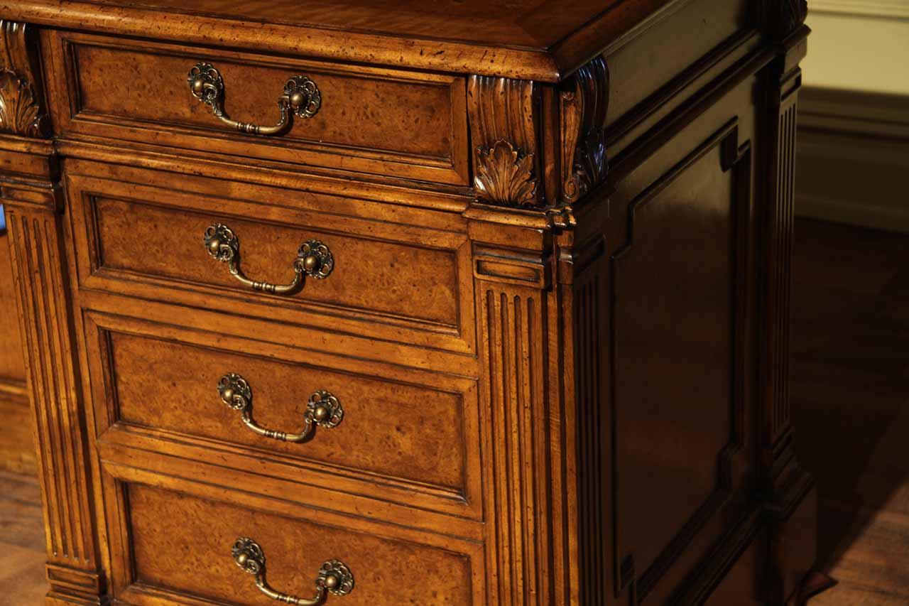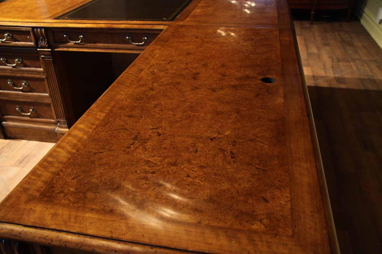 Traditional walnut leather top return desk available in left or right return configurations. A quality traditional return desk for an executive, reception area or for your home office. This is a very heavy and well made desk. It features quality leather with detailed tooling, solid oak drawers, wired surge protection with easy access power switch, wiring hole, printer or tower storage and sliding tray, keyboard drawer with kick out drawer face, burly walnut and mahogany solids. The cabinet in this traditional return desk also has a filing cabinet which is on the left side of this cabinet behind the drawer face. This return desk was made by an English cabinet maker in Cebu. The quality of this walnut leather top return desk is amazing, it is an overbuilt desk.