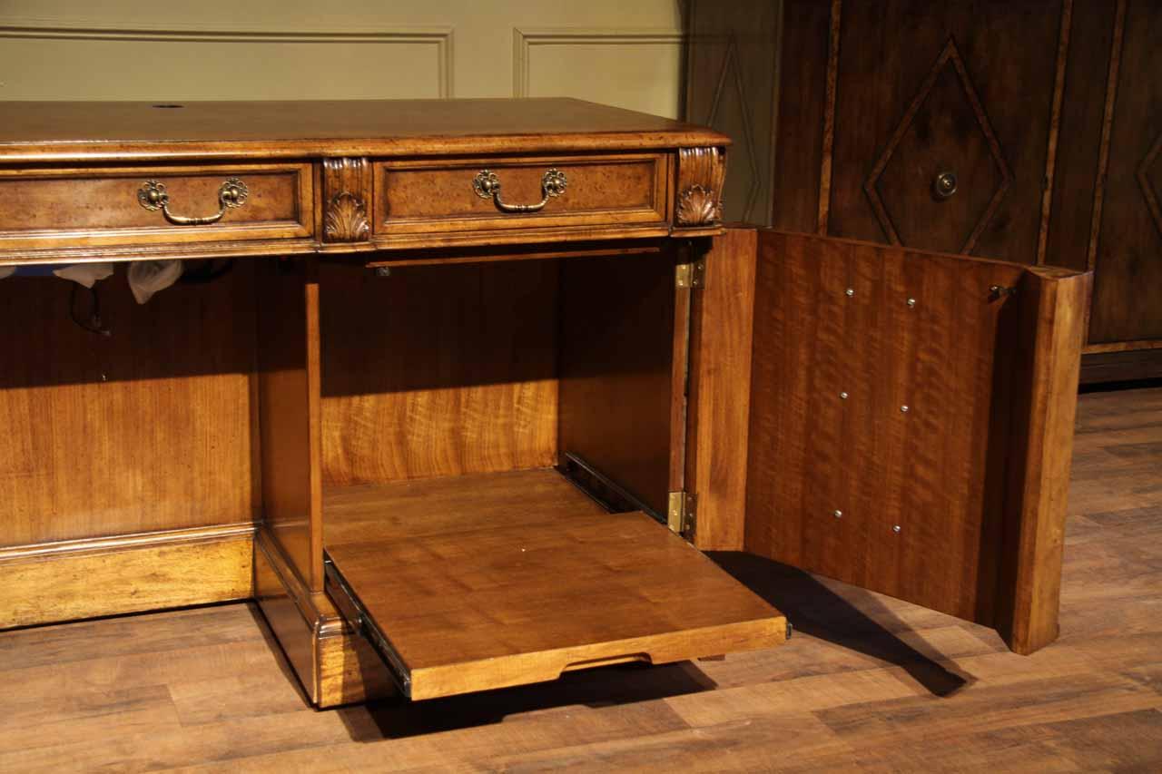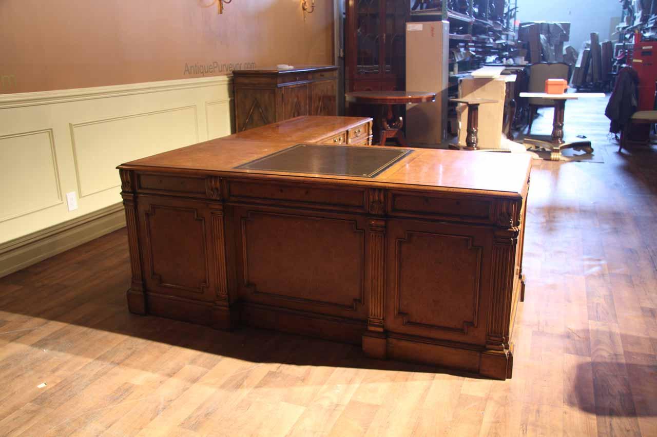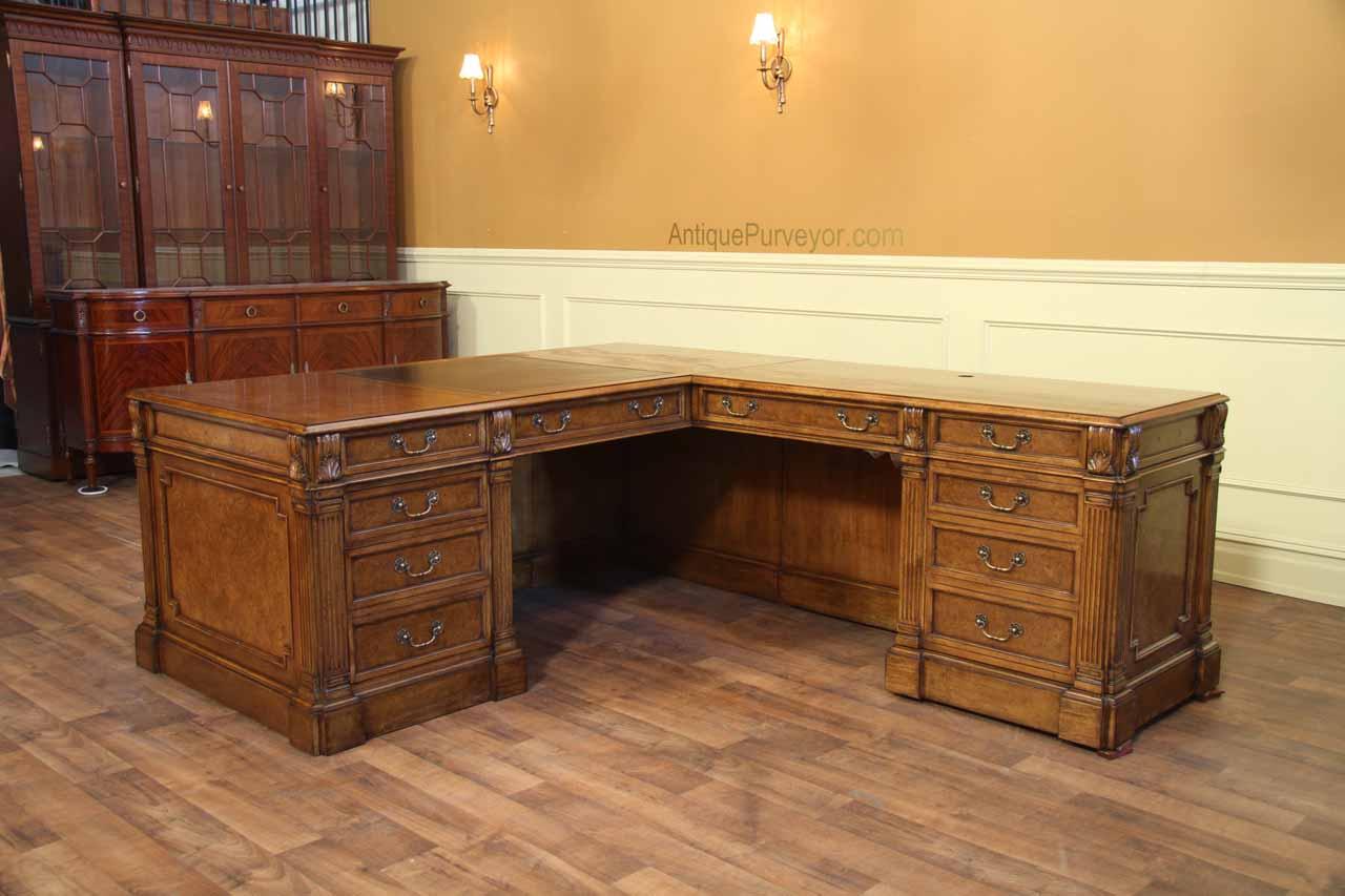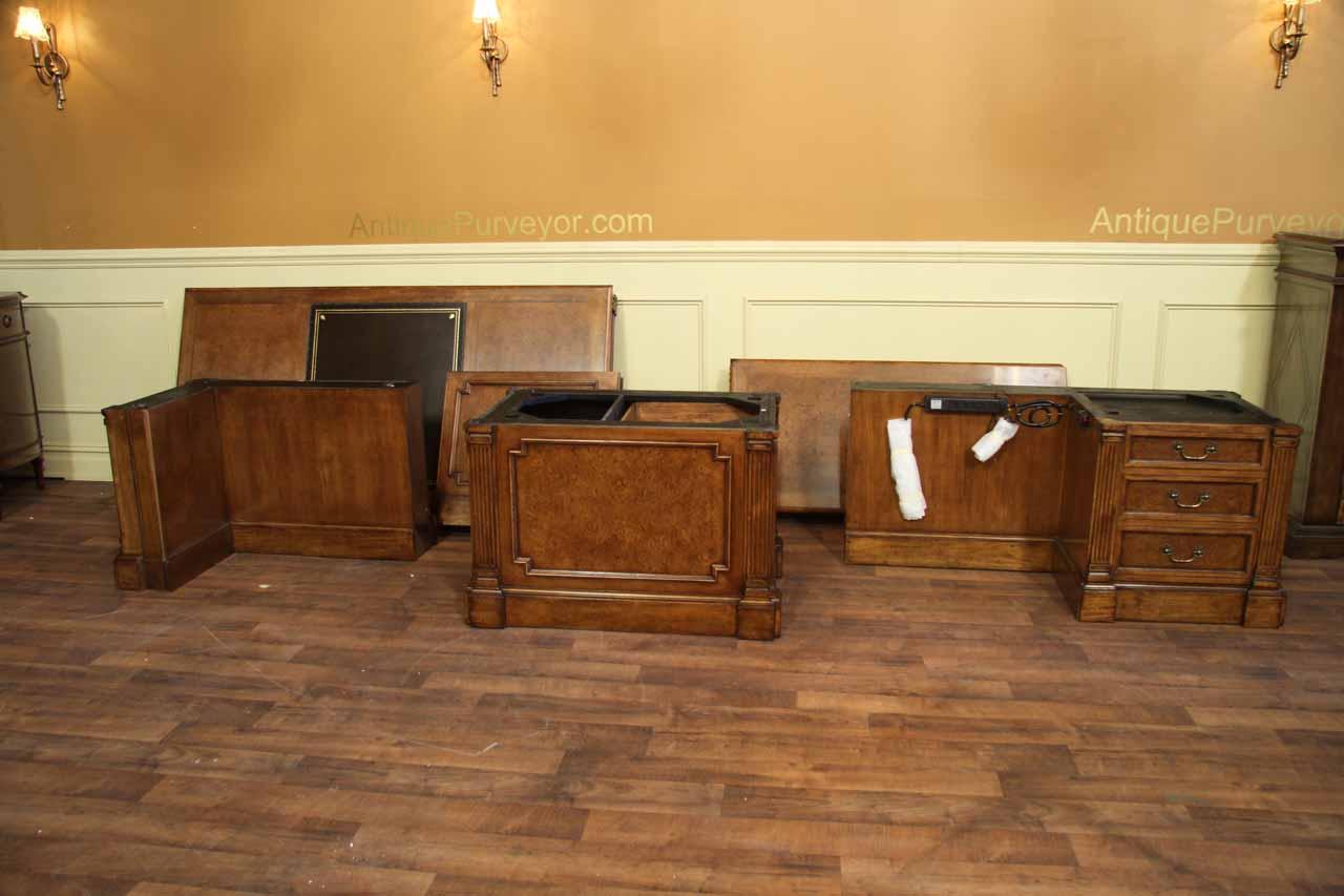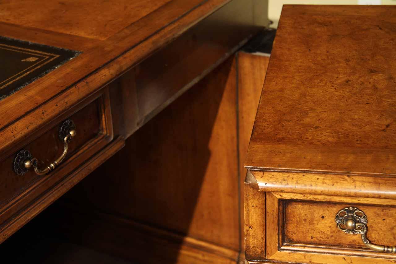Traditional walnut leather top return desk available in left or right return configurations. A quality traditional return desk for an executive, reception area or for your home office. This is a very heavy and well made desk. It features quality leather with detailed tooling, solid oak drawers, wired surge protection with easy access power switch, wiring hole, printer or tower storage and sliding tray, keyboard drawer with kick out drawer face, burly walnut and mahogany solids. The cabinet in this traditional return desk also has a filing cabinet which is on the left side of this cabinet behind the drawer face. This return desk was made by an English cabinet maker in Cebu. The quality of this walnut leather top return desk is amazing, it is an overbuilt desk.