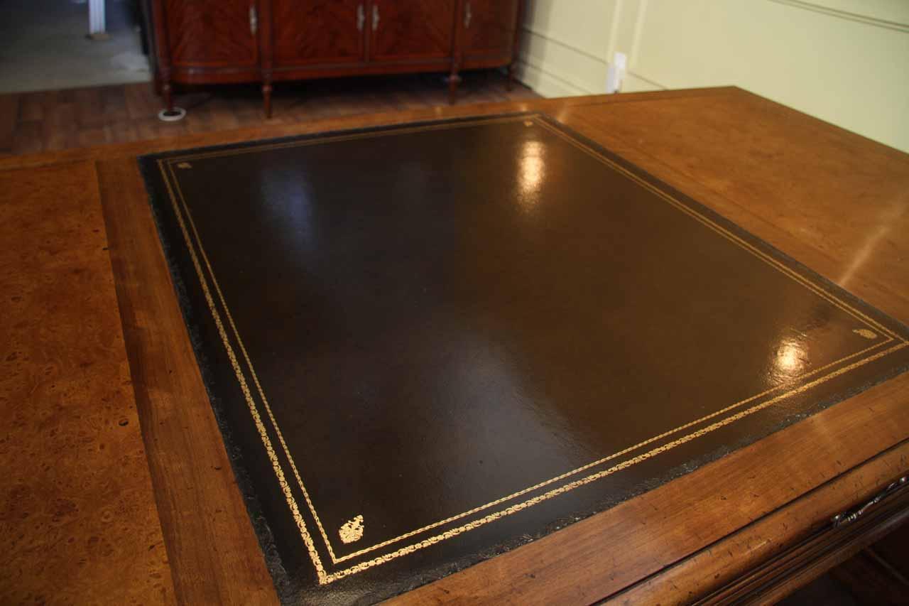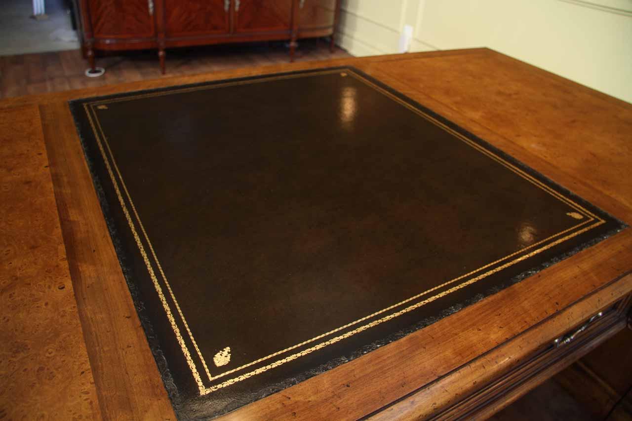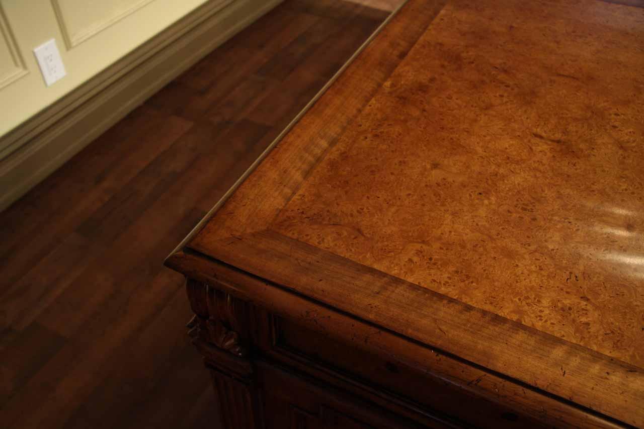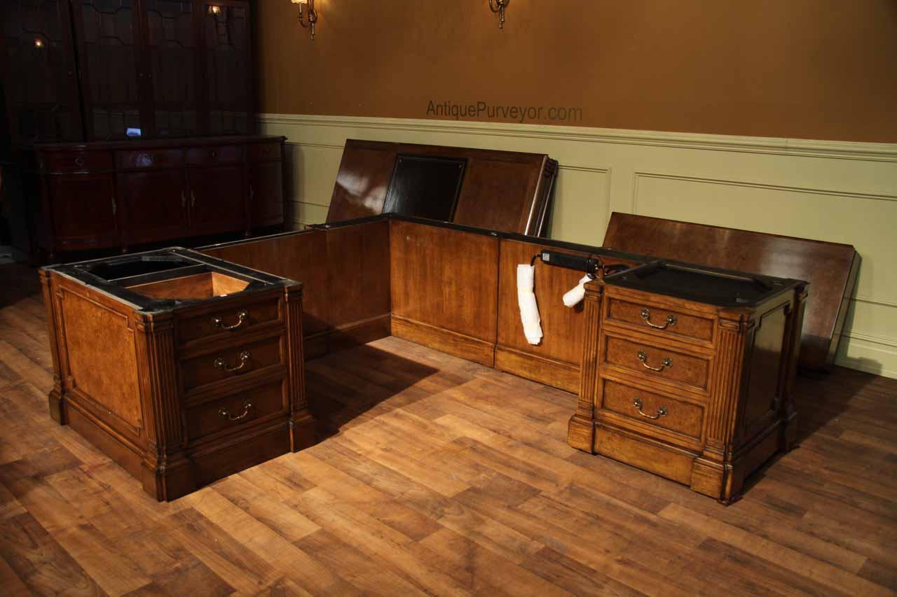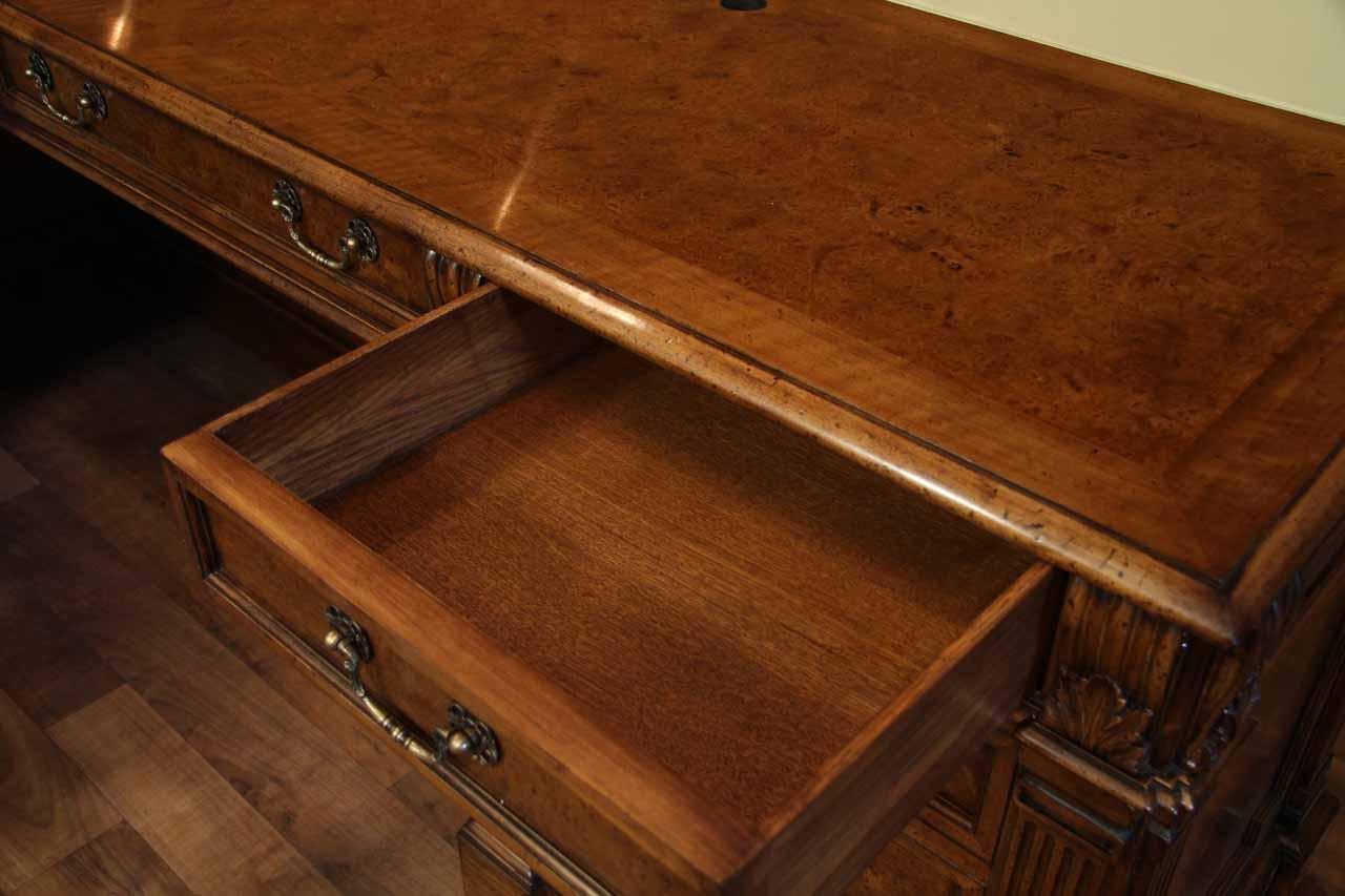 Traditional walnut leather top return desk available in left or right return configurations. A quality traditional return desk for an executive, reception area or for your home office. This is a very heavy and well made desk. It features quality leather with detailed tooling, solid oak drawers, wired surge protection with easy access power switch, wiring hole, printer or tower storage and sliding tray, keyboard drawer with kick out drawer face, burly walnut and mahogany solids. The cabinet in this traditional return desk also has a filing cabinet which is on the left side of this cabinet behind the drawer face. This return desk was made by an English cabinet maker in Cebu. The quality of this walnut leather top return desk is amazing, it is an overbuilt desk.