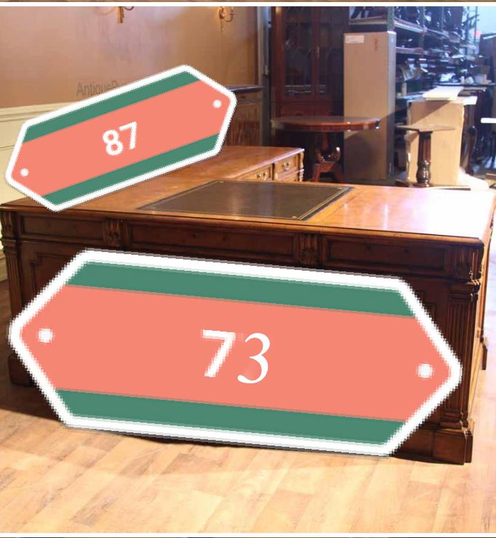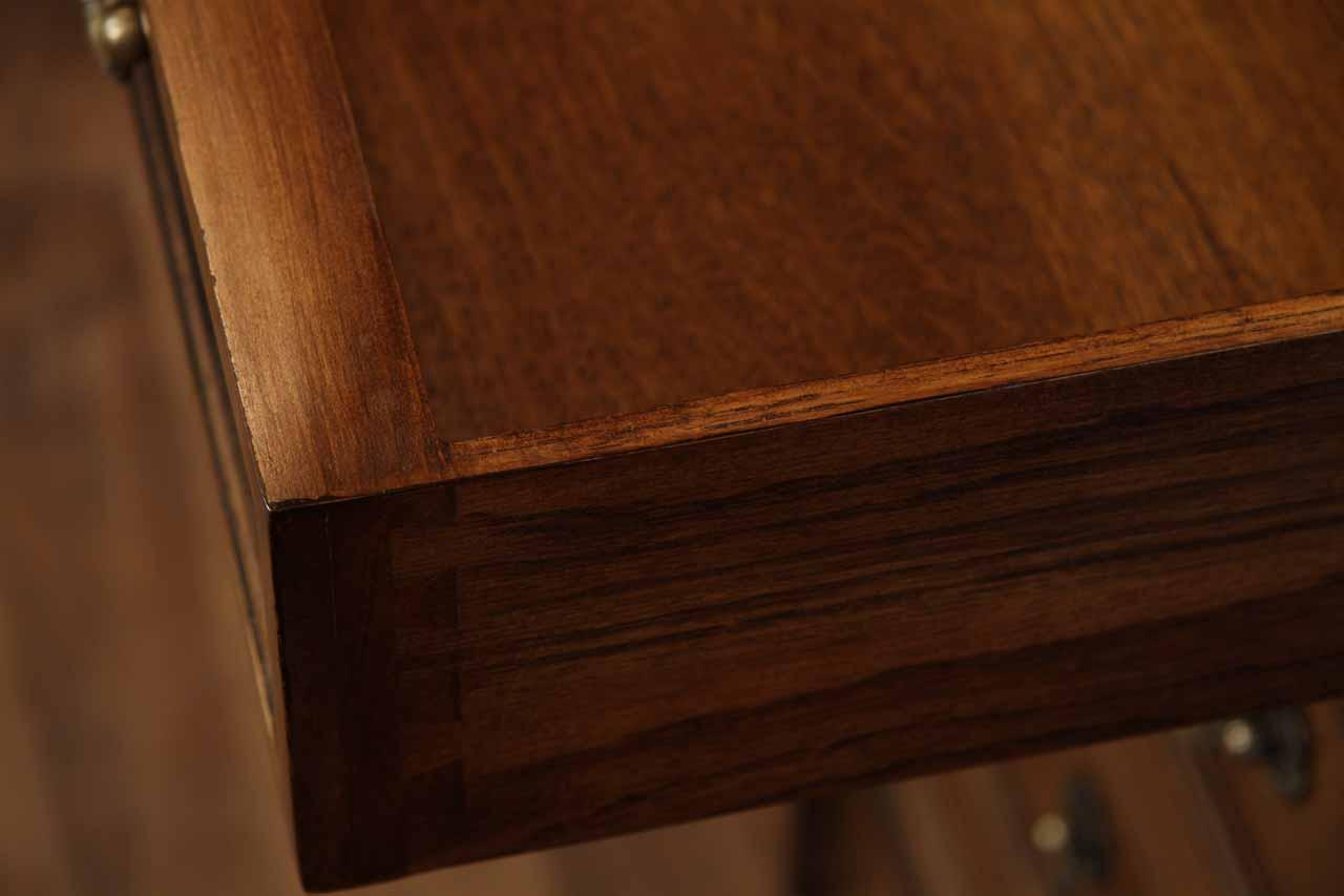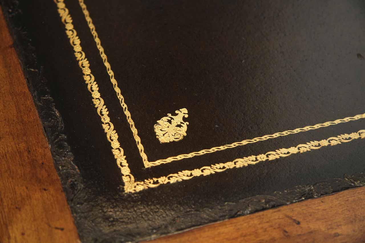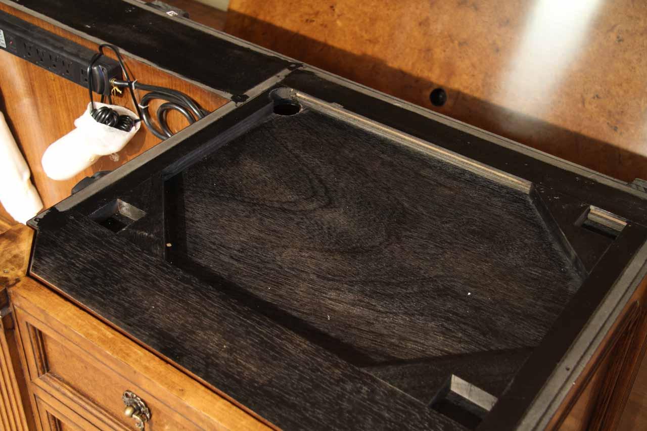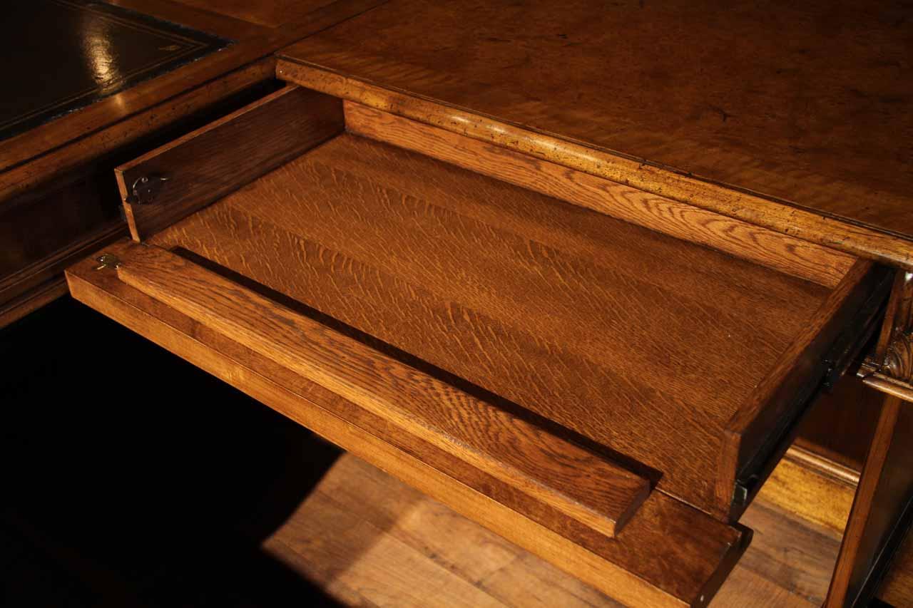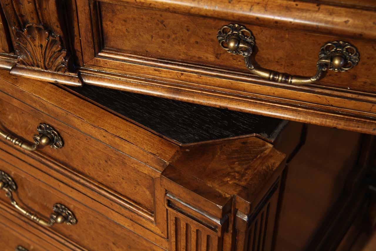 Traditional walnut leather top return desk available in left or right return configurations. A quality traditional return desk for an executive, reception area or for your home office. This is a very heavy and well made desk. It features quality leather with detailed tooling, solid oak drawers, wired surge protection with easy access power switch, wiring hole, printer or tower storage and sliding tray, keyboard drawer with kick out drawer face, burly walnut and mahogany solids. The cabinet in this traditional return desk also has a filing cabinet which is on the left side of this cabinet behind the drawer face. This return desk was made by an English cabinet maker in Cebu. The quality of this walnut leather top return desk is amazing, it is an overbuilt desk.