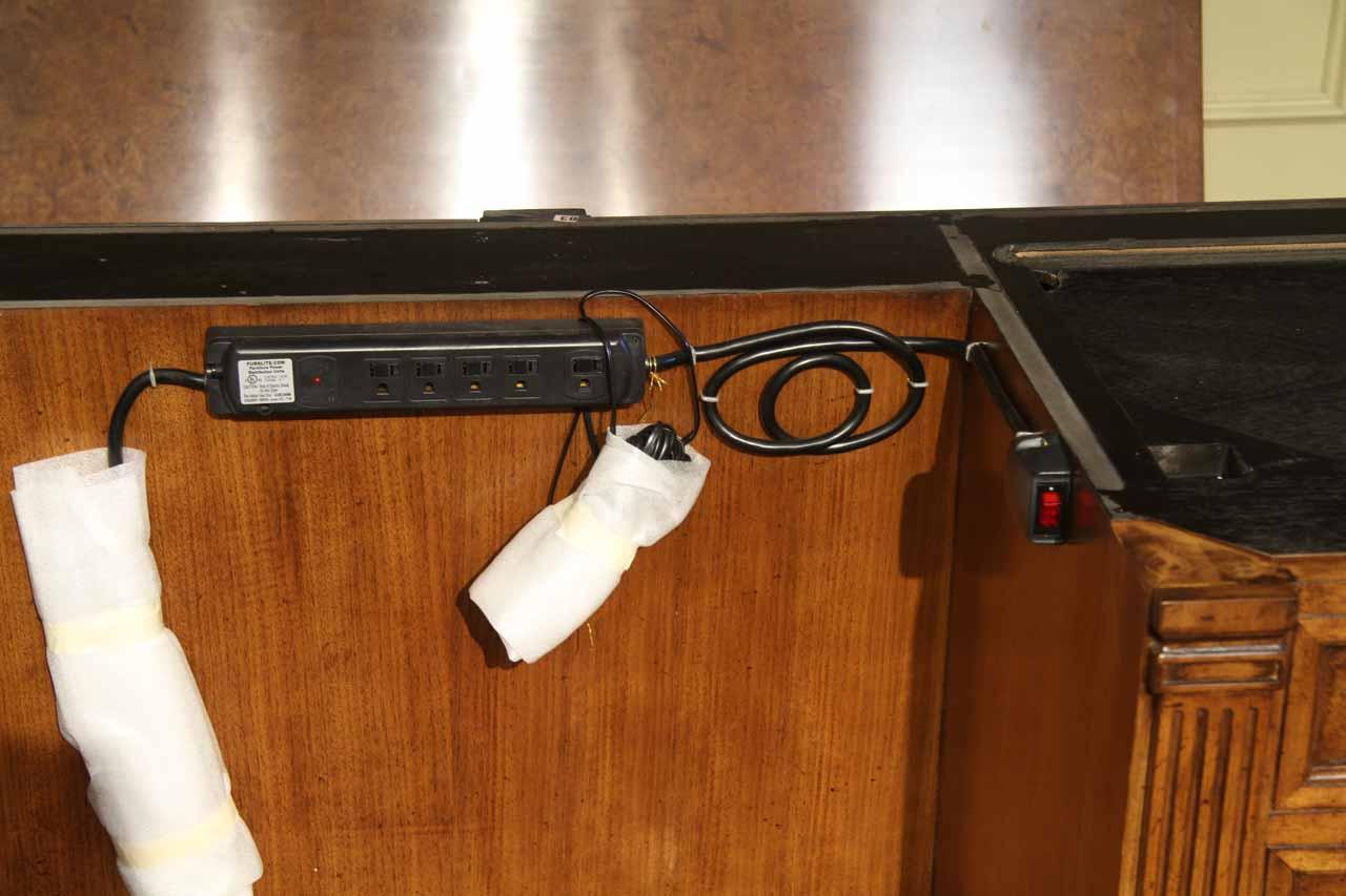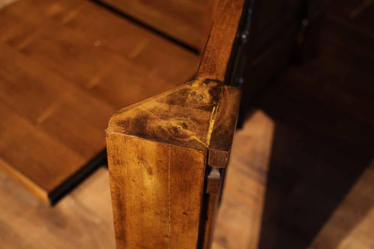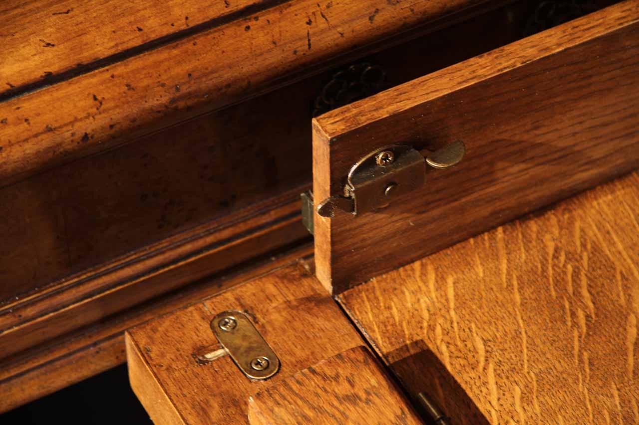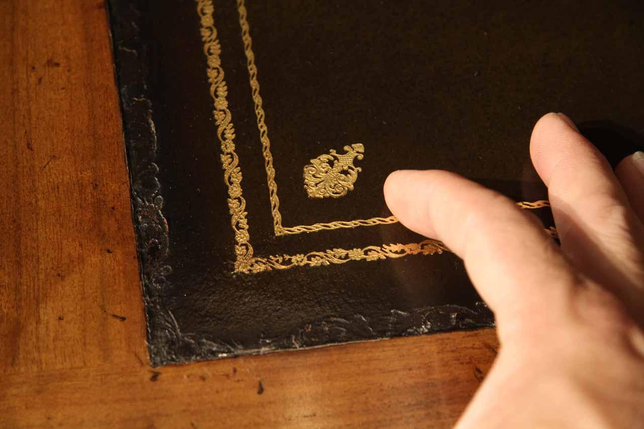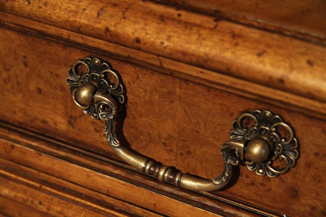 Traditional walnut leather top return desk available in left or right return configurations. A quality traditional return desk for an executive, reception area or for your home office. This is a very heavy and well made desk. It features quality leather with detailed tooling, solid oak drawers, wired surge protection with easy access power switch, wiring hole, printer or tower storage and sliding tray, keyboard drawer with kick out drawer face, burly walnut and mahogany solids. The cabinet in this traditional return desk also has a filing cabinet which is on the left side of this cabinet behind the drawer face. This return desk was made by an English cabinet maker in Cebu. The quality of this walnut leather top return desk is amazing, it is an overbuilt desk.