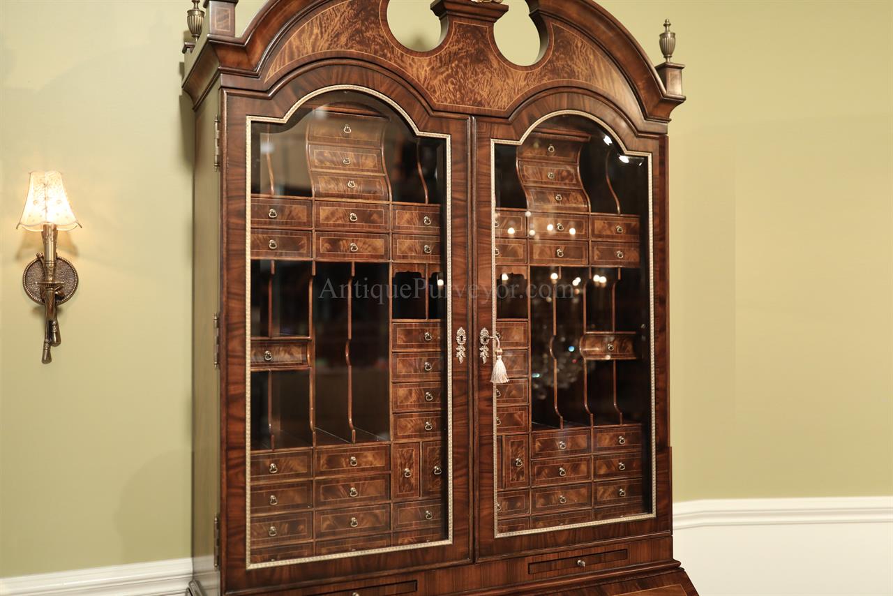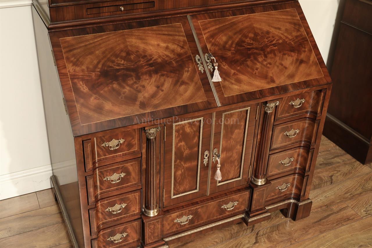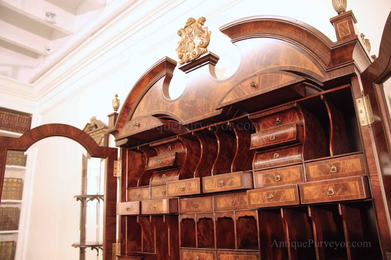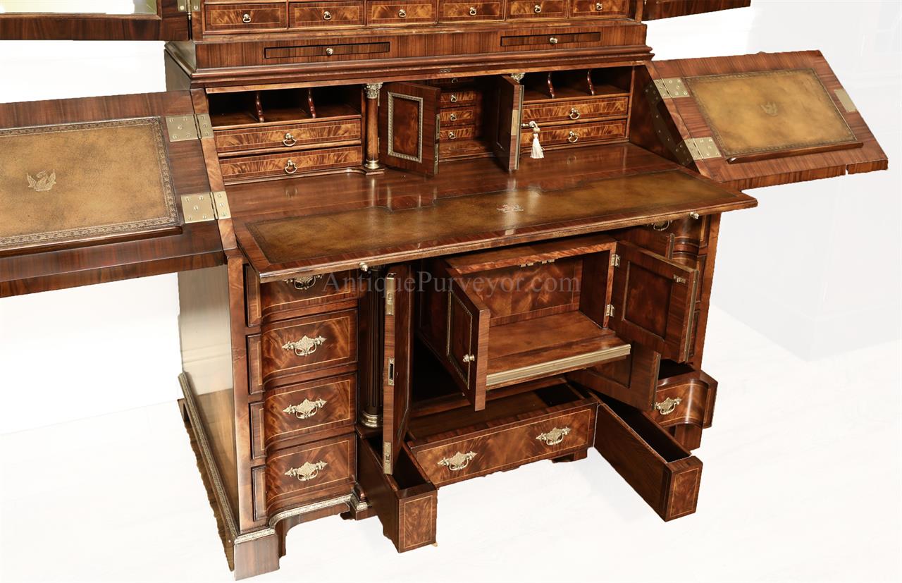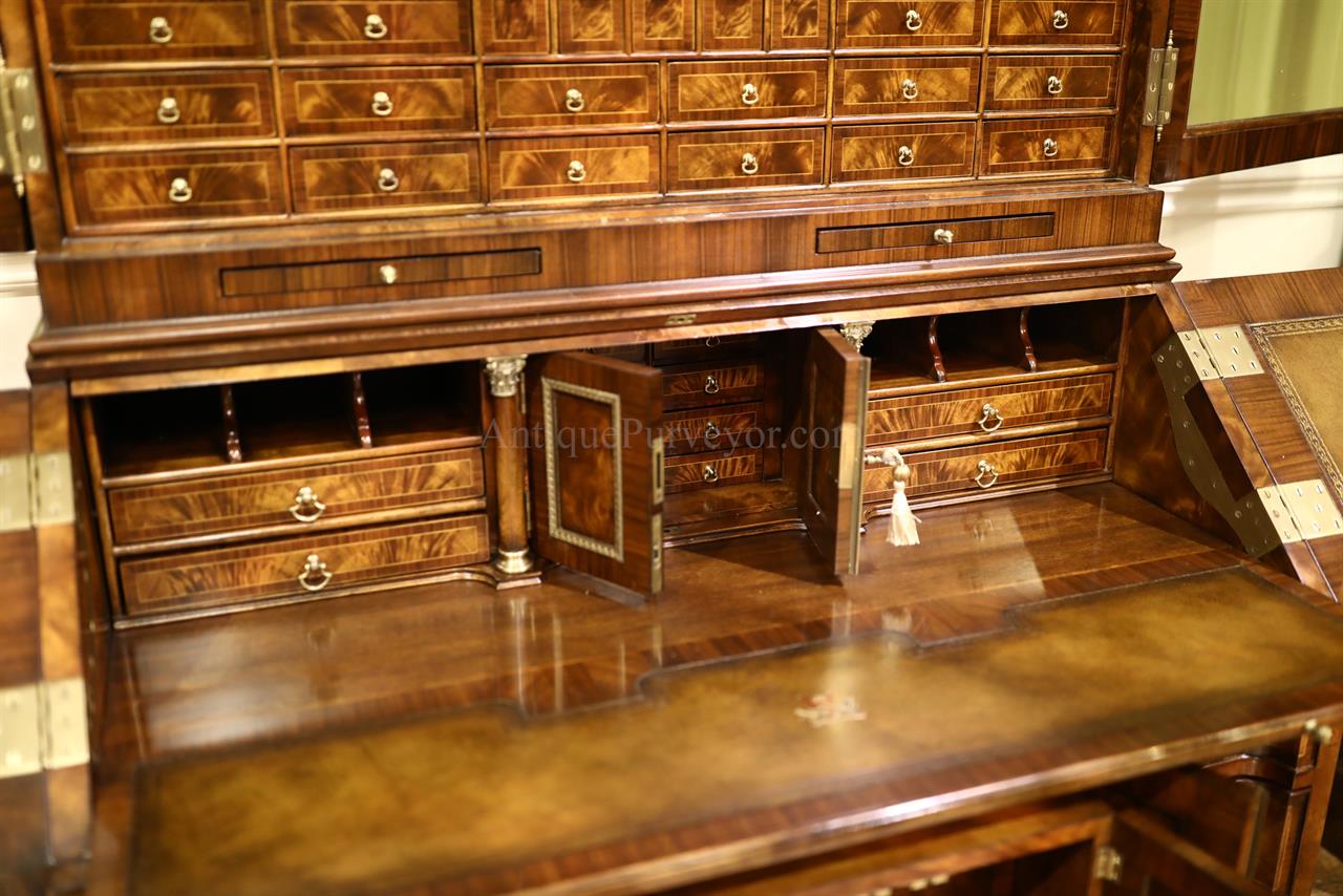 Luxurious mahogany secretary desk with over 45 drawers and 19 pigeon holes. This desk is 900 pounds! Every drawer is dovetailed, even the smallest drawers within the cabinet are tongue and groove. This secretary desk was manufactured by skilled artisans with traditional methods and it is a high-end 18th century antique reproduction built for a luxurious estate, stately home, grand foyer or historic site. This desk is loaded with details. Desk is made from mahogany solids and fancier rosewood and flame mahogany Veneers. Desk has architectural brass cornices and gilt crest above two locking glass doors which enclose 45 drawers and 19 pigeon holes. Below the glass case is an opening slant lid desk with leather inset pull-out trays. The bottom of cabinet has two more locking doors in front of many secretive compartments which traditional secretaries are known for.