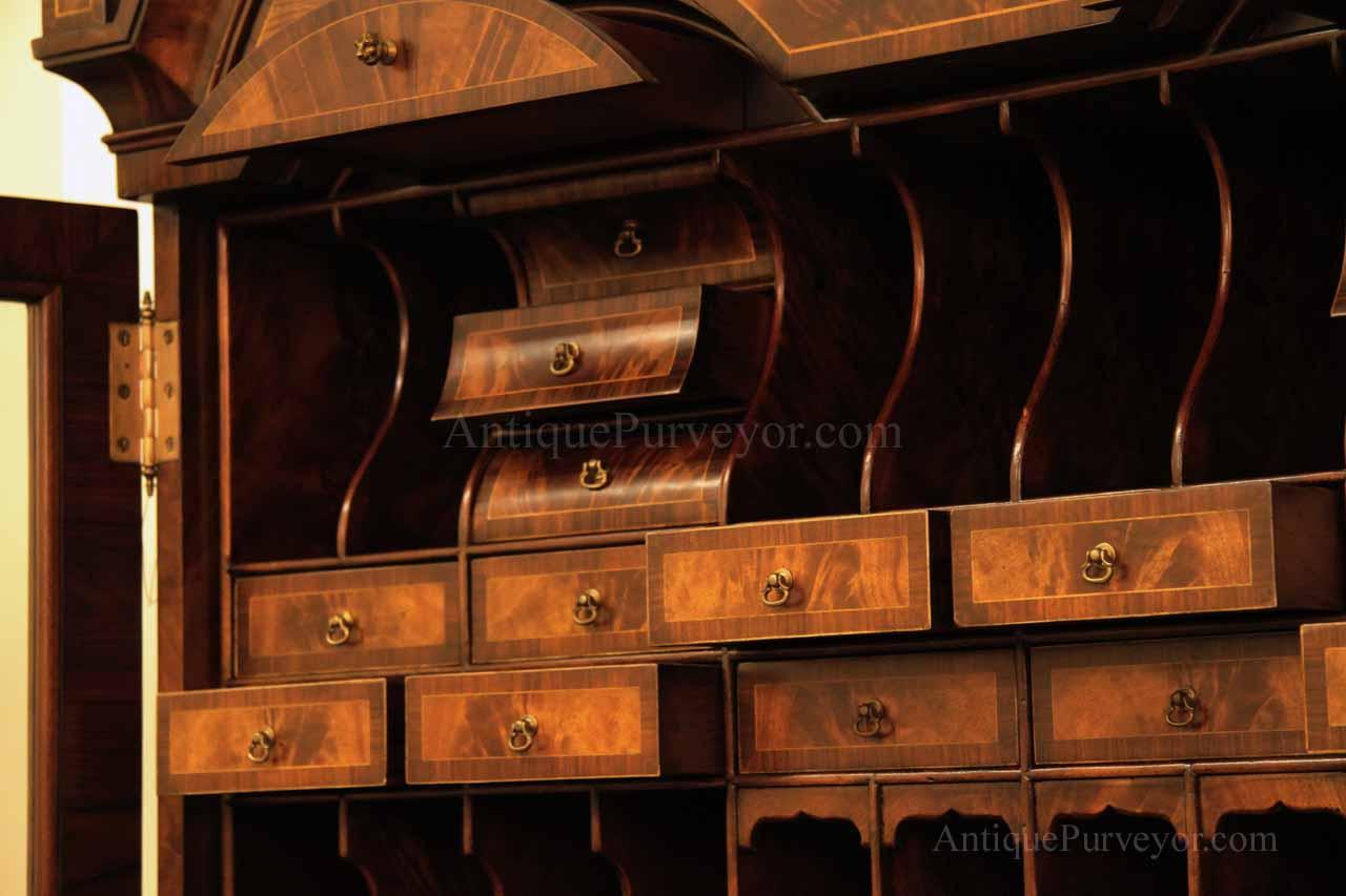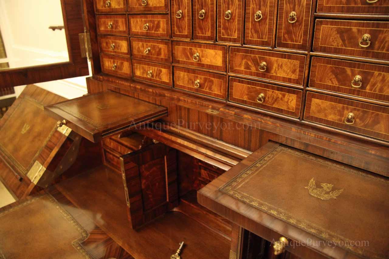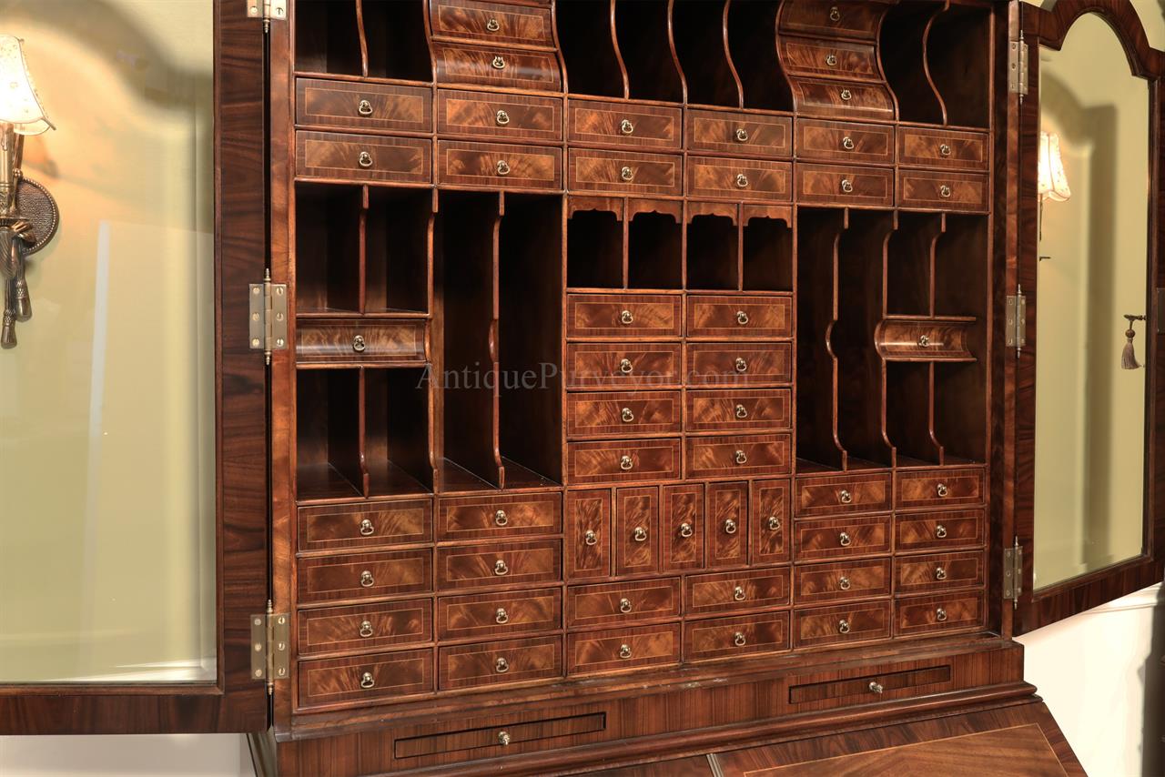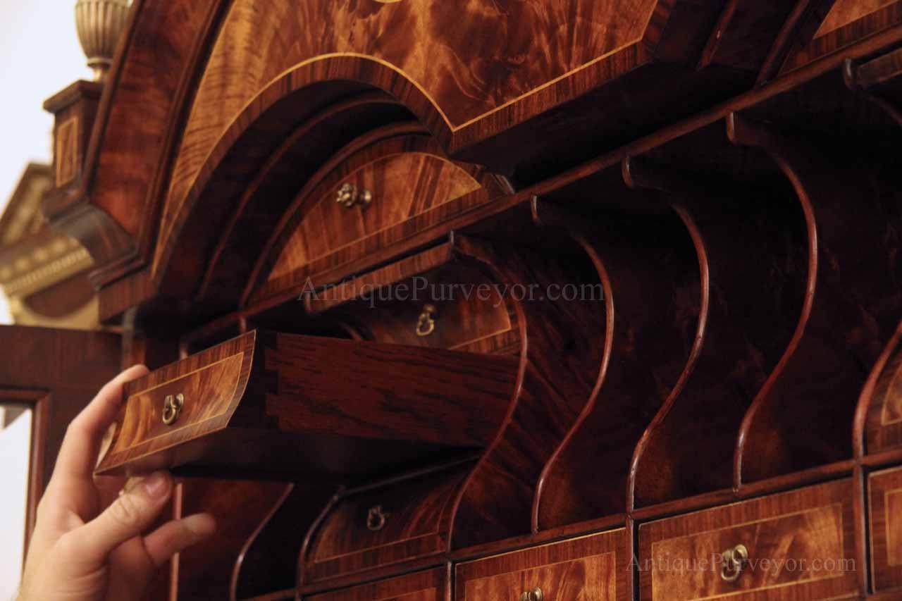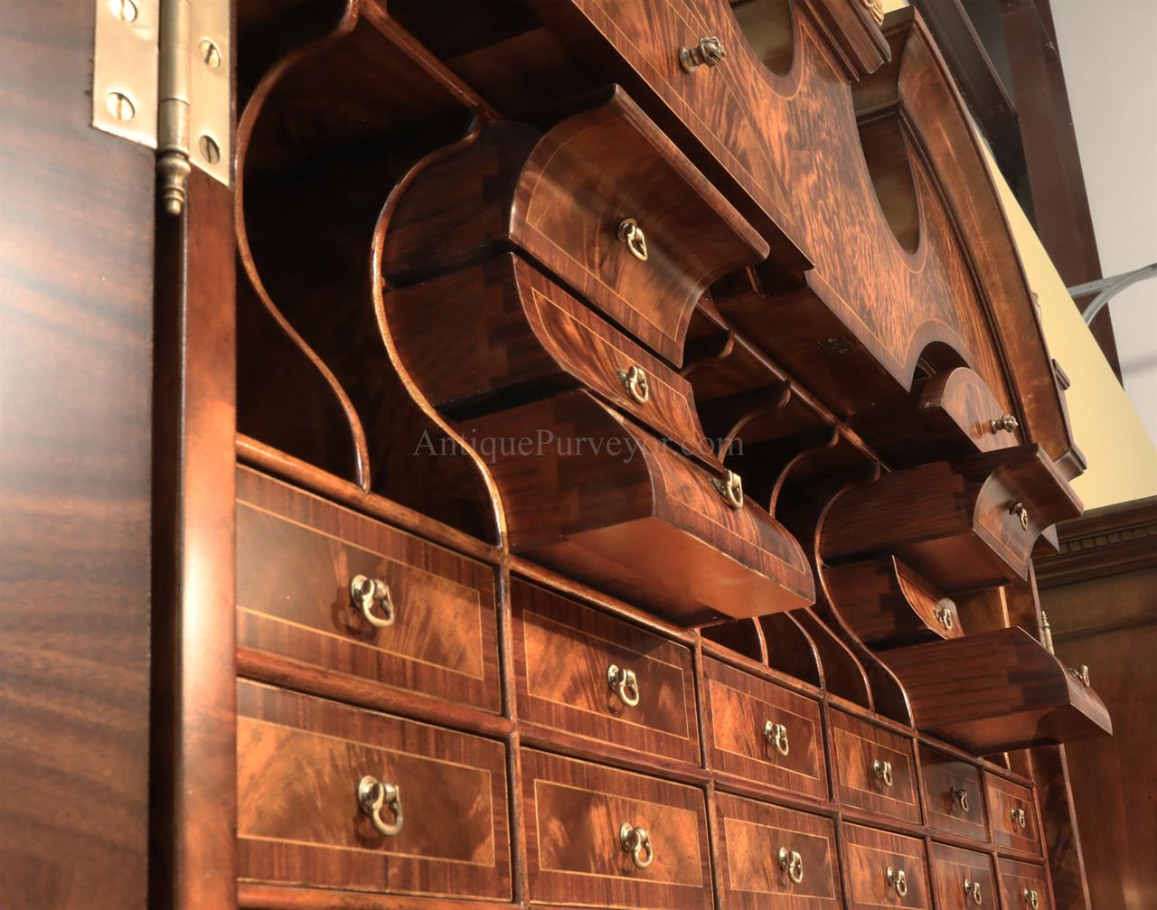 Luxurious mahogany secretary desk with over 45 drawers and 19 pigeon holes. This desk is 900 pounds! Every drawer is dovetailed, even the smallest drawers within the cabinet are tongue and groove. This secretary desk was manufactured by skilled artisans with traditional methods and it is a high-end 18th century antique reproduction built for a luxurious estate, stately home, grand foyer or historic site. This desk is loaded with details. Desk is made from mahogany solids and fancier rosewood and flame mahogany Veneers. Desk has architectural brass cornices and gilt crest above two locking glass doors which enclose 45 drawers and 19 pigeon holes. Below the glass case is an opening slant lid desk with leather inset pull-out trays. The bottom of cabinet has two more locking doors in front of many secretive compartments which traditional secretaries are known for.