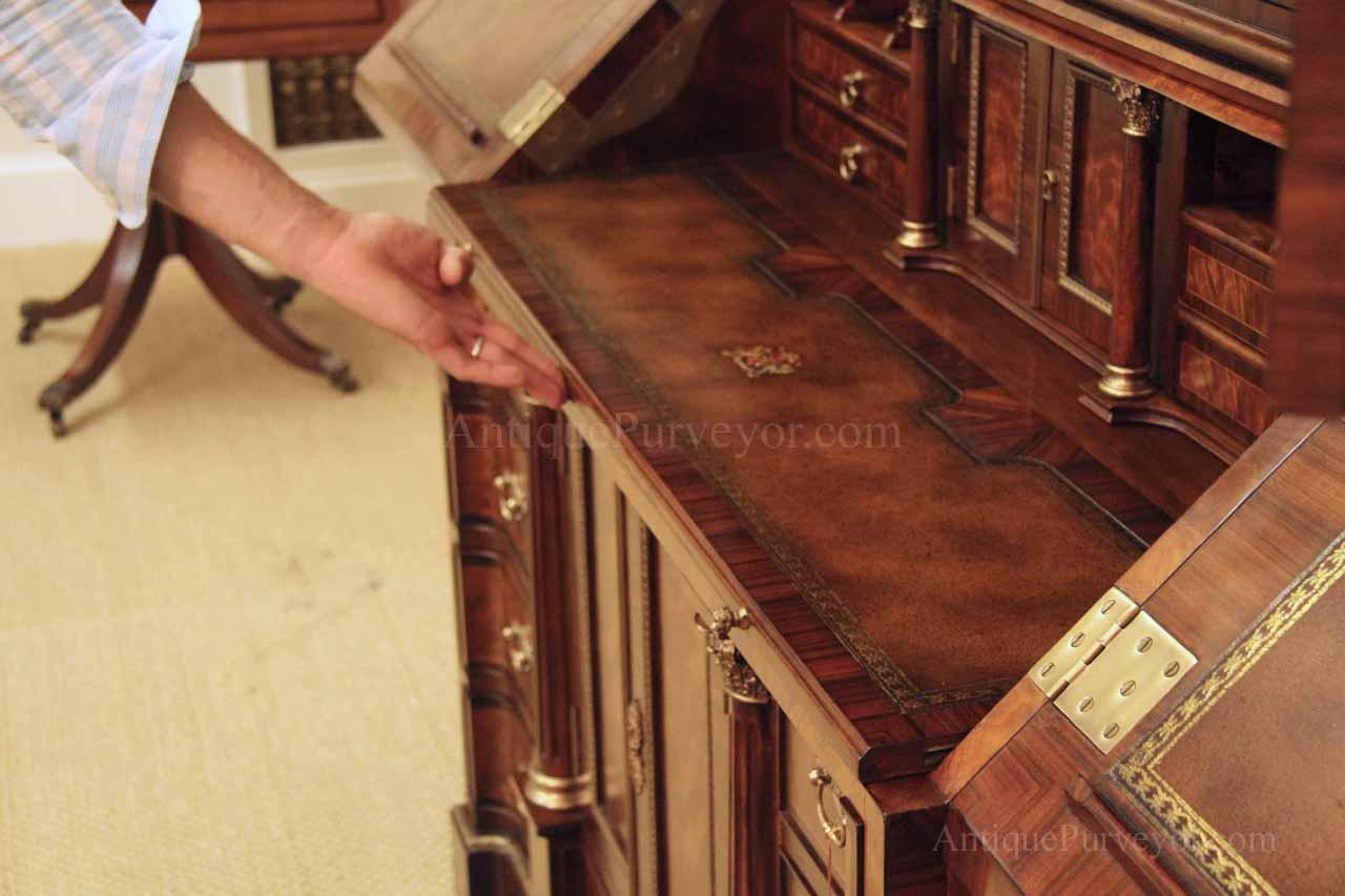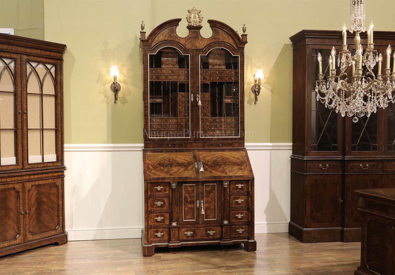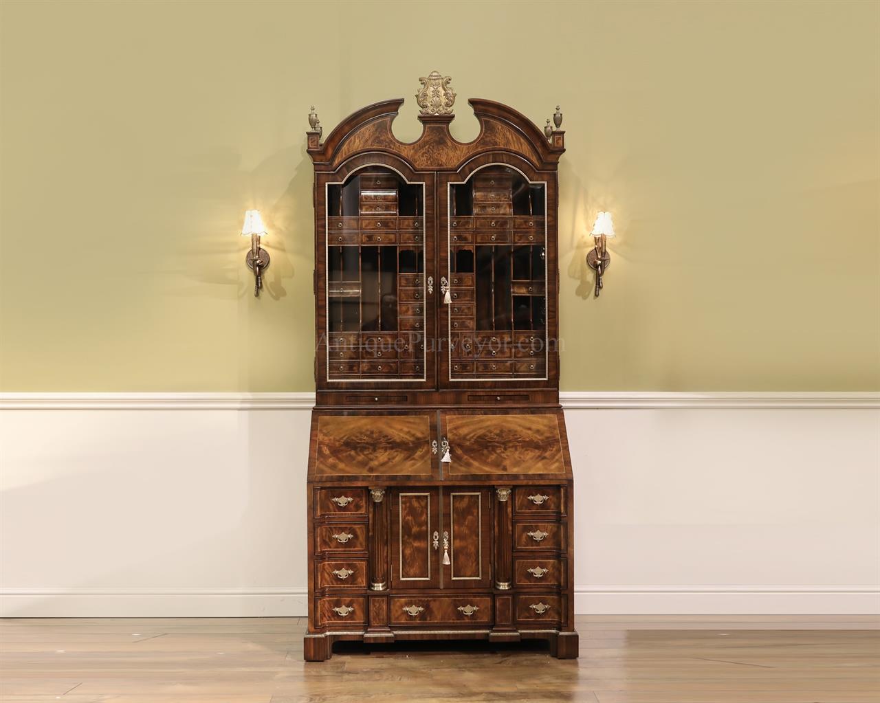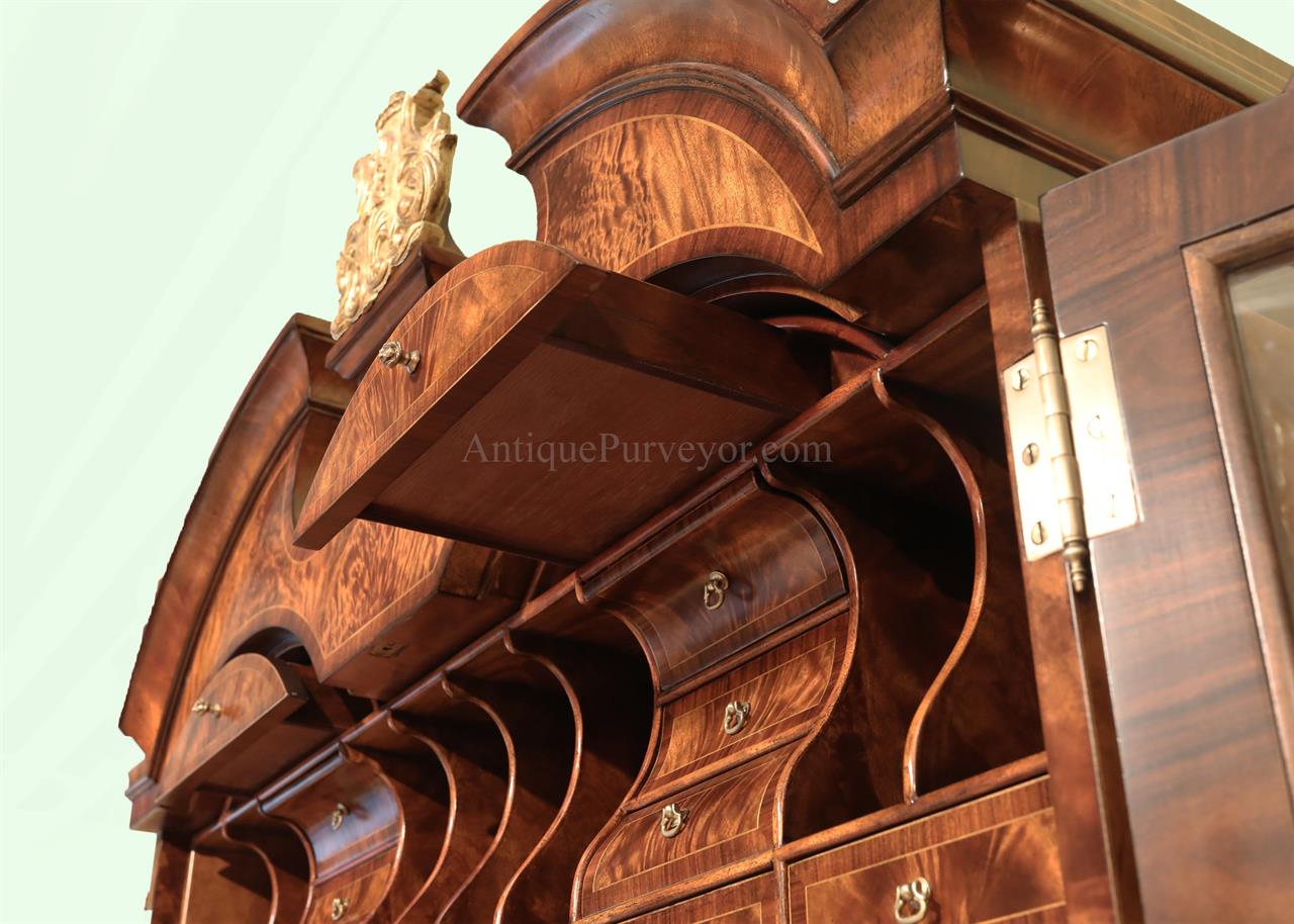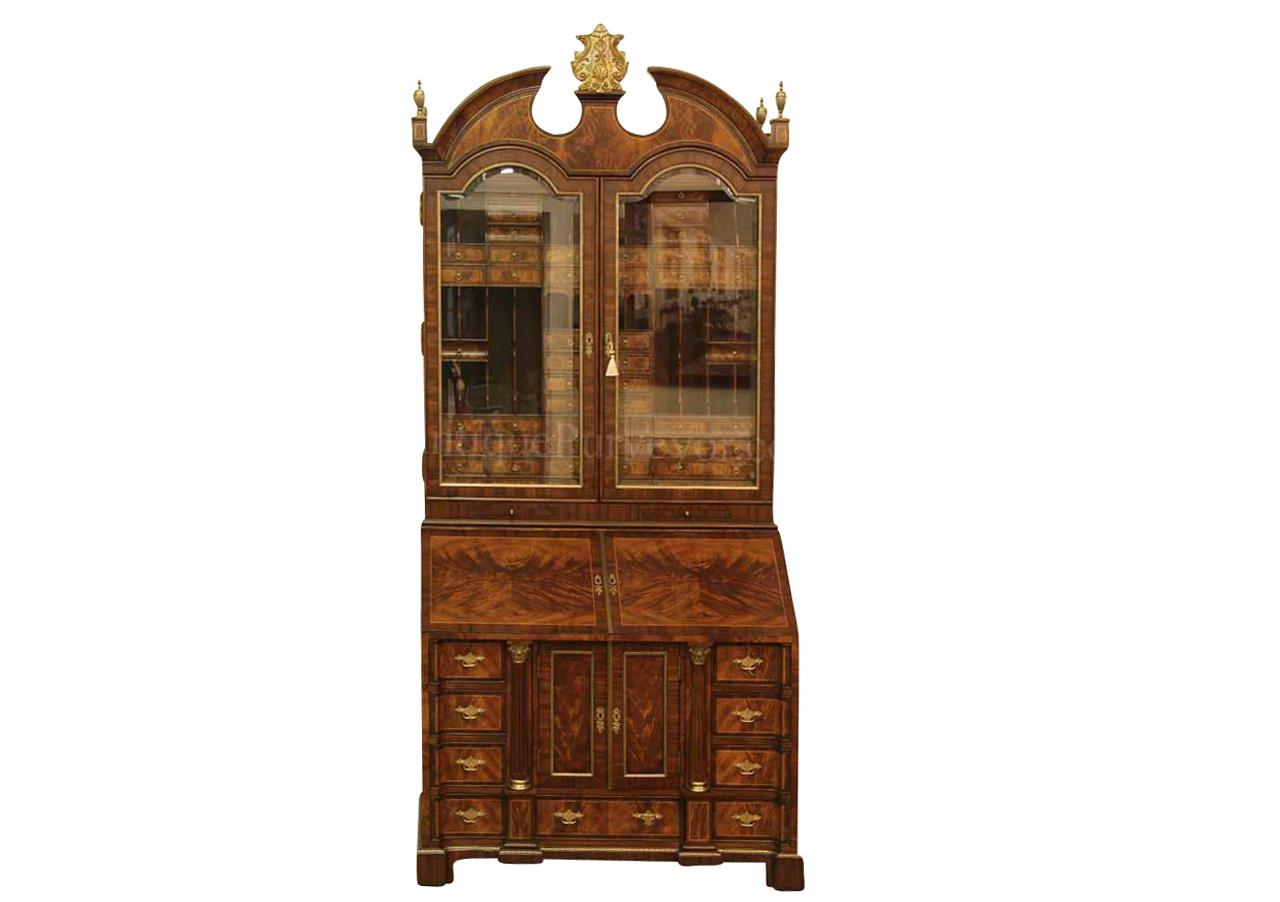 Luxurious mahogany secretary desk with over 45 drawers and 19 pigeon holes. This desk is 900 pounds! Every drawer is dovetailed, even the smallest drawers within the cabinet are tongue and groove. This secretary desk was manufactured by skilled artisans with traditional methods and it is a high-end 18th century antique reproduction built for a luxurious estate, stately home, grand foyer or historic site. This desk is loaded with details. Desk is made from mahogany solids and fancier rosewood and flame mahogany Veneers. Desk has architectural brass cornices and gilt crest above two locking glass doors which enclose 45 drawers and 19 pigeon holes. Below the glass case is an opening slant lid desk with leather inset pull-out trays. The bottom of cabinet has two more locking doors in front of many secretive compartments which traditional secretaries are known for.