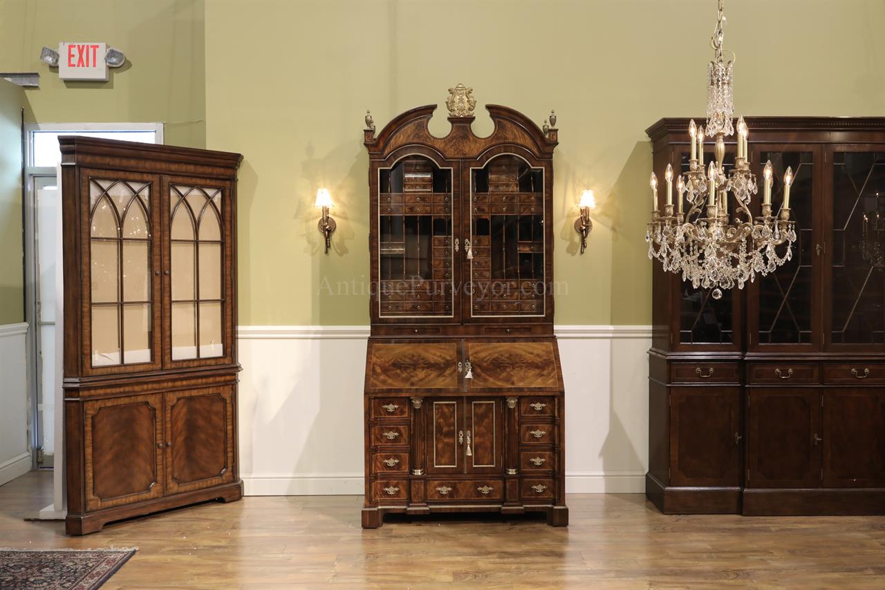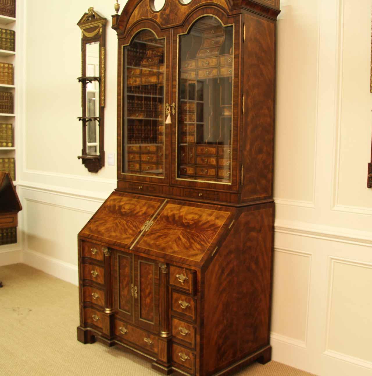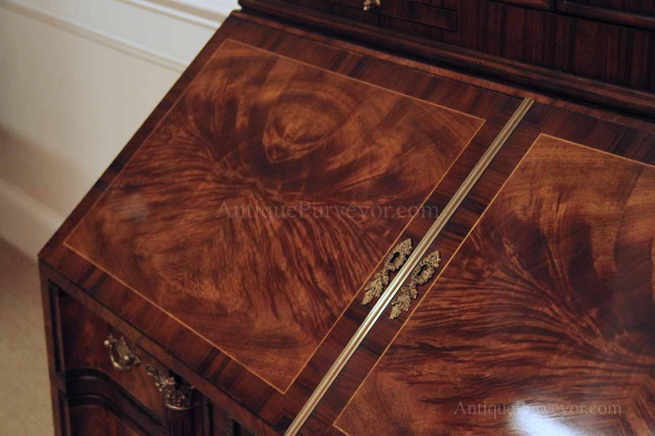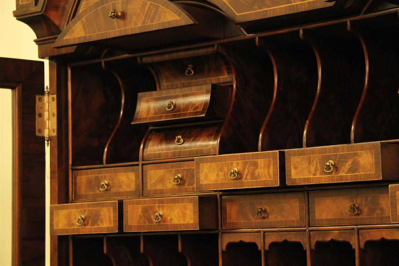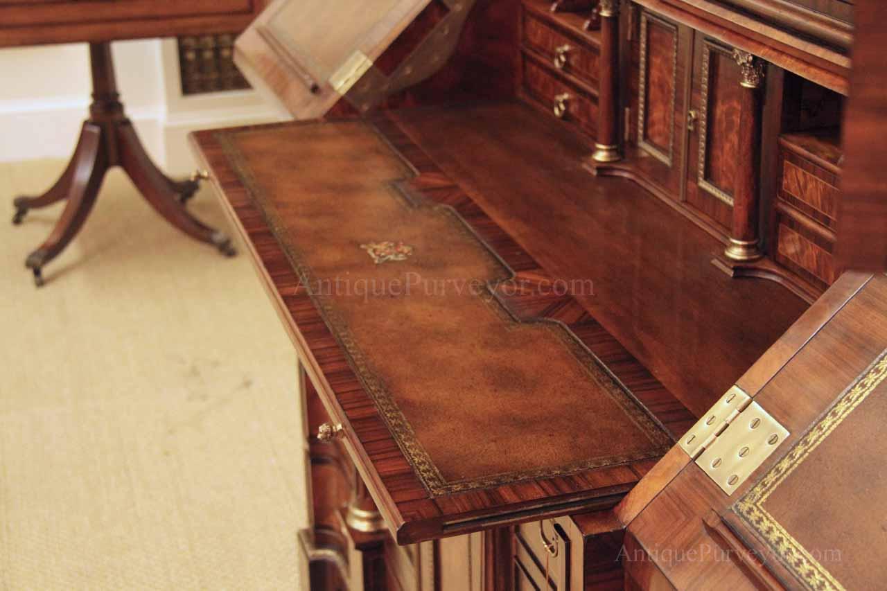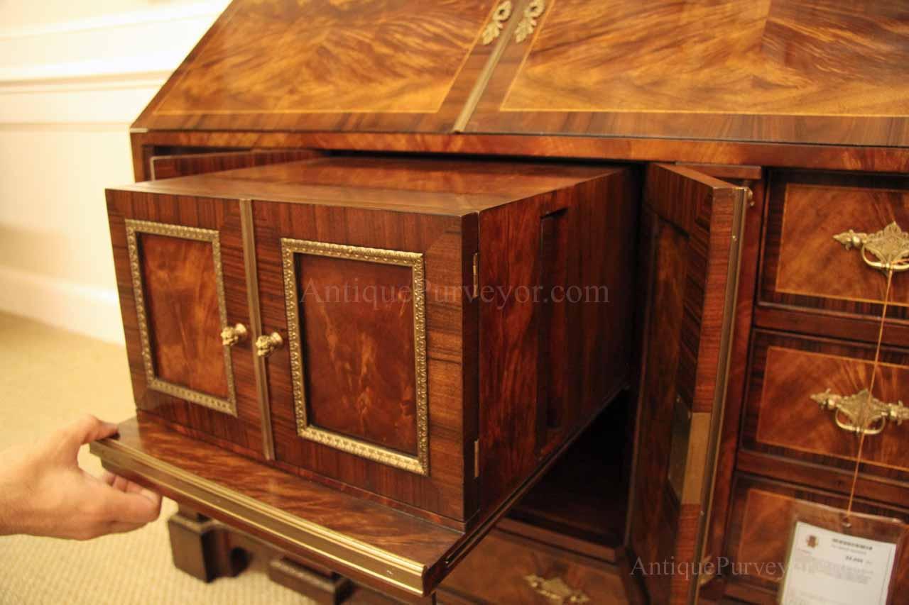 Luxurious mahogany secretary desk with over 45 drawers and 19 pigeon holes. This desk is 900 pounds! Every drawer is dovetailed, even the smallest drawers within the cabinet are tongue and groove. This secretary desk was manufactured by skilled artisans with traditional methods and it is a high-end 18th century antique reproduction built for a luxurious estate, stately home, grand foyer or historic site. This desk is loaded with details. Desk is made from mahogany solids and fancier rosewood and flame mahogany Veneers. Desk has architectural brass cornices and gilt crest above two locking glass doors which enclose 45 drawers and 19 pigeon holes. Below the glass case is an opening slant lid desk with leather inset pull-out trays. The bottom of cabinet has two more locking doors in front of many secretive compartments which traditional secretaries are known for.