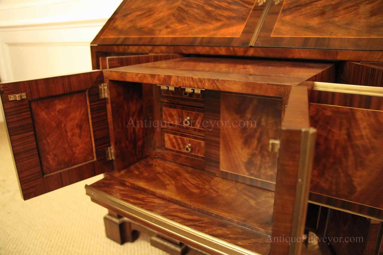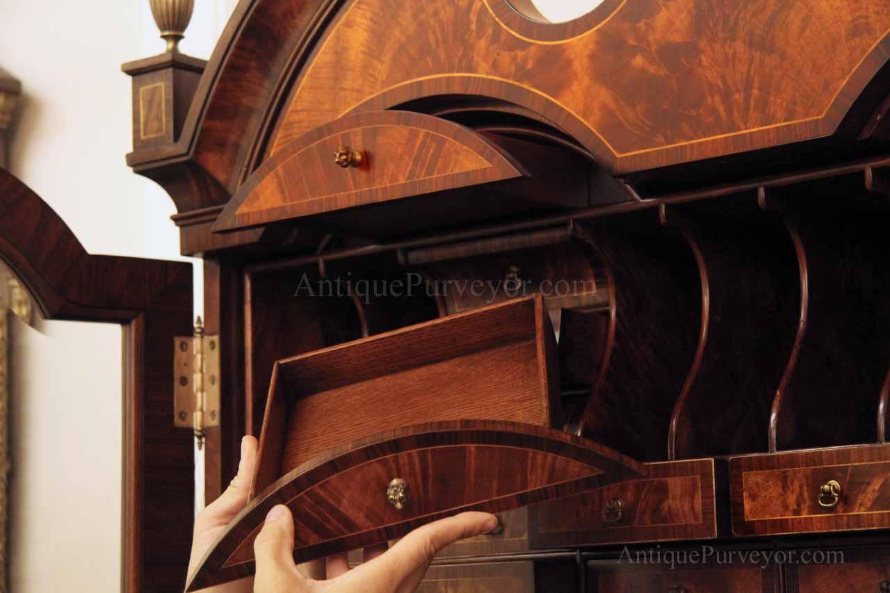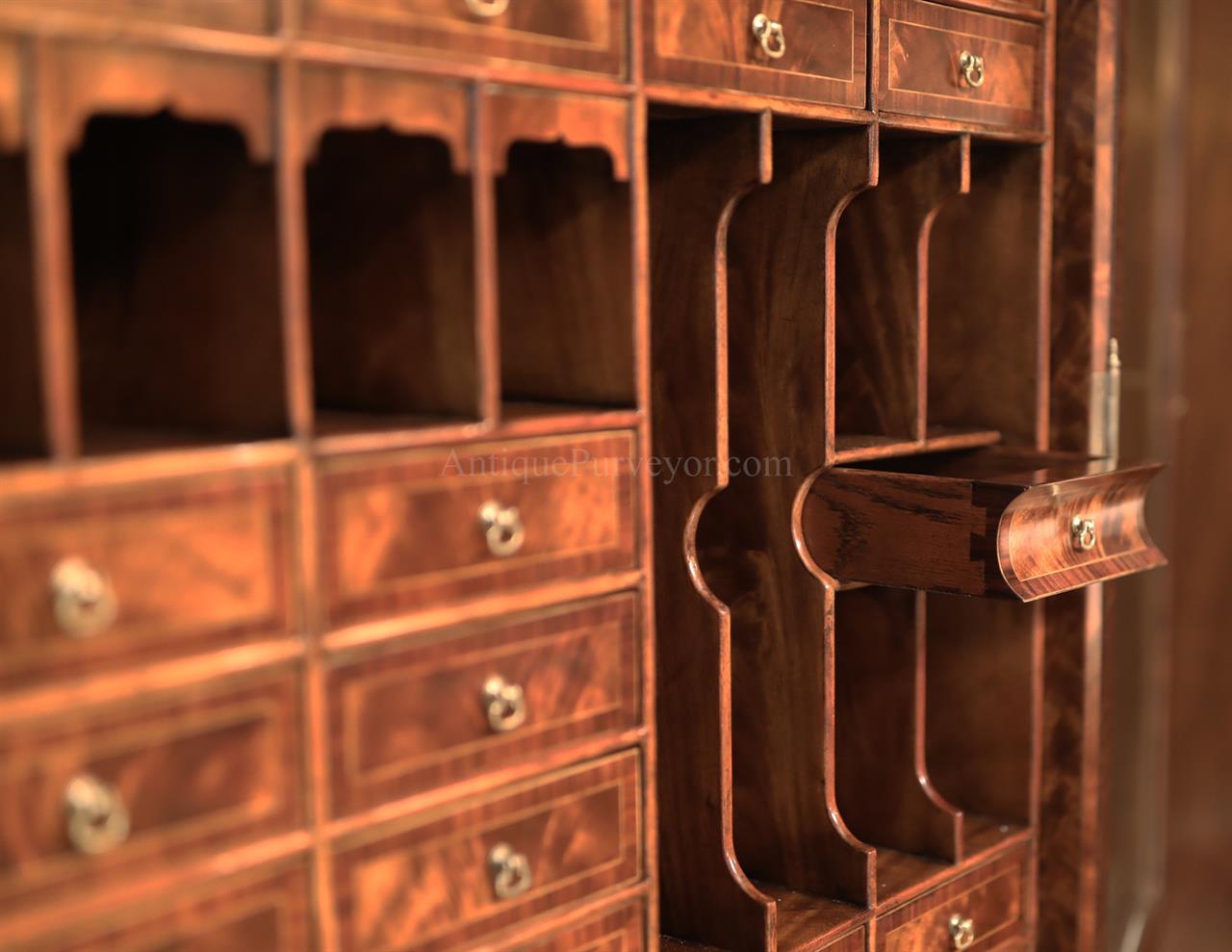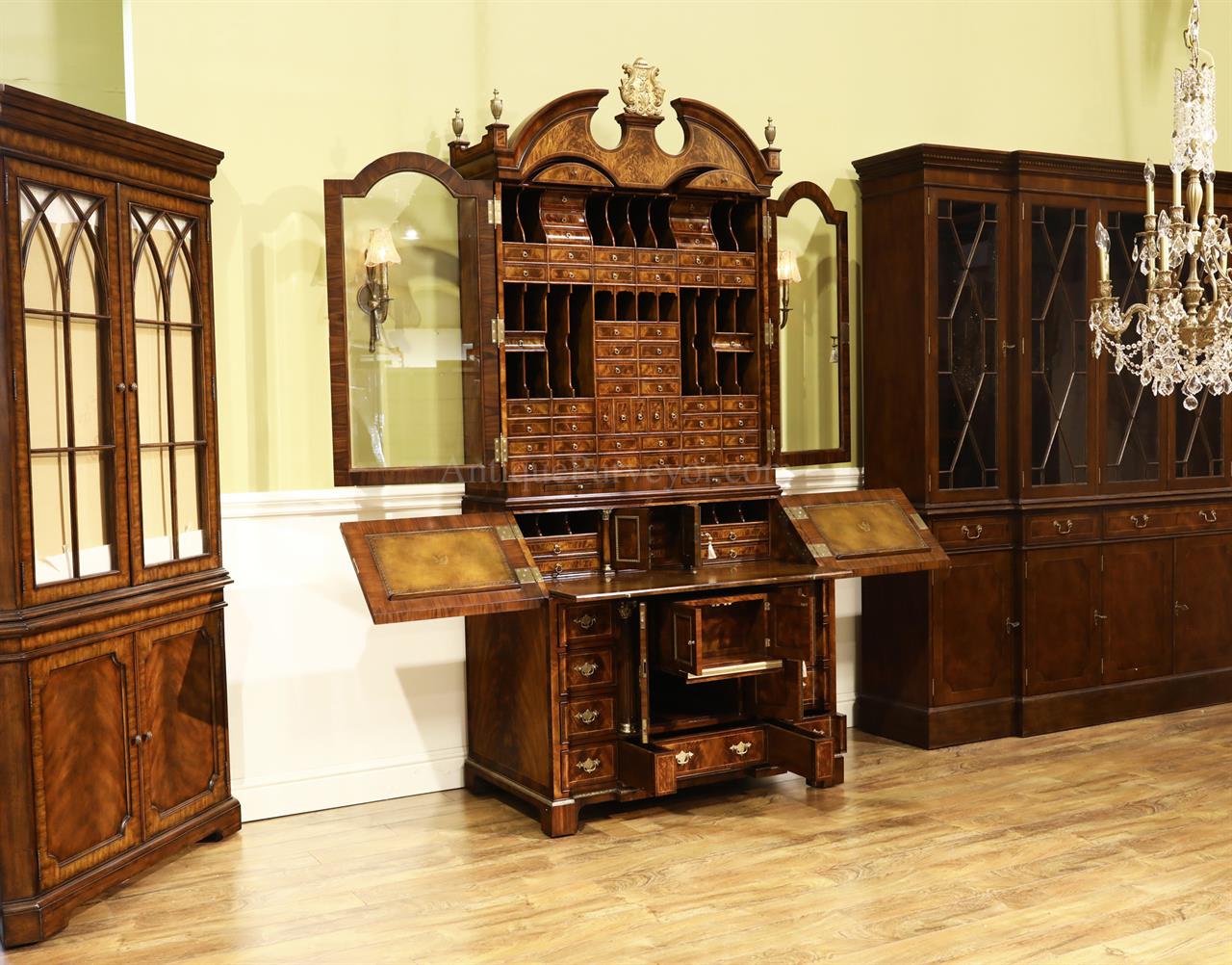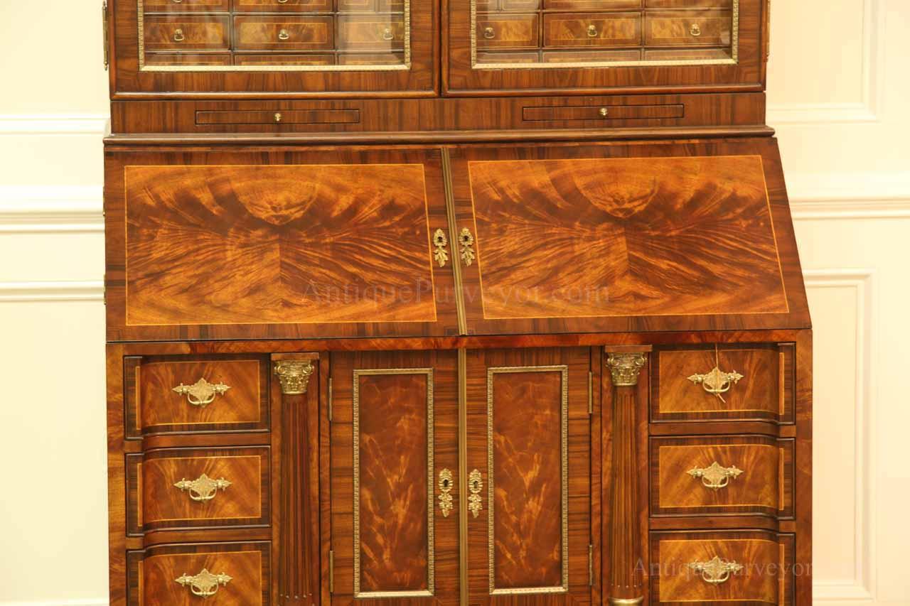Luxurious mahogany secretary desk with over 45 drawers and 19 pigeon holes. This desk is 900 pounds! Every drawer is dovetailed, even the smallest drawers within the cabinet are tongue and groove. This secretary desk was manufactured by skilled artisans with traditional methods and it is a high-end 18th century antique reproduction built for a luxurious estate, stately home, grand foyer or historic site. This desk is loaded with details. Desk is made from mahogany solids and fancier rosewood and flame mahogany Veneers. Desk has architectural brass cornices and gilt crest above two locking glass doors which enclose 45 drawers and 19 pigeon holes. Below the glass case is an opening slant lid desk with leather inset pull-out trays. The bottom of cabinet has two more locking doors in front of many secretive compartments which traditional secretaries are known for.