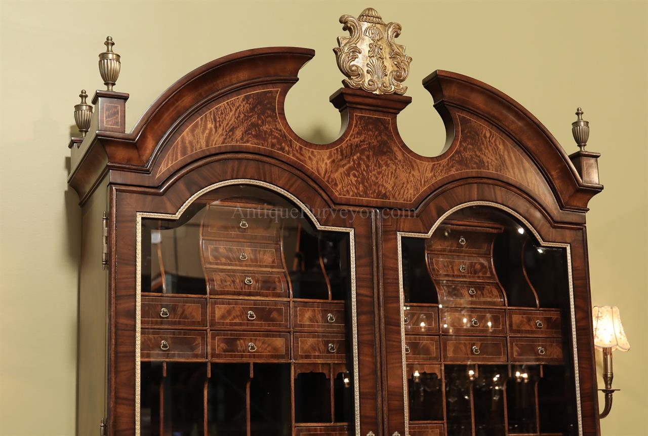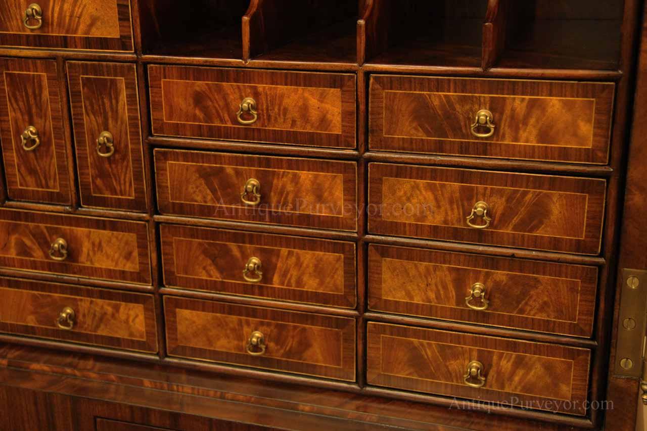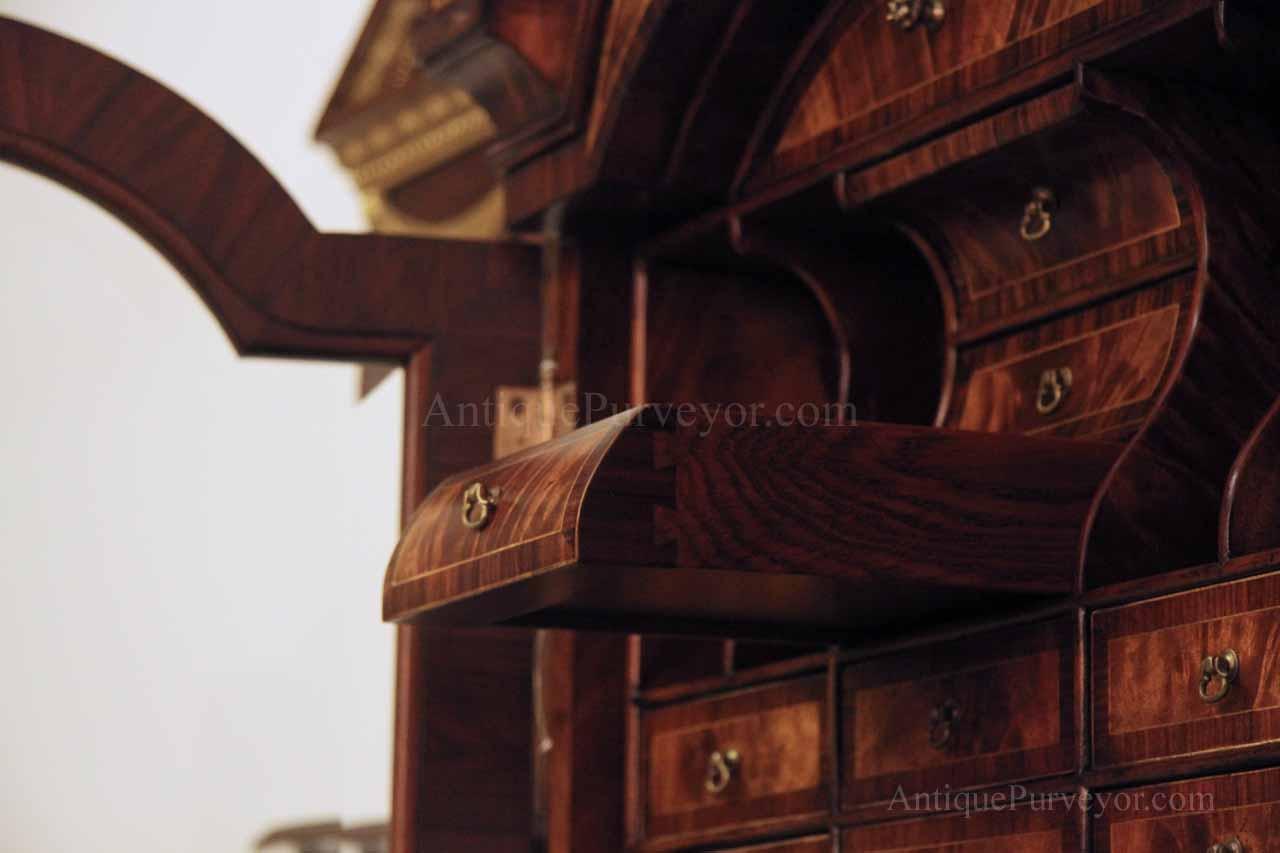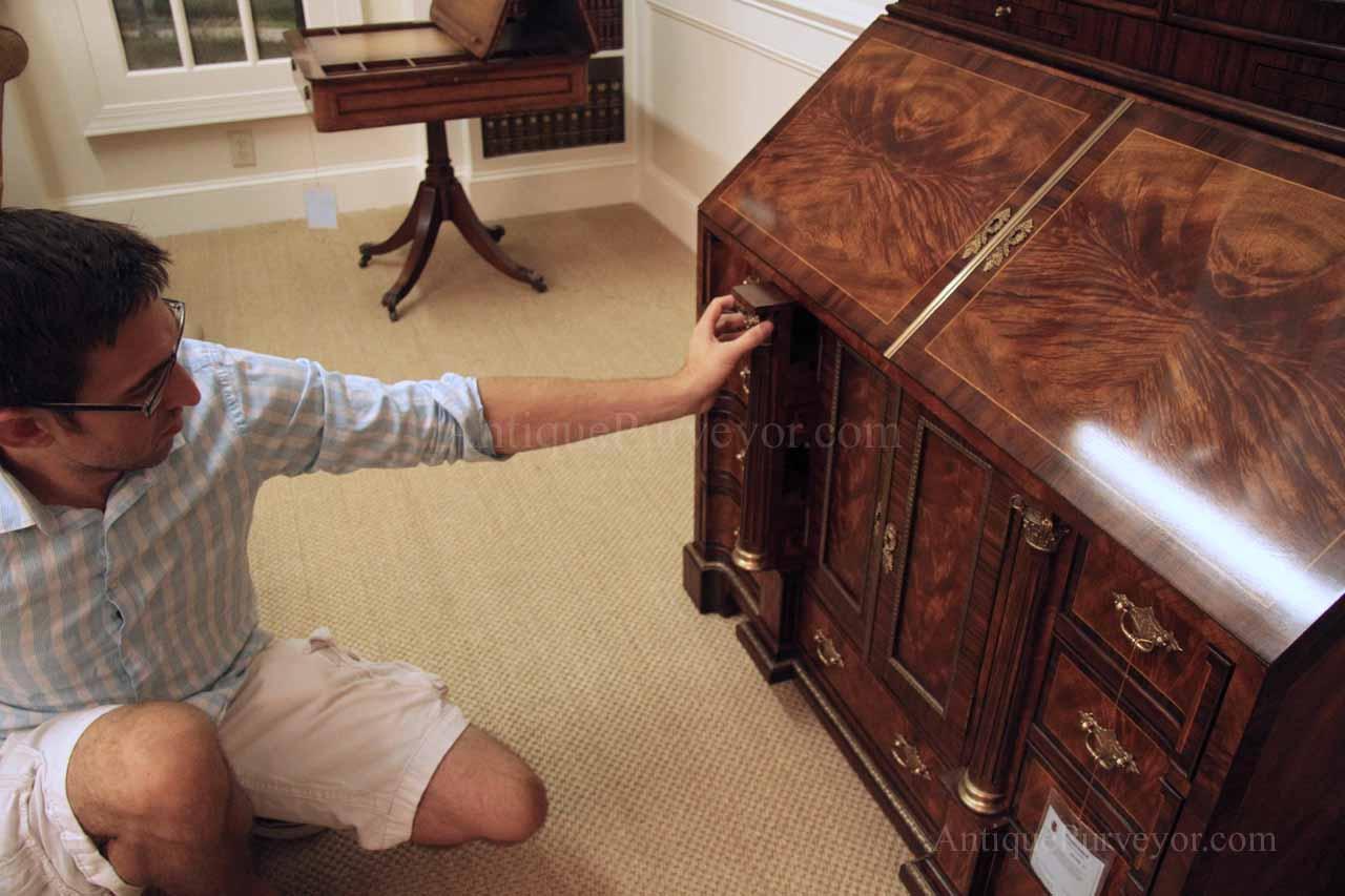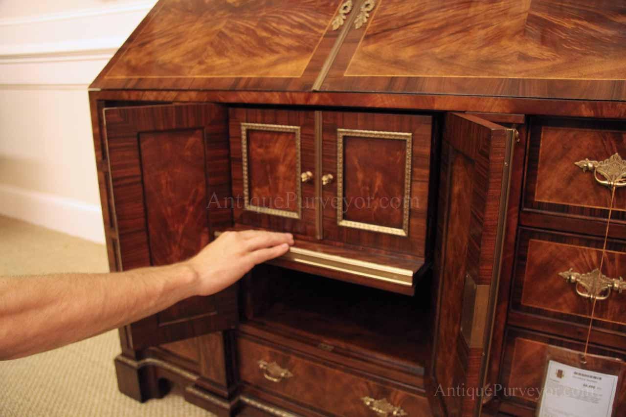 Luxurious mahogany secretary desk with over 45 drawers and 19 pigeon holes. This desk is 900 pounds! Every drawer is dovetailed, even the smallest drawers within the cabinet are tongue and groove. This secretary desk was manufactured by skilled artisans with traditional methods and it is a high-end 18th century antique reproduction built for a luxurious estate, stately home, grand foyer or historic site. This desk is loaded with details. Desk is made from mahogany solids and fancier rosewood and flame mahogany Veneers. Desk has architectural brass cornices and gilt crest above two locking glass doors which enclose 45 drawers and 19 pigeon holes. Below the glass case is an opening slant lid desk with leather inset pull-out trays. The bottom of cabinet has two more locking doors in front of many secretive compartments which traditional secretaries are known for.