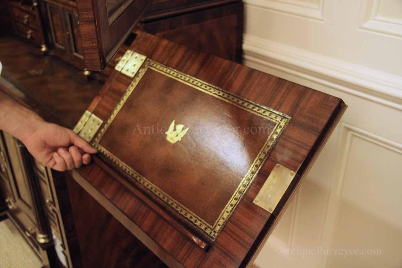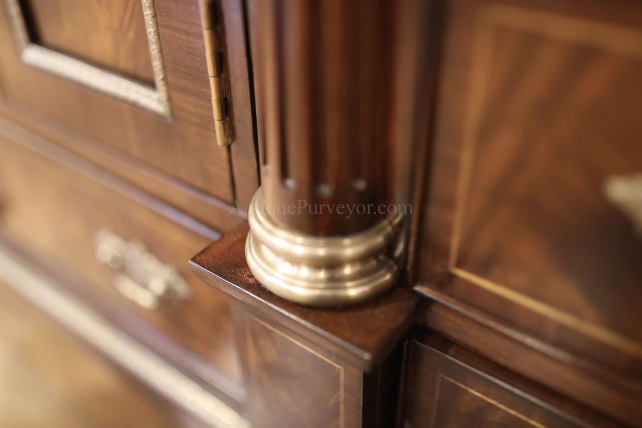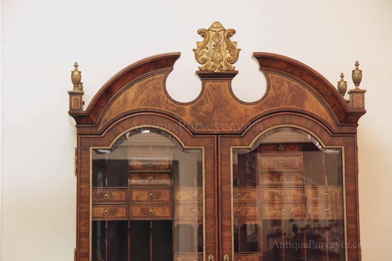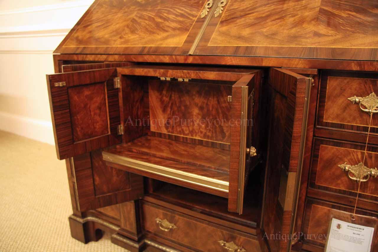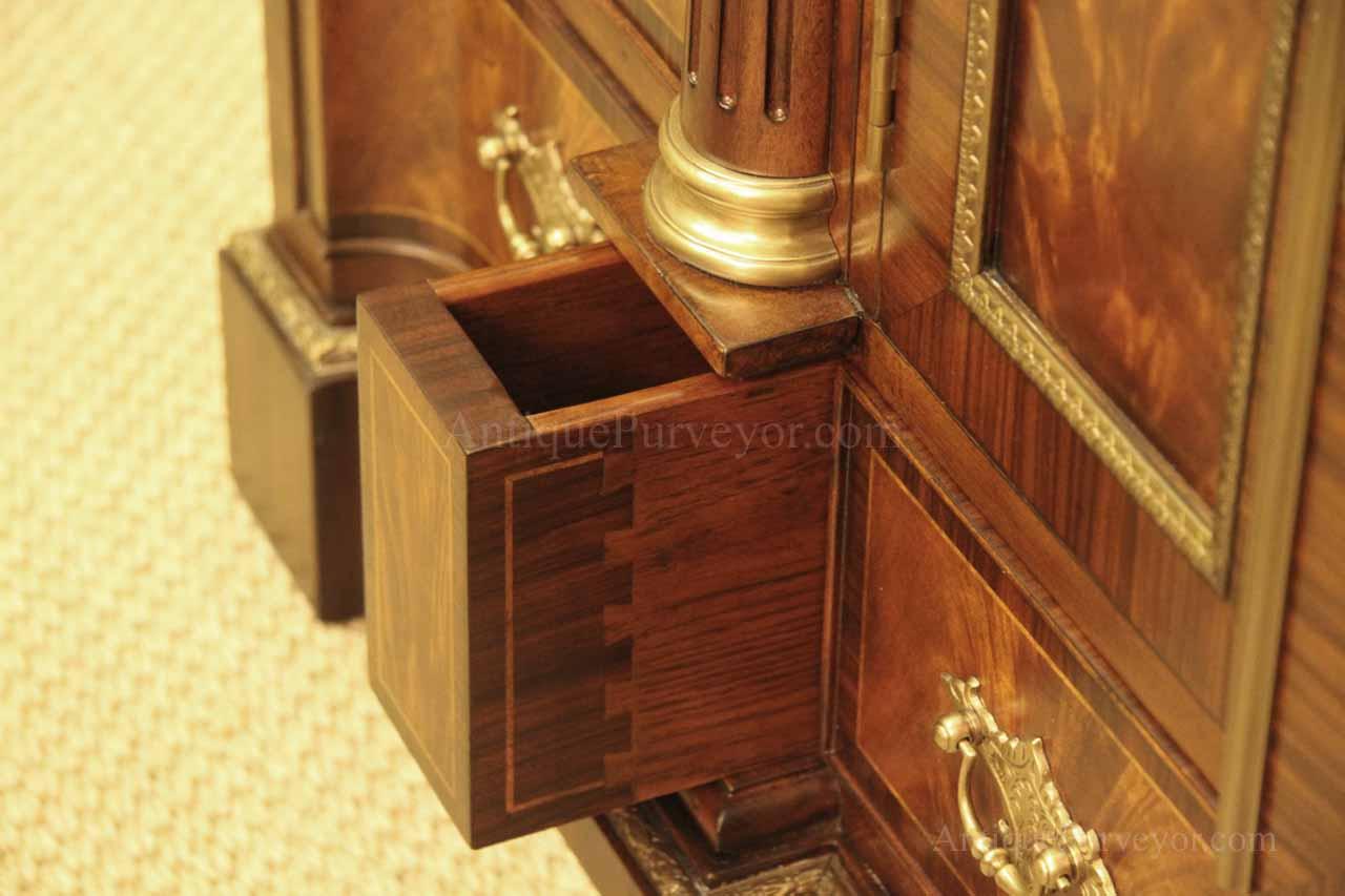 Luxurious mahogany secretary desk with over 45 drawers and 19 pigeon holes. This desk is 900 pounds! Every drawer is dovetailed, even the smallest drawers within the cabinet are tongue and groove. This secretary desk was manufactured by skilled artisans with traditional methods and it is a high-end 18th century antique reproduction built for a luxurious estate, stately home, grand foyer or historic site. This desk is loaded with details. Desk is made from mahogany solids and fancier rosewood and flame mahogany Veneers. Desk has architectural brass cornices and gilt crest above two locking glass doors which enclose 45 drawers and 19 pigeon holes. Below the glass case is an opening slant lid desk with leather inset pull-out trays. The bottom of cabinet has two more locking doors in front of many secretive compartments which traditional secretaries are known for.